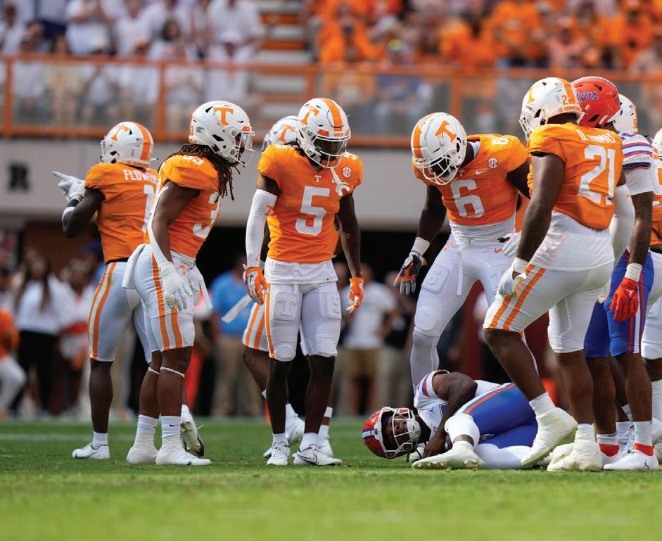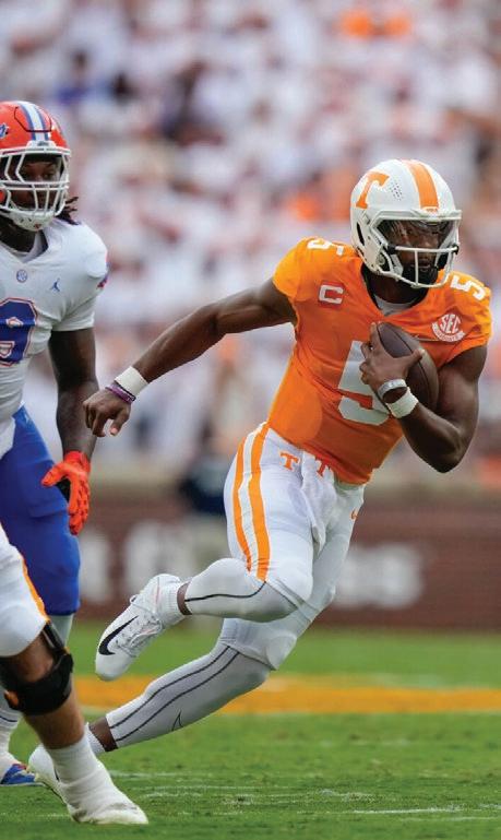 Quarterback Hendon Hooker No. 5 of the Ten nessee Volunteers rushes past rival Florida on Sept. 24, 2022. Nolan Keesee / Contributor Wide Receiver Jimmy Holiday No. 6 of the Tennessee Volunteers moves swiftly passedthe Florida Gators during the rival game. Nolan Keesee / Contributor The defense of the Tennessee Volunteers sworm a offensive Florida player during the game between the Florida Gators and the Tennessee Volunteers at Neyland Stadium. Nolan Keesee / ContributorFor the first time since 2016, Tennessee is ranked inside the top 10. The no. 8 ranking is the eighth time the Vols have been in the top 10 this century, and is their highest ranking since 2006.