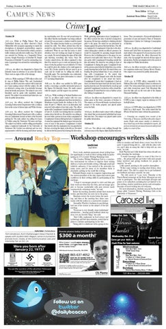 Crime Log October 20 3:33 a.m. While at Phillip Fulmer Way and Cumberland Avenue, an officer observed a black Oldsmobile with occupants appearing to match the descriptions of attempted armed-robbery suspects from October 19. He observed the vehicle commit a traffic violation and affected a traffic stop. The driver was arrested for Driving on a Suspended Driver License, Simple Possession of Schedule IV, Simple Possession of Schedule VI, and for outstanding warrants. A passenger was arrested for outstanding warrants. 3:39 a.m. An officer was dispatched to Sigma Chi fraternity house in reference to an active fire alarm. There were no signs of fire or fire damage. 4:00 a.m. While assisting a UTPD officer with a traffic stop at Phillip Fulmer Way and Cumberland Avenue, an officer came into contact with a male subject. Upon making contact with the subject, the officer detected a strong odor of an alcoholic beverage about his breath and person. The subject’s eyes were bloodshot and he spoke with mumbled, slurred speech. The subject was arrested and taken into custody for public intoxication. 4:10 p.m. An officer assisted the Collegiate Licensing Enforcement Department with a confiscation on the corner of James Agee and White Avenue. 4:35 p.m. An officer assisted the Collegiate Licensing Enforcement Department with a confiscation on Cumberland Avenue in front of the Krystal’s parking lot. The male subject was selling two types of T-shirts using the Tennessee Vol name and logo. The subject was told he could be selling merchandise using a registered trademark by the University of Tennessee. Mr. Crocker was reluctant and was very argumentative with the licensing staff about turning
