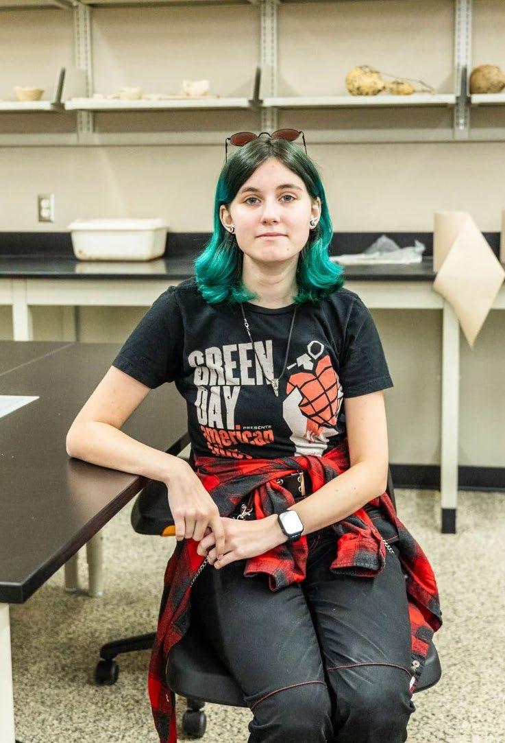 Junior anthropology student Emrys Peterson inside Tamar Shirinian’s former ANTH 426 classroom in Strong Hall. Monday, Nov. 17, 2025. Jayden Randolph/The Daily Beacon