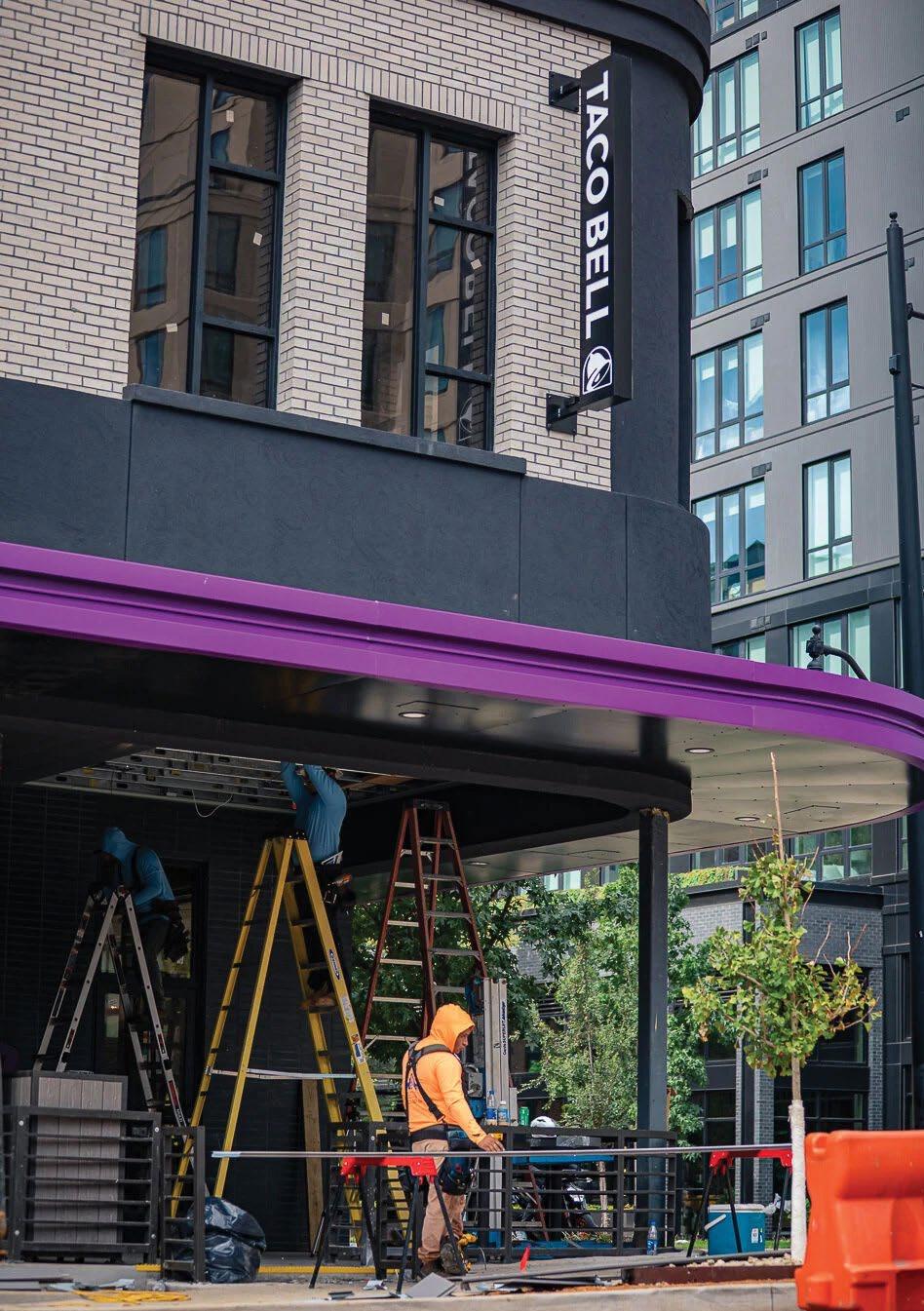 “With its unique location — designed to serve students and local business foot traffic — parking is limited, side streets are tight, and logistics for construction vehicles, large truck deliveries, and heavy foot traffic are challenging. Thankfully, our development team and vendors adapted quickly, finding creative solutions to keep construction moving despite limited access to the site,” Dorris said.