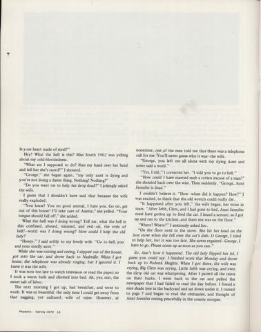 Is your heart made of steel?” noontime, one of the men told me that there was a telephone Hey! What the hell is this? Miss South 1902 was yelling call for me. You’ll never guess who it was-the wife. about my cold-bloodedness. “George, you left me all alone with my dying Aunt and “What am 1 supposed to do? Run my hand over her head never said a word.” and tell her she’s cured?” 1 shouted. “Yes, 1 did,” 1 corrected her. “1 told you to go to hell.” “George,” she began again, “my only aunt is dying and “How could 1 have married such a rotten excuse of a man!” you’re not doing a damn thing. Nothing! Nothing!” she shouted back over the wire. Then suddenly, “George, Aunt “Do you want me to help her drop dead?” 1 jokingly asked Jennifer is dead.” the wife. I couldn’t believe it. “How-when did it happen? How?” I I guess that 1 shouldn’t have said that because the wife was excited, to think that the old wretch could really die. really exploded. “It happened after you left,” the wife began, her voice in “You louse! You no good animal, I hate you. Go on, get tears. “After Jebb, Clem, and I had gone to bed. Aunt Jennifer out of this house! I’ll take care of Auntie,” she yelled. “Your must have gotten up to feed the cat. I heard a scream, so I got tongue should fall off,” she added. up and ran to the kitchen, and there she was on the floor.” What the hell was I doing wrong? Tell me, what the hell in “Where? Where?” I anxiously asked her. this confused, abused, misused, and evil-oh, the evils of “On the floor next to the stove. She hit her head on the hell!—world was I doing wrong? How could I help the old iron stove when she fell over the cat’s dish. O George, I tried lady? to help her, but it was too late. She never regained—George, I “Honey,” I said softly to my lovely wife. “Go to hell, you have to go. Please come up as soon as you can.” and your smelly aunt. ” While she was ranting and raving, I slipped out of the house, So, that’s how it happened. The old lady flipped her lid, I got into the car, and drove back to Nashville. When I got guess you could say. I finished work that Monday and drove home, the telephone was already ringing, but I ignored it. I back up to Podunk Heights. When I got there, the wife was knew it was the wife. crying. Big Clem was crying, Little Jebb was crying, and even It was now too late to watch television or read the paper; so the dirty old cat was whimpering. After I patted all the criers 1 took a warm bath and climbed into bed. Ah, yes; rest, the on their backs, 1 went back to the car and pulled the sweet salt of labor. newspaper that I had failed to read the day before. 1 found a The next morning I got up, had breakfast, and went to nice shade tree in the backyard and sat down under it. I turned work. It was so beautiful: the only time 1 could get away from to page 7 and began to read the obituaries, and thought of that nagging, yet cultured, wife of mine. However, at Aunt Jennifer resting peacefully in the county morgue. Phoenix: