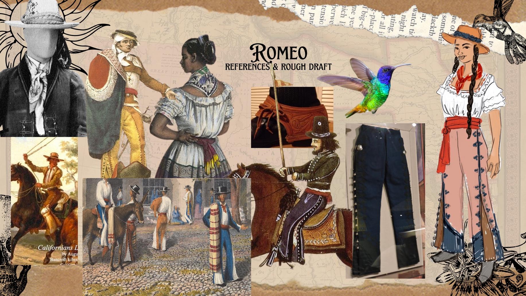 The central conflict of the play is between the Montagues, a Californio vaquero family of Spanish and Indigenous descent, and the Capulets, proud Mexicans who are eager to assimilate into the newly dominant American culture. The Montagues are visibly ranchers, clad in side-fastened calzoneras, leather botas, and shoulder -swept serapes –the practical attire of horse-riders. The Capulets retain vestiges of their Mexican heritage in their clothing but are heavily influenced by American Victorian-era silhouettes.