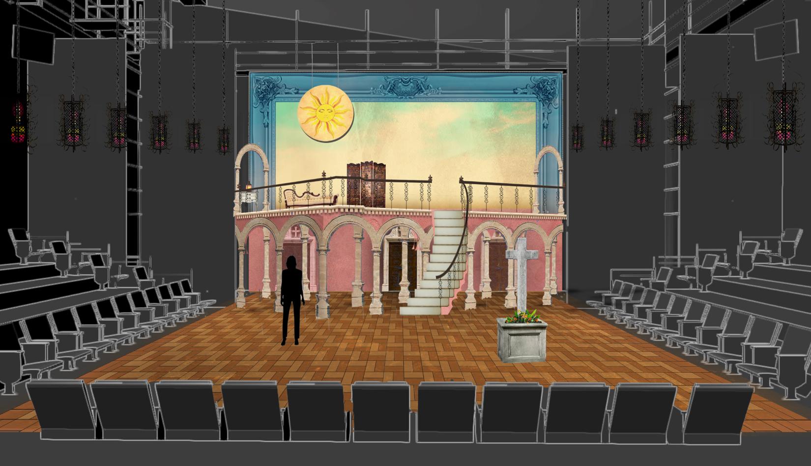 A rendering of Alex Rockey’s set for Romeo y Juliet in the Oscar G. Brocket Theatre. Renderings such as this give the director and the cast a clear image of the set throughout the rehearsal process, as the set is being built.
