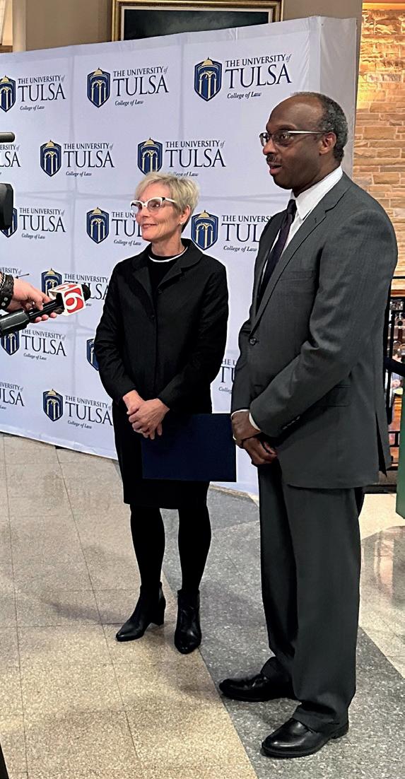 16 Leslie Brier (JD ’07), president of the TU Law Alumni Association, and Dean Oren Griffin address local media at the presentation of “Greenwood Imagine,” a three-panel art installation by local artist Ebony Iman Dallas. The artwork was displayed in the law school during February in commemoration of Black History Month.