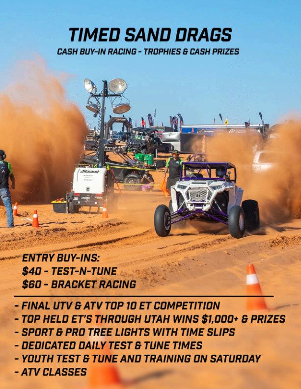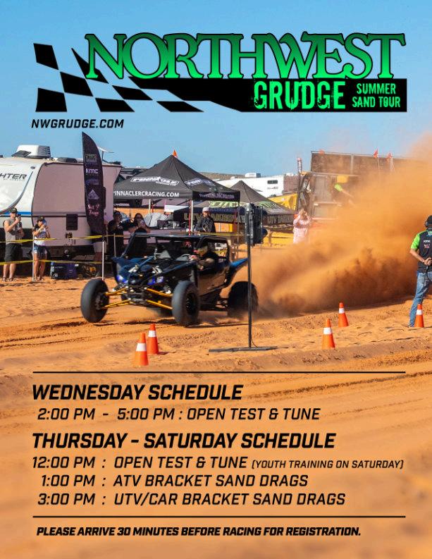 New for 2024, we’ve partnered with Northwest Grudge and have opened our sand drag strip to their Summer Sand Tour! This means that we have both daily UTV Takeover sand drag racing followed by daily NW Grudge sand drag racing. You can participate in time-slipped Bracket style racing whether you’re in a UTV, Sand Rail, ATV, etc! There are open test and tune times, cash and prize awards, multiple classes, and on this last stop of the 2024 Tour, NW Grudge will be crowning the Top ET drivers for $1,000 in cash and prizes! Please see the schedule for times and classes, and Pg 36 for more info and links.