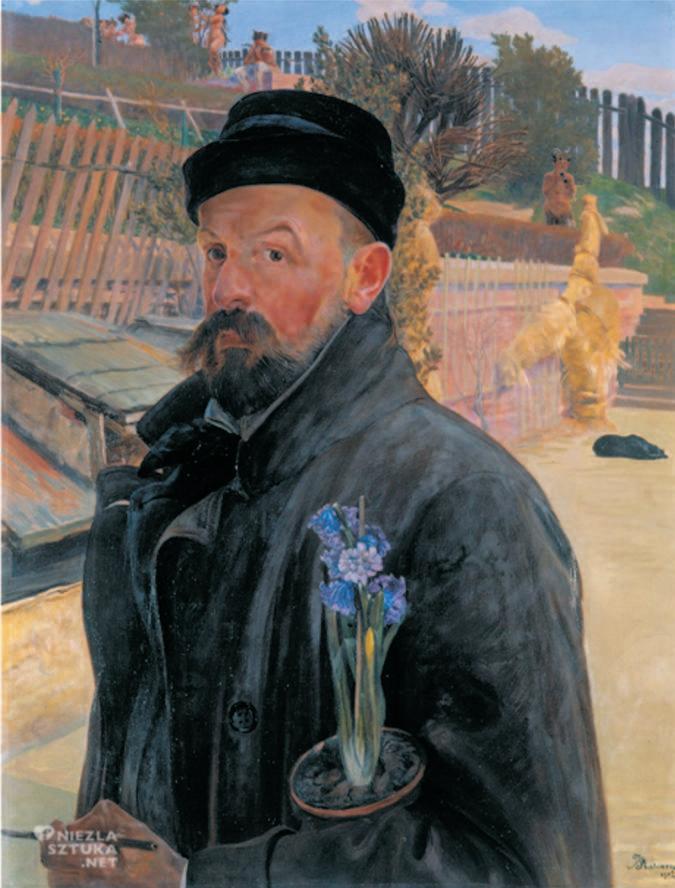 i znajduje się w Galerii Rogalińskiej Muzeum Narodowego w Poznaniu. Przedstawia półpostać artysty spoglądającego na widza. Ubrany jest w czarny płaszcz i zimową jeszcze czapkę. Lewą ręką przyciska do swego boku doniczkę z niebiesko-昀椀oletowym hiacyntem, a w dłoni trzyma pędzel.