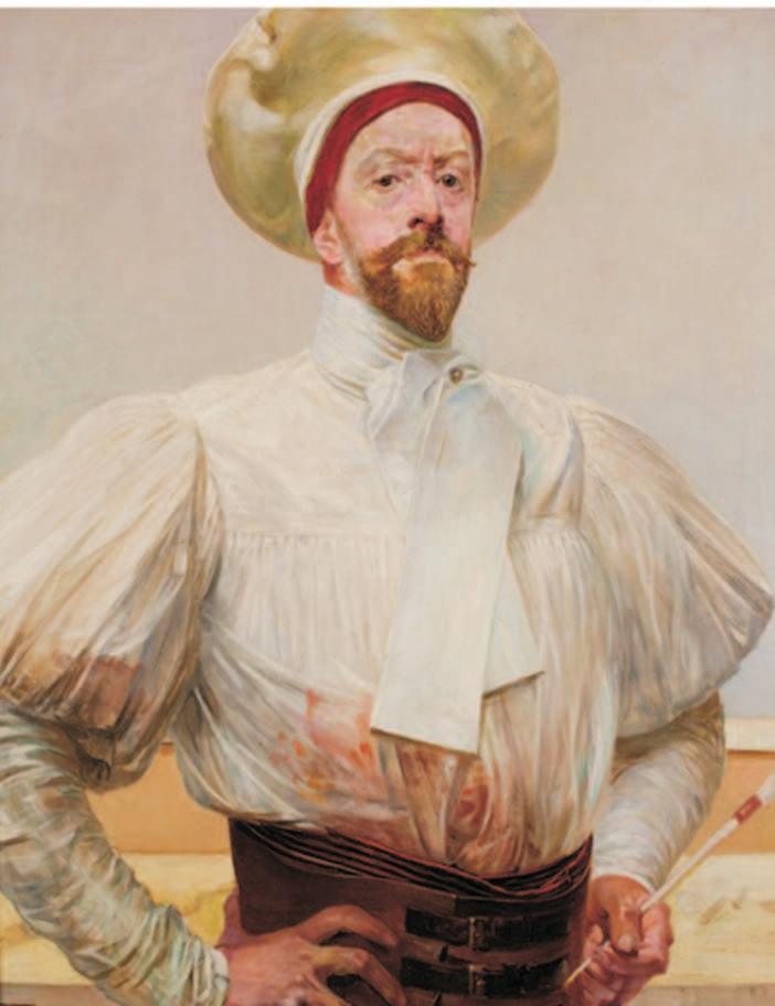 Malczewski prezentuje się w nim w półpostaci, ubrany w białą damską bluzkę z bu昀椀astymi rękawami i wiązanym kołnierzem ozdobionym złotą spinką oraz fantazyjny biały beret z ciasno opinającym skronie czerwonym otokiem. Biodra opasuje skórzany szeroki góralski pas, nałożony na wielobarwny pas tkaniny. Uroczysta poza, z prawą ręką wspartą na biodrze, lewą prezentującą pędzel jako atrybut powołania malarskiego, nadaje portretowi o昀椀cjalny, choć nie pozbawiony groteski charakter. Obraz, jak wszystkie dzieła symbolistyczne, nie poddaje się jednoznacznej interpretacji, można jedynie próbować odczytać jego znaczenie.„
