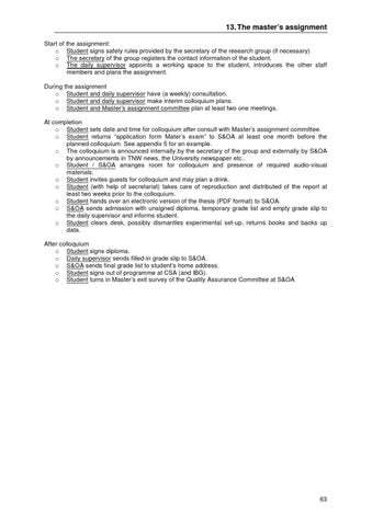 During the assignment o Student and daily supervisor have (a weekly) consultation. o Student and daily supervisor make interim colloquium plans. o Student and Master’s assignment committee plan at least two one meetings. At completion o Student sets date and time for colloquium after consult with Master’s assignment committee. o Student returns “application form Mater’s exam” to S&OA at least one month before the planned colloquium. See appendix 5 for an example. o The colloquium is announced internally by the secretary of the group and externally by S&OA by announcements in TNW news, the University newspaper etc.. o Student / S&OA arranges room for colloquium and presence of required audio-visual materials. o Student invites guests for colloquium and may plan a drink. o Student (with help of secretariat) takes care of reproduction and distributed of the report at least two weeks prior to the colloquium. o Student hands over an electronic version of the thesis (PDF format) to S&OA. o S&OA sends admission with unsigned diploma, temporary grade list and empty grade slip to the daily supervisor and informs student. o Student clears desk, possibly dismantles experimental set-up, returns books and backs up data. After colloquium o Student signs diploma. o Daily supervisor sends filled-in grade slip to S&OA. o S&OA sends final grade list to student’s home address. o Student signs out of programme at CSA (and IBG). o Student turns in Master’s exit survey of the Quality Assurance Committee at S&OA