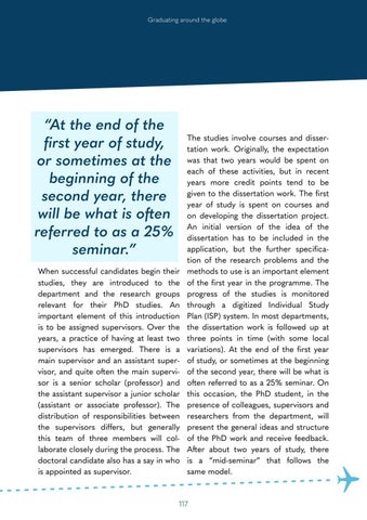 “At the end of the first year of study, or sometimes at the beginning of the second year, there will be what is often referred to as a 25% seminar.” When successful candidates begin their studies, they are introduced to the department and the research groups relevant for their PhD studies. An important element of this introduction is to be assigned supervisors. Over the years, a practice of having at least two supervisors has emerged. There is a main supervisor and an assistant supervisor, and quite often the main supervisor is a senior scholar (professor) and the assistant supervisor a junior scholar (assistant or associate professor). The distribution of responsibilities between the supervisors differs, but generally this team of three members will collaborate closely during the process. The doctoral candidate also has a say in who is appointed as supervisor.
