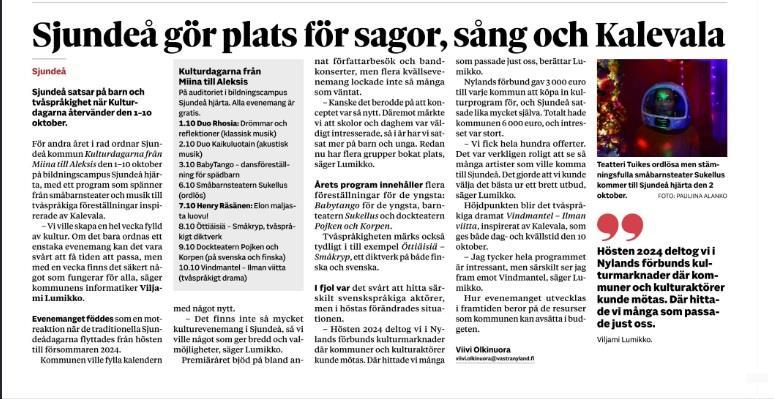 • Järjestimme Uudenmaan liiton ostorahan avulla Kulttuuripäivät Miinasta Aleksikseen lokakuun 2025 alussa.