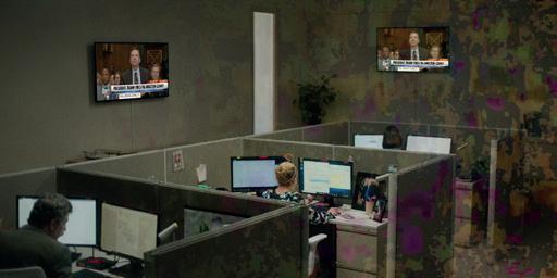 This liberty is clear from the film’s very first shot — especially if we pay forensic attention to the split-second way it ends. Satter statically frames a working-day tableau in the manner of Chantal Akerman, Kitty Green, or Cindy Sherman in Office Killer (1997): a row of cubicles, each person working on their computer, Reality in the centre of the image … but with the droning voices of the Fox News channel (reporting specifically on Trump ’s firing of FBI Director James Comey), beamed on ubiquitous monitors on the office walls leading-in before the image. It’s a neat encapsulation of a central theme that will be explicitly discussed by the characters later: the ceaseless barrage of media garbage that pushed Reality to her whistleblowing action.