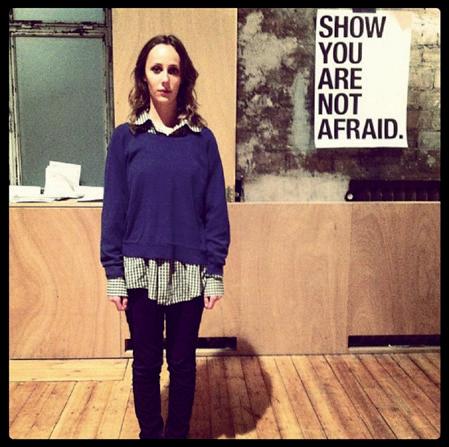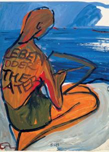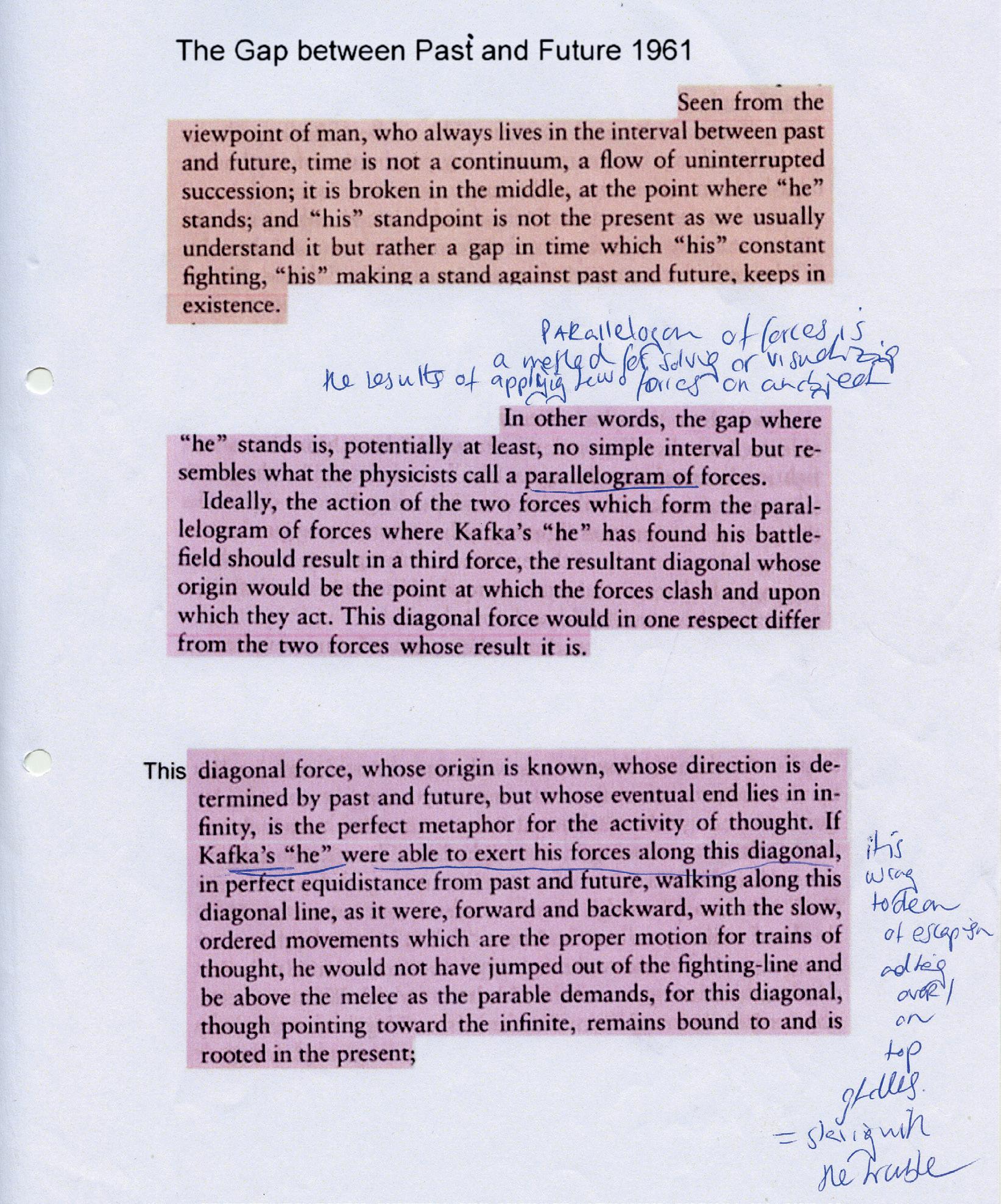 timmtheit (ob sie zurück oder nach vorne schauen vermag ich nicht zu sagen) blickenden Gesichter studiert. Ihre Falten sind Spuren im Sand, aber der Wind trägt die Spuren mit dem Sand weiter. Ich habe der kratzigen, nach Präzision lechzenden Stimme Hannah Arendts gelauscht, auf deren Konzept einer diagonalen Wirkkraft der Film und sein Titel basieren. Es ist eine von Franz Kafka inspirierte Metapher für das Verbindende zwischen dem, was war und dem, was sein wird. Kafka beschreibt in einer Geschichte zwei an ihm nagende Wirkkräfte, eine, die ihn zurückzieht und eine, die ihn nach vorne drängt. Er will sich befreien, sodass die beiden Kräfte, die sich letztlich auch gegenseitig bekämpfen, aufeinander losgingen, während er dem ganzen als Schiedsrichter beiwohnen könne. Arendt geht es um das aus diesem inneren Ringen Entstehende, was uns ins Denken und ins Handeln bringt. Ich habe den spielerischen, sich befreienden und doch verlorenen Bewegungen Claire Vivianne Sobottkes beigewohnt, die hier eine Idee von Arendt spielt, das heißt, sich immer wieder neu zusammensetzende Ansätze zu einer RePräsentation der deutschen Philosophin und deren eigener Fluchtgeschichte als Jüdin. In den performativen Bewegungen Sobottkes wird die Kraft sichtbar, die es braucht, um denken zu können. Sie spielt Arendt nicht, sie leiht ihrem Geist einen Körper. Dieser Körper changiert zwischen dem, was gesagt werden kann und dem, was uneindeutig bleibt. Ein Körper, der sich immer neu zusammensetzt und immer weiter zerfällt.