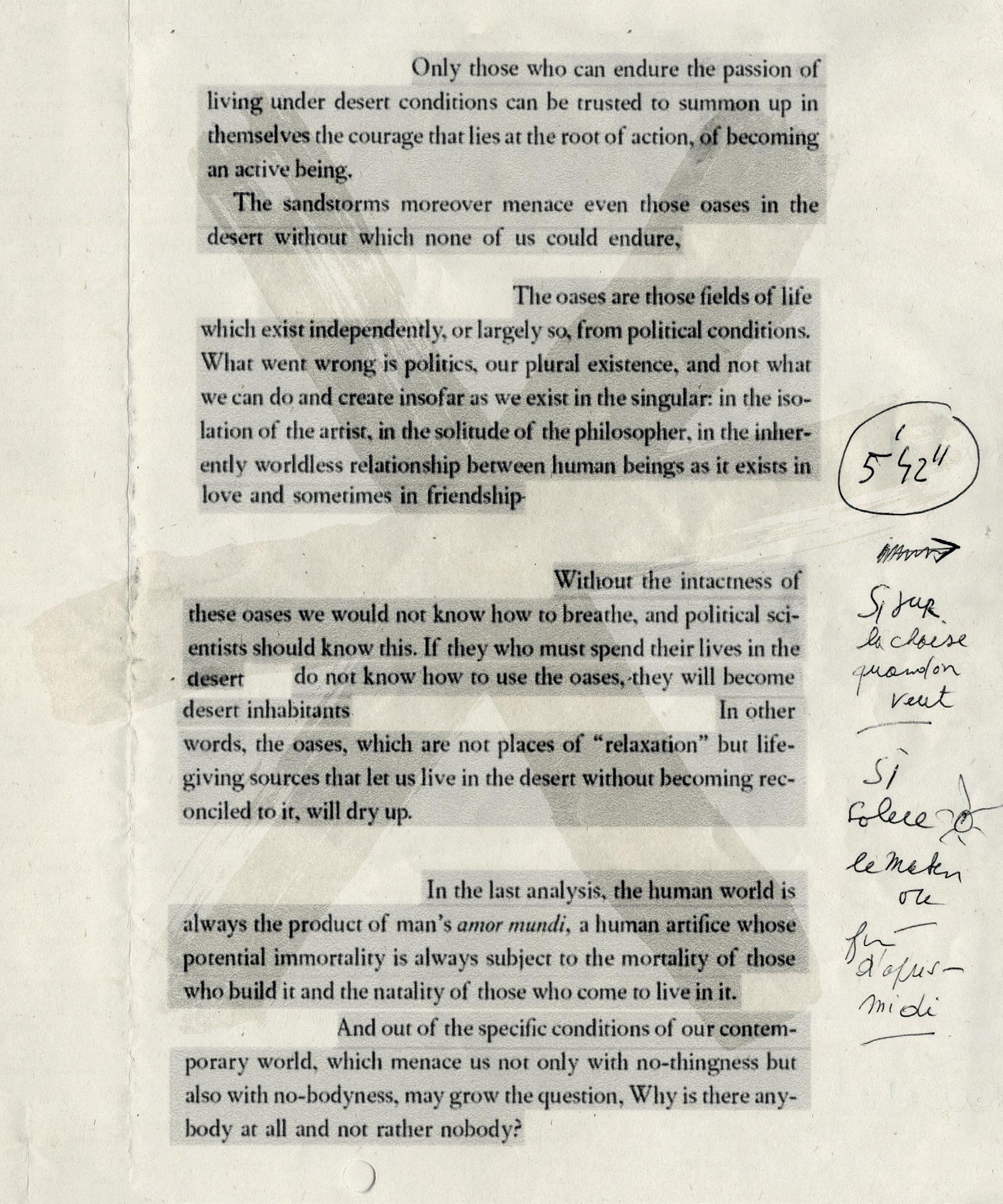 verlieren. Das ist eine Tatsache, die sich in der endlosen Wiederholung der gleichen politischen und gesellschaftlichen Verbrechen äußert. Es ist wohl so, dass es einen Sieger gibt im Kampf zwischen Vorwärtsstrebenden und Rückwärtsblickenden. Walter Benjamin hat ihn in Paul Klees Engel der Geschichte entdeckt, zurück bleibt ein Trümmerhaufen, bei dem man längst nicht mehr weiß, was unter den obersten Schichten liegt. Ich befürchte, dass ich mit diesem Gefühl oder fehlenden Gefühl, das man als Ohnmacht oder Orientierungslosigkeit beschreiben könnte, nicht allein bin. Natalia Ginzburg schrieb von einer in ihr entstandenen Notwendigkeit, sich vom Weltgeschehen abzuwenden. Das wäre ihre Art, sich der Welt zuzuwenden. Aber sie fühle sich sehr ambivalent damit. Nur scheine ihr alles, was den Menschen heute wichtig wäre, so oberflächlich und falsch. Paul Valéry schrieb einmal: “Wir müssen wieder mehr Elfenbeintürme errichten”. So sehr mir diese Ansätze einleuchten, sie entsprechen nicht der von Arendts Gedanken getragenen Haltung des Films. Statt der Flucht ins Ich, geht es den Filmemacherinnen um ein kollektives Handeln. Statt der Aufgabe, soll eine aus dem Denken entstehende Handlung regieren.