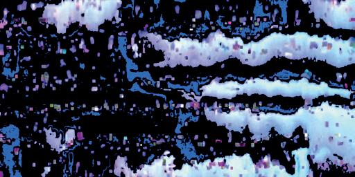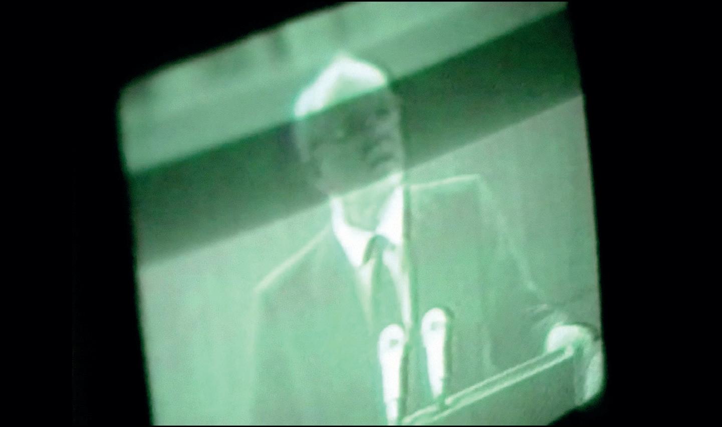 words disappear, but also the bodies of the actors — in a “puff of glitch”. The first time that it happens, well over 30 minutes in, is quite a shock for the spectator. Something that is almost completely invisible on screen has been revealed by Satter: that the glitches are, in part, heavily processed from Fox News images — hence looping back to their prefiguration in the very first shot. Satter refers to this as the film’s “weird resident secret”.