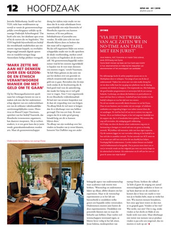12 HOOFDZAAK Jonneke Bekkenkamp, hoofd van het VLH, trekt haar wenkbrauwen op terwijl ze vanuit de geesteswetenschappelijke coworkingspace uitkijkt op de zonnige Oudezijds Achterburgwal. ‘Dat hoeft echt niet, het idealisme spat ervan af bij de starters die we begeleiden.’ Het VLH begeleidt bijvoorbeeld een bedrijf dat tweedehands studieboeken aan een nieuwe eigenaar koppelt, na overlijden desgevraagd iemands digitale sporen wist en wandelervaringen langs Amsterdams heilige plekken vormgeeft.