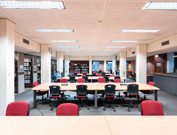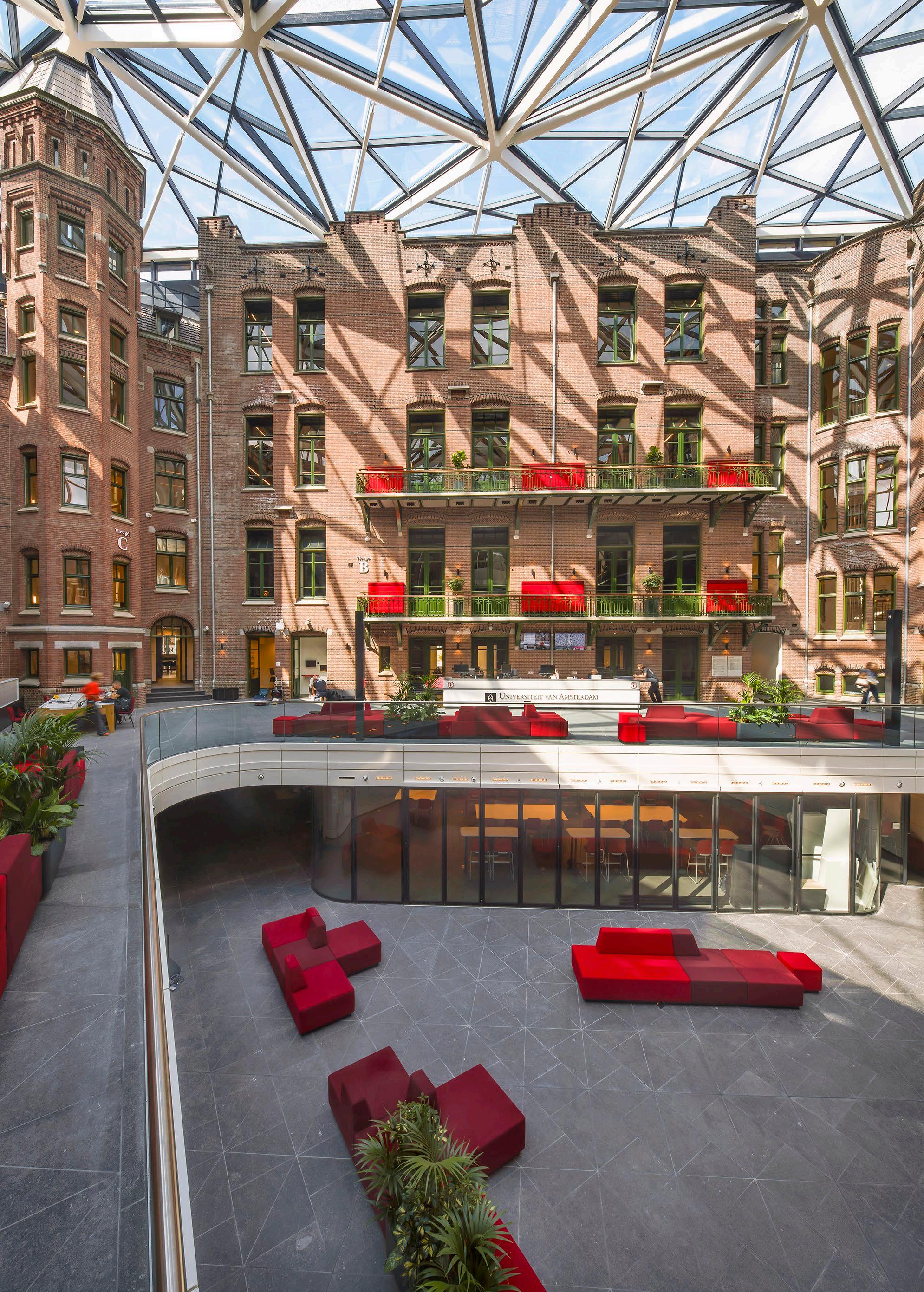 A building that welcomes you with open arms, as impressive as it is inviting: it really does exist. Step through the entry gates and it is love at first sight. Sunlight streams in through the high roof; soft sofas in UvA red invite you to sit down for a moment and look up. The eye‑catcher is the white steel tree structure that fans out into a canopy of steel and glass triangles, ingeniously folded inwards, so that it is invisible from the outside. In this way, the monumental charac ter of the former hospital complex has been preserved, while rain water is collected at the same time – because the new Binnengasthuis Quarter is also as circular and energy‑efficient as possible. From the very start, it was clear that the ambitions were sky‑high. The new University Library was meant to become an open, connecting square of science: a place that invites you to meet one another, but also to do research, to wander, to be surprised and to share new ideas. That goal has been achieved – and then some.