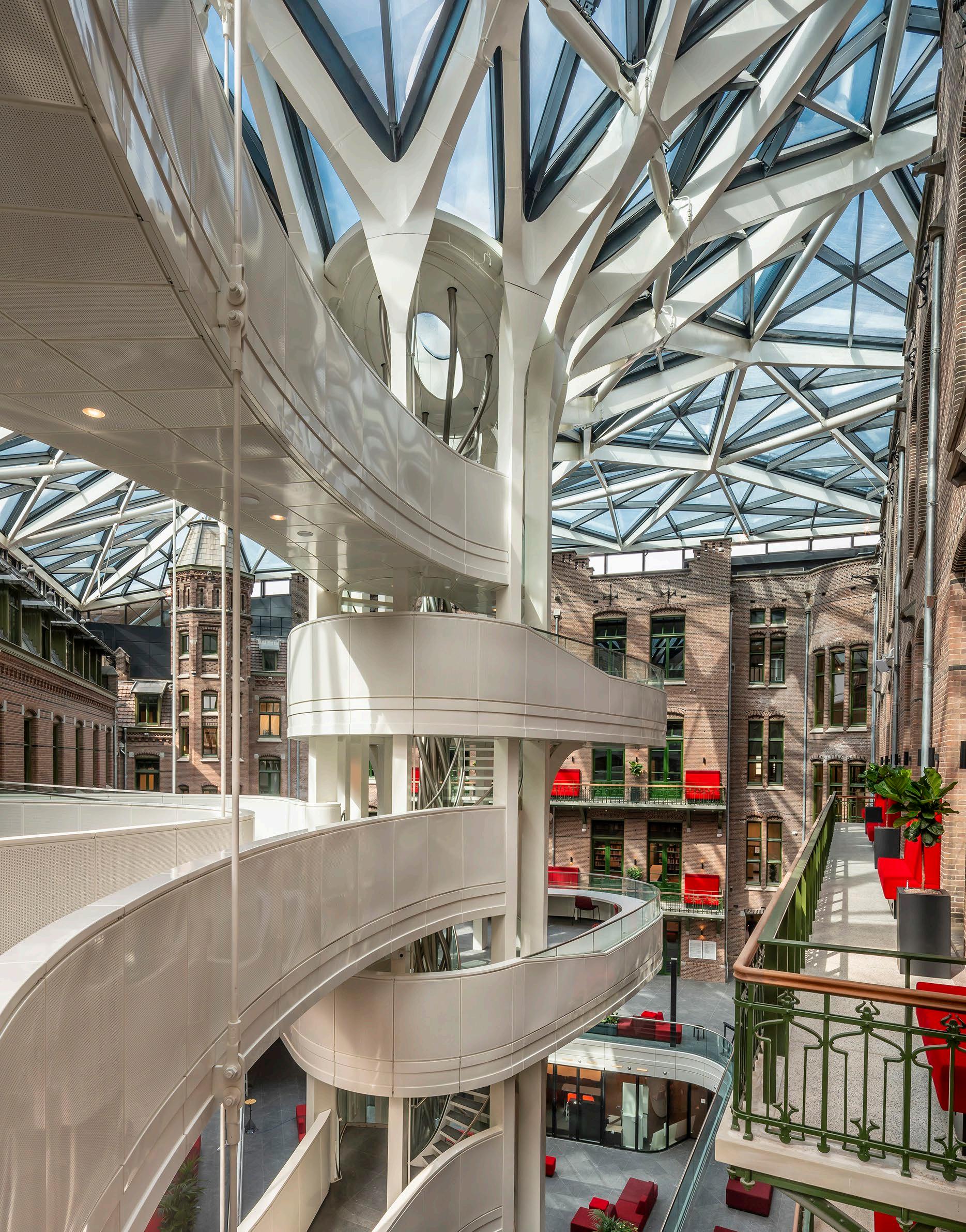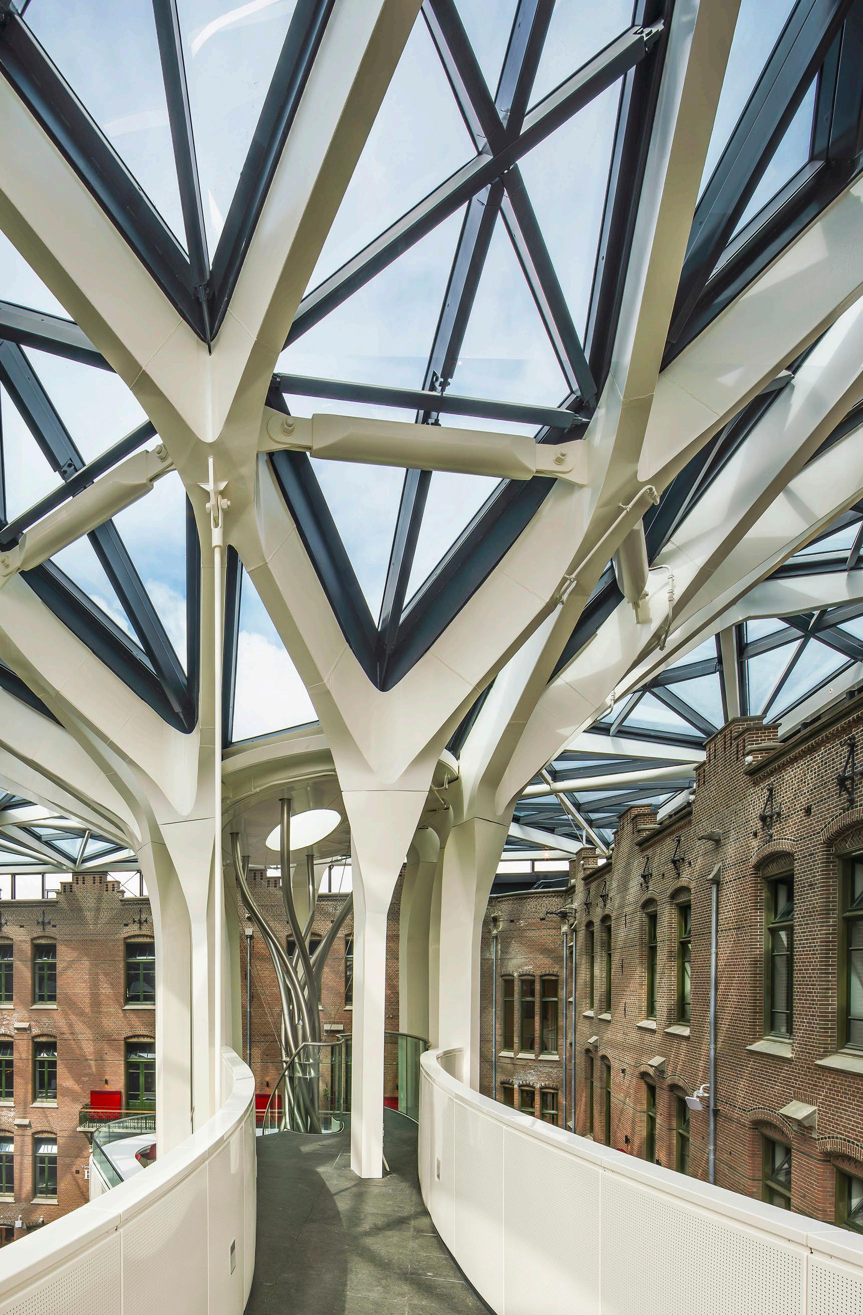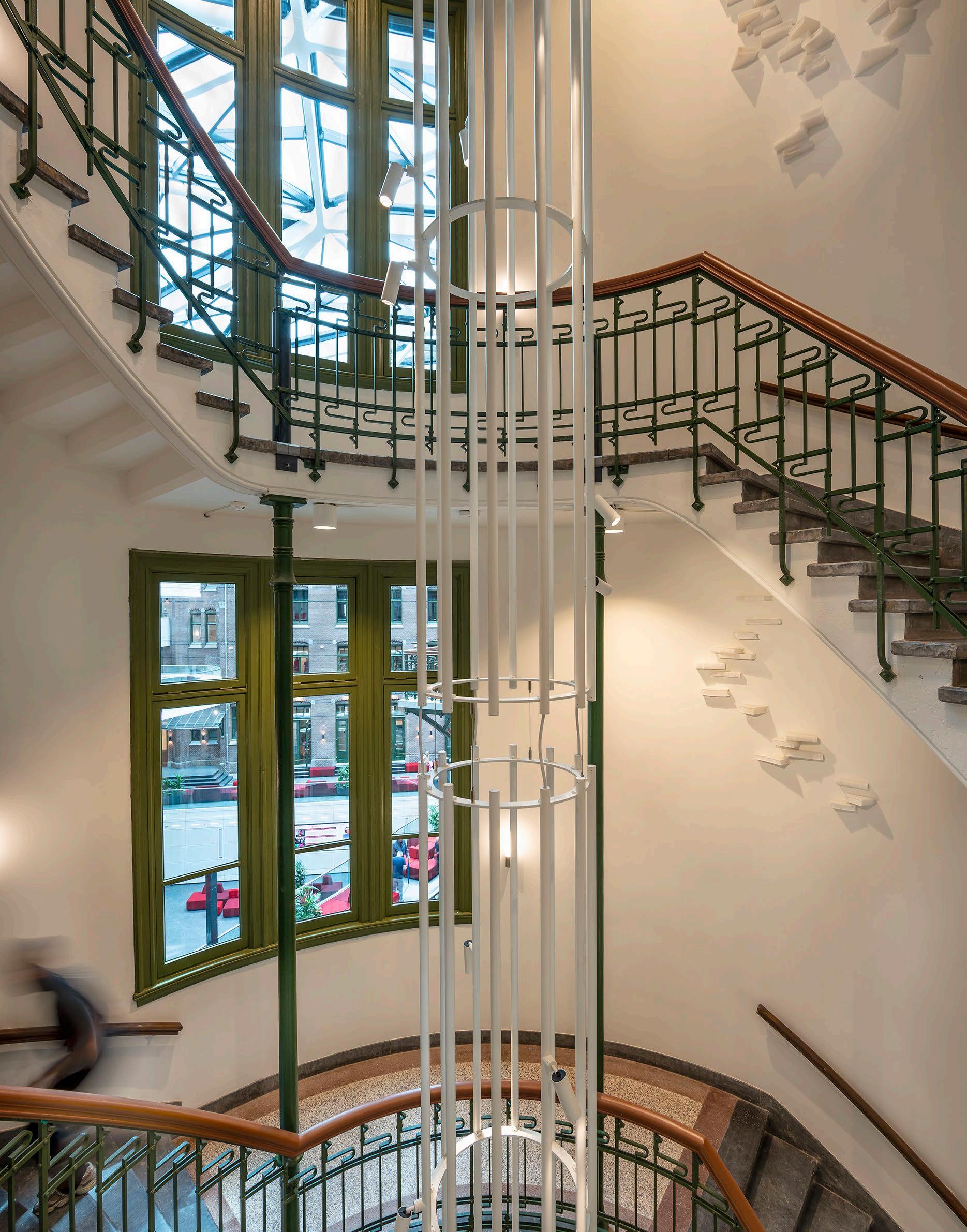 Connecting the three buildings was an architectural brain‑teaser, as all the gutter heights and floor levels were diffe rent. The architects at MVSA also solved this challenge with the steel tree: walkways to the various floors enter at every level and thus create an organic connection. By lowering the atrium at the foot of the tree, it has become possible to hold events there, with visitors comfortably watching from the balustrades above. The circulation desk is also located downstairs.