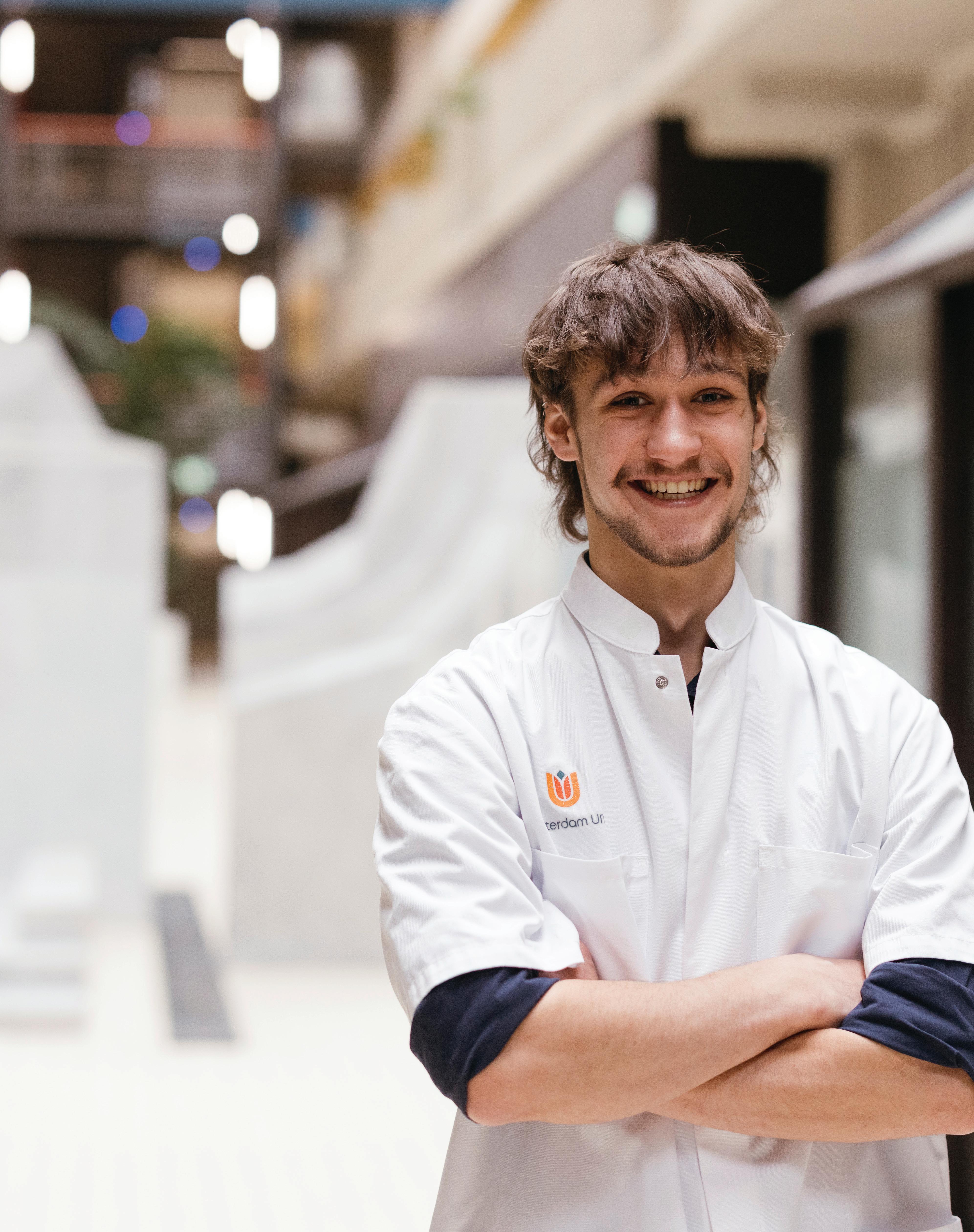 WILLEM VOLKER, a first‑genera‑ tion Philosophy student from an entrepreneurial family, watched the polarisation at the UvA with dismay and wanted to create a platform for a diversity of voices. “The Free Space for Difference is a place where students engage in dialogue with one another – and where Deel de Duif also comes to speak.” Because conversation means connection, especially when you disagree. As student assessor, Willem also repre sents the student voice on the Executive Board. “I want to be there for all my fellow students; they can share their concerns or ideas with me.”