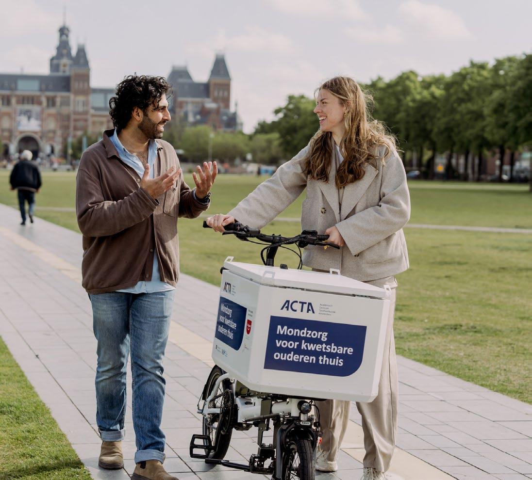 Vulnerable elderly people who are no longer able to visit the dentist themselves are now being visited by ACTA students by cargo bike. They provide free preventive care in order to avoid poor oral health. After a successful pilot, the cargo bike project has become a permanent part of the ACTA dentistry curriculum.