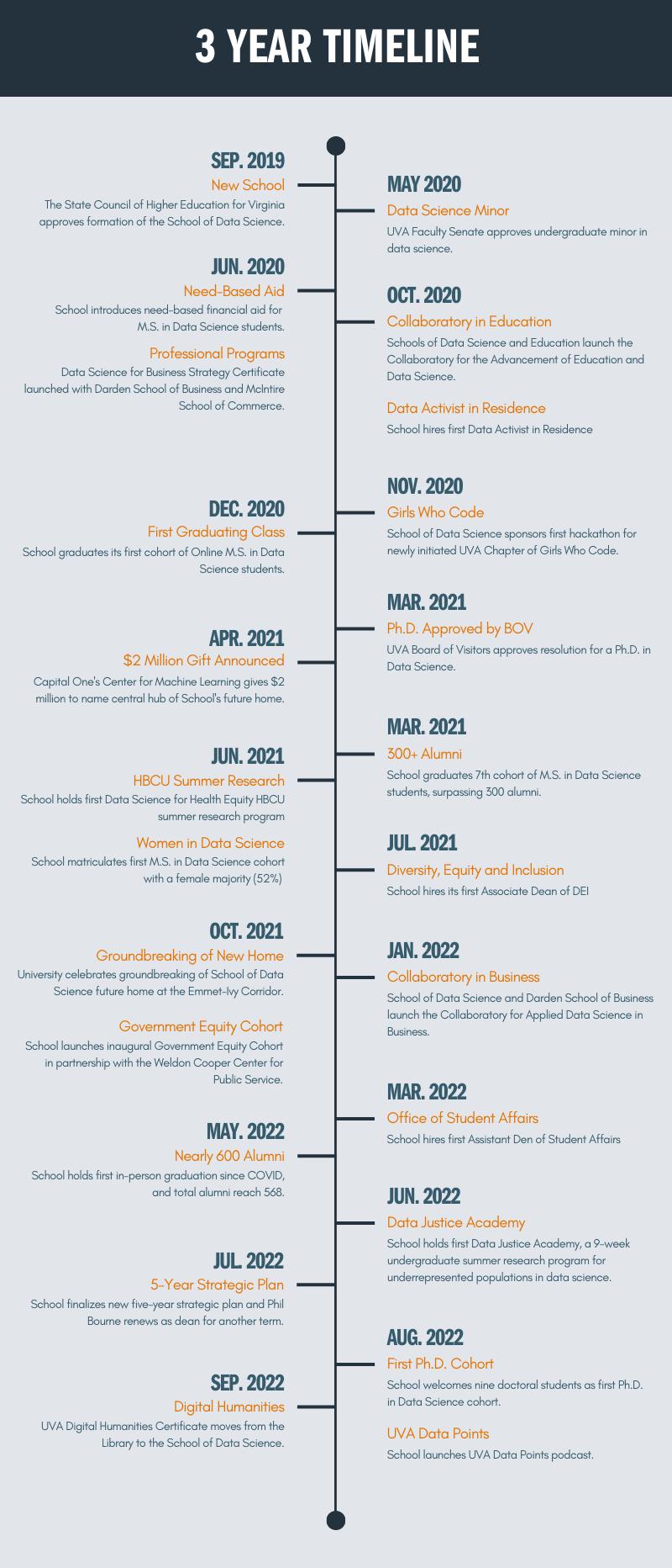 September 2022 marks the School of Data Science’s third birthday as well as the introduction of the institution’s new five-year strategic plan. Since its founding as the newest and twelfth school at the University of Virginia, the School of Data Science has accomplished much and marked multiple milestones over the years. In the last year alone, the School has launched a Ph.D. in Data Science, doubled its teaching and research faculty, built out its administrative infrastructure, broken ground on its future home, approved strategic and inclusive excellence plans, held its inaugural Data Justice Academy, and is about to put forward a new undergraduate degree for University and state approvals.