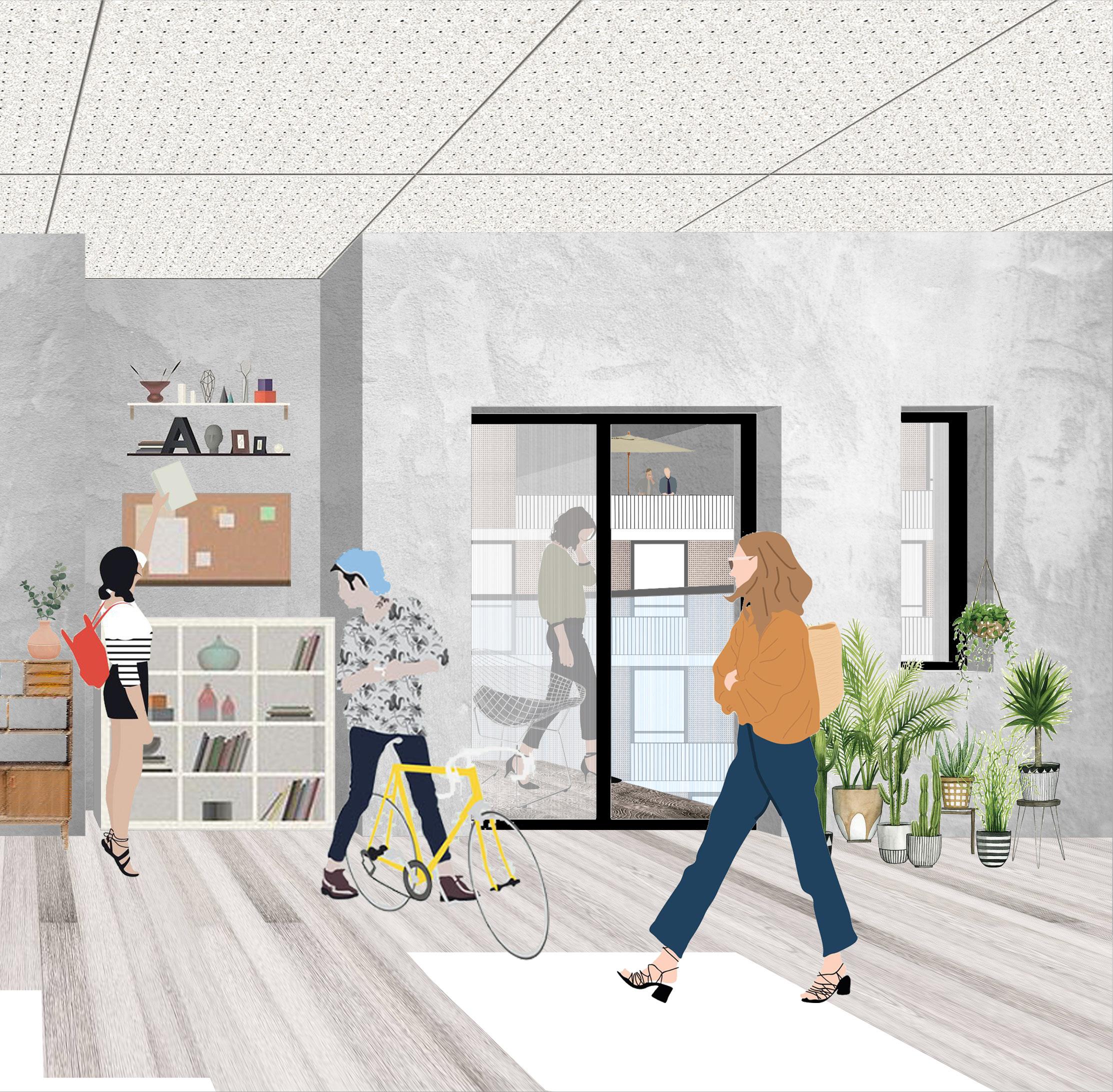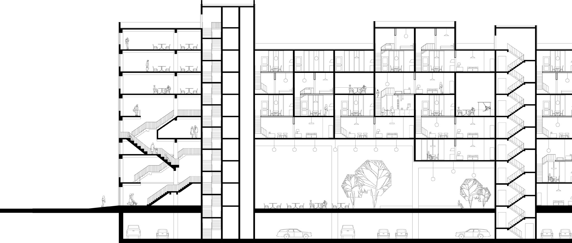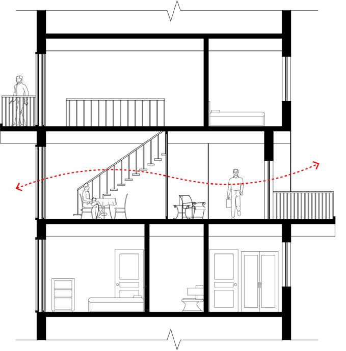Circulation connects between different programmatic zones Balconies face onto interior public street