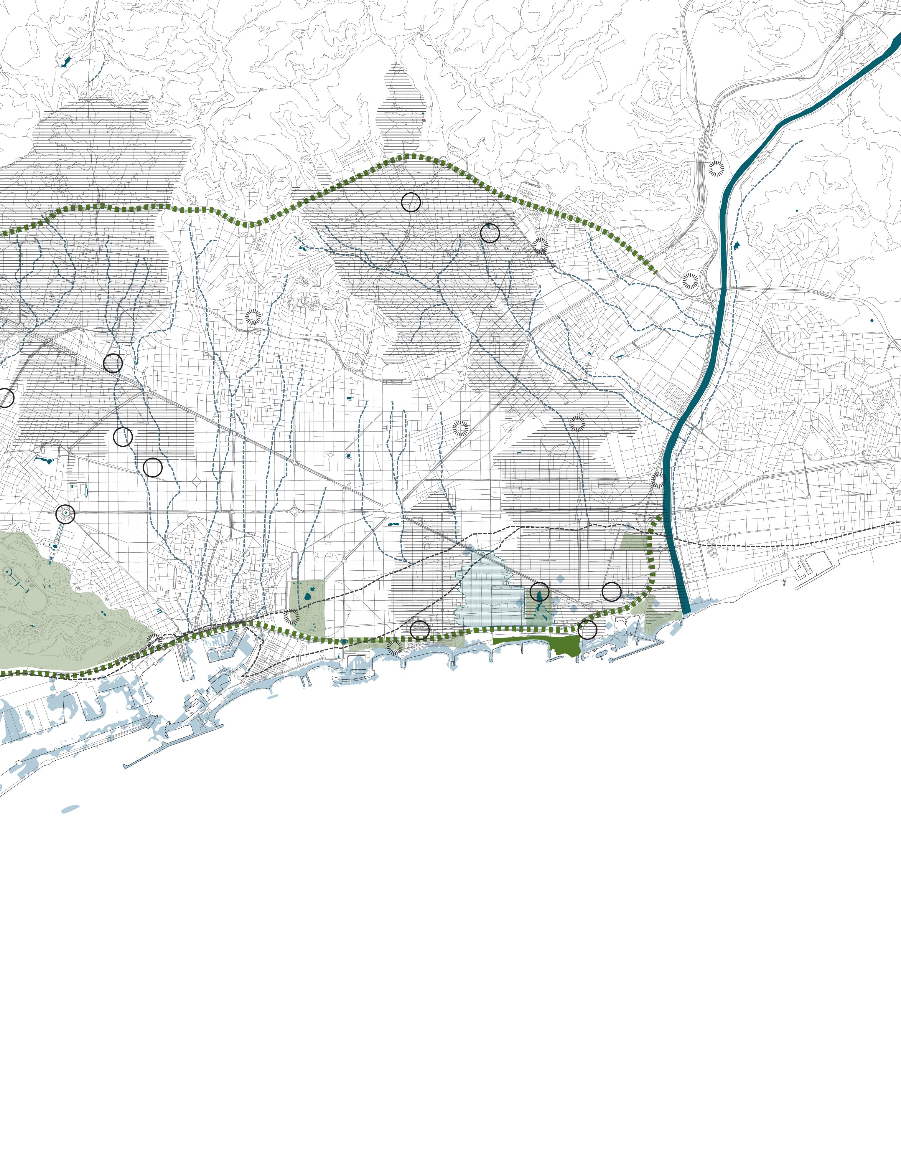 This course will be focused on one of the main historical urban topics of Barcelona. Barcelona is delimited by four main geographic borders. On the North side, the Collserola Mountain defines the biggest parc of the city and at the same time determines the limit of the city with the Valles region. On the East side, the Besos River creates today one of the most important access to the city and marks the division between the cities of Santa Coloma and Badalona. On the West side, the Llobregat river fixes the third natural limit of Barcelona. Finally, on the South side, the beach defines one of the most reviewed and rebuilt frames of the city.