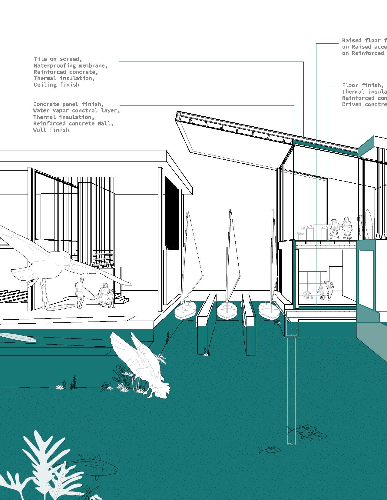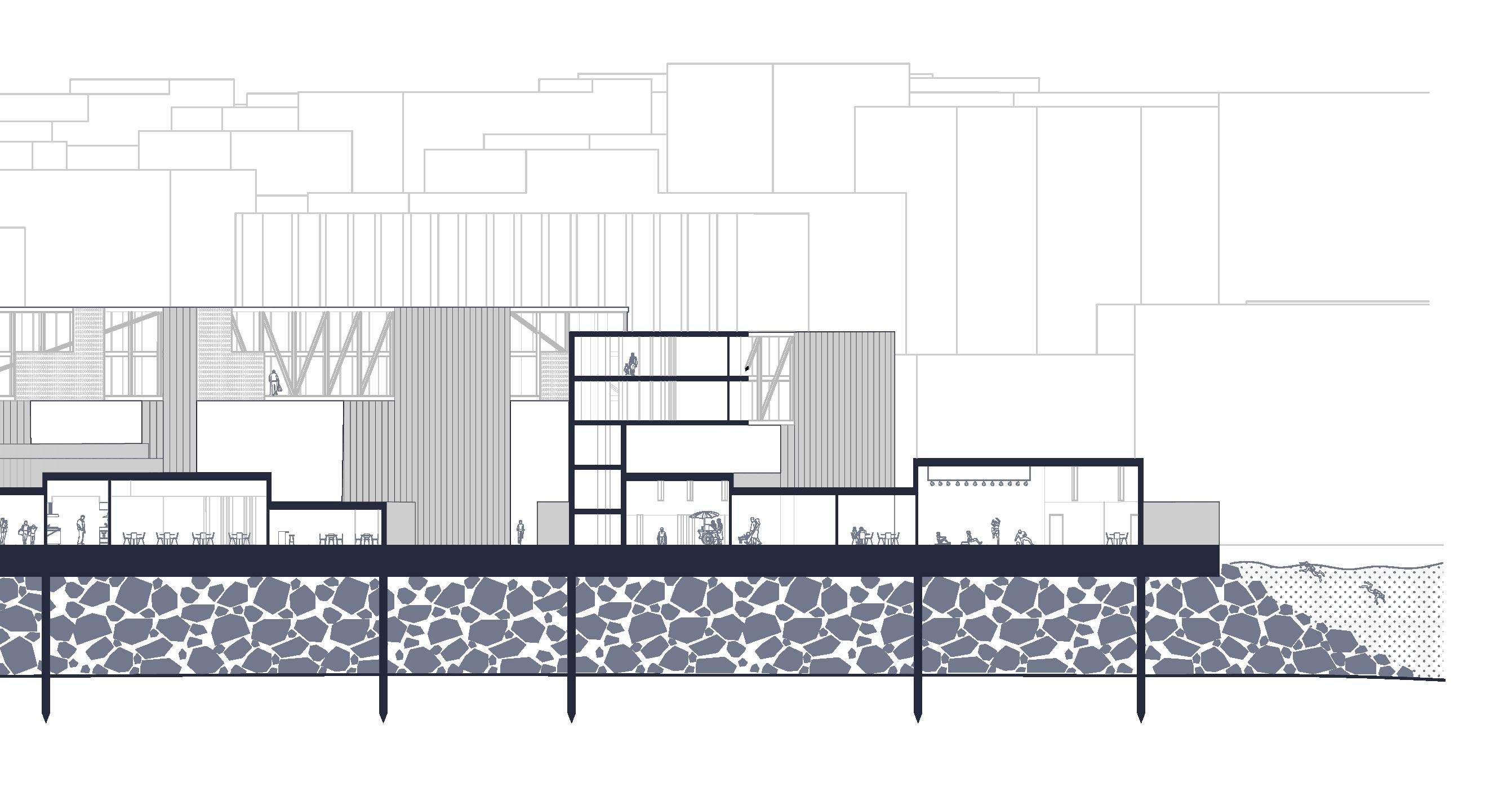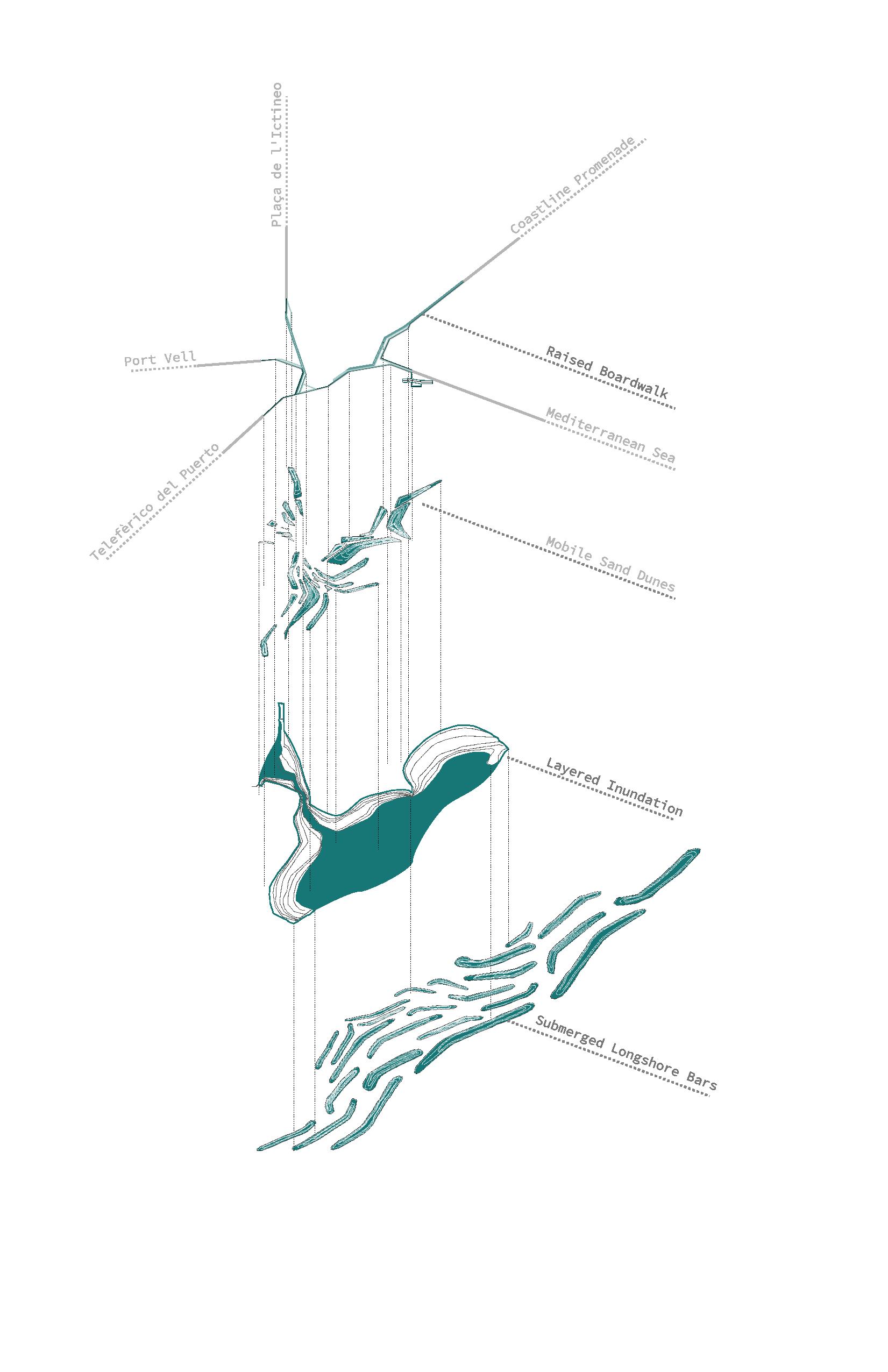 The impact of tourism has caused major tensions between domestic life and tourism which is the main source of income for the city, and La Barceloneta as a beachfront district has been heavily affected. Several apartments have been bought off and advertised (illegally in some cases) as tourist accommodation, sometimes even forcefully so. Additionally, the urban makeup of La Barceloneta is in a state of discontinuity. The strict historic building grid ends abruptly in many cases, leaving pockets of underutilised or underdefined space adjacent to the seafront. The proposal aims at completing and improving the geometric makeup of La Barceloneta through architectural and landscape strategies that tackle both of these urban frictions. A series of modular housing blocks, public program, and tourist accommodation spaces are placed adjacent to the beach. The entire structure is lifted up, allowing the landscape below to respond to potential enironmental phenomena to be caused by sea level rise. Additionally, the strict, narrow section of La Barceloneta is diversified through a series of structures installed on existing buildings.