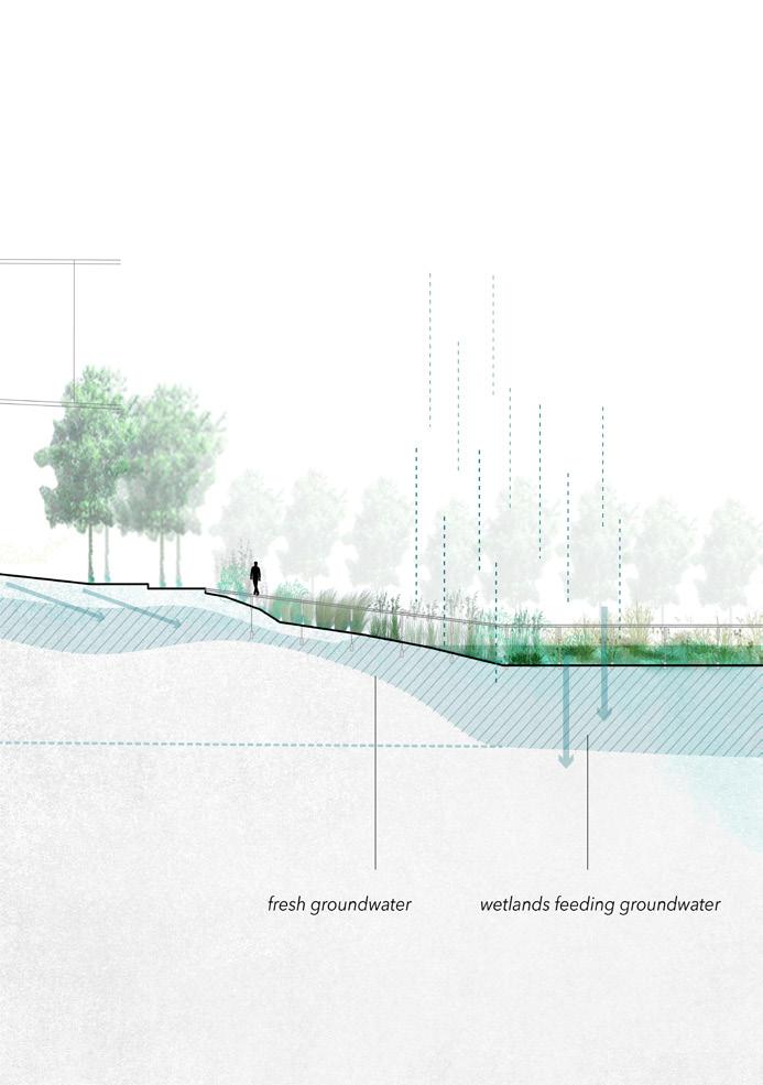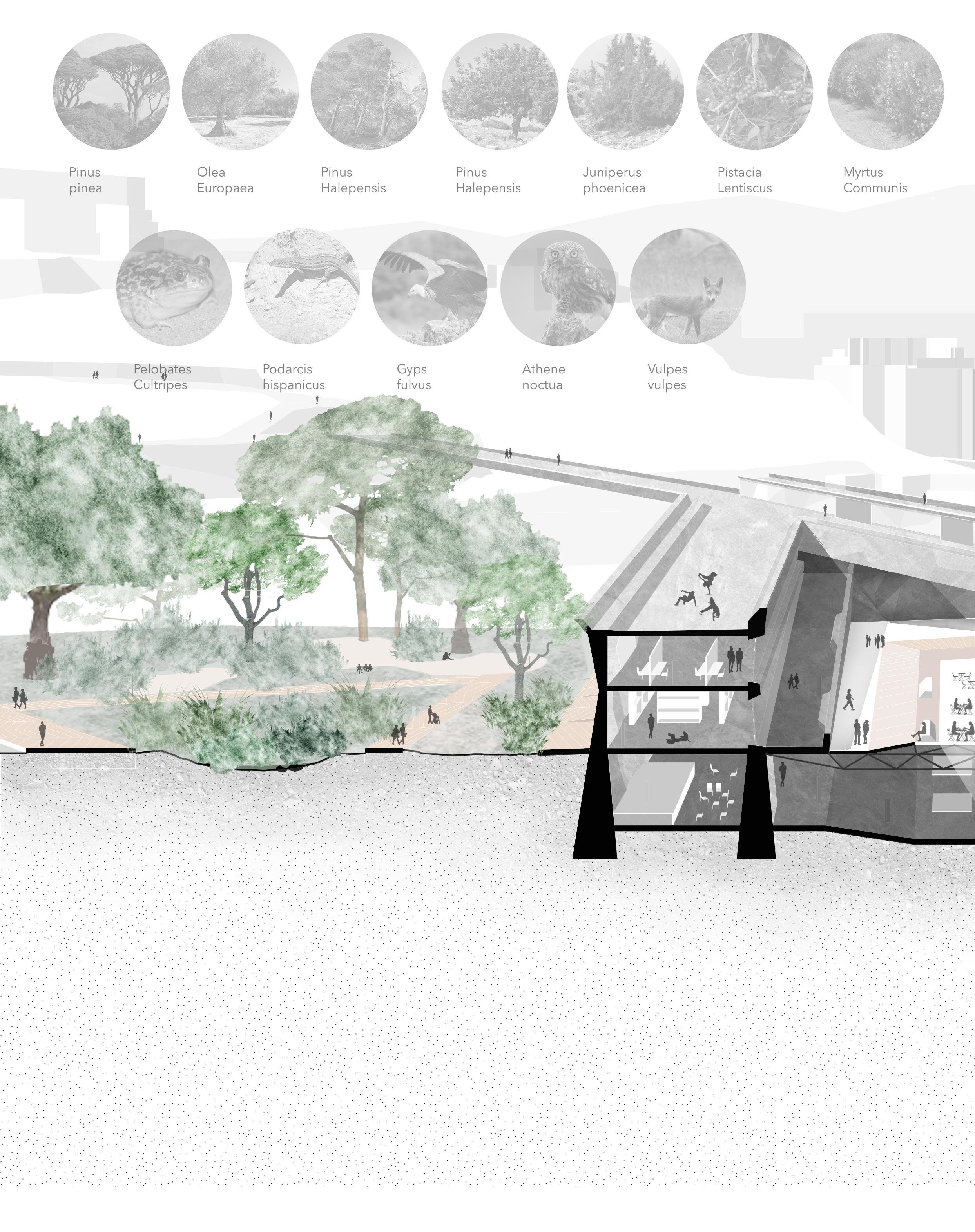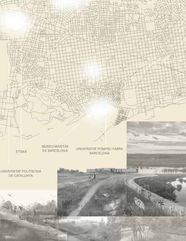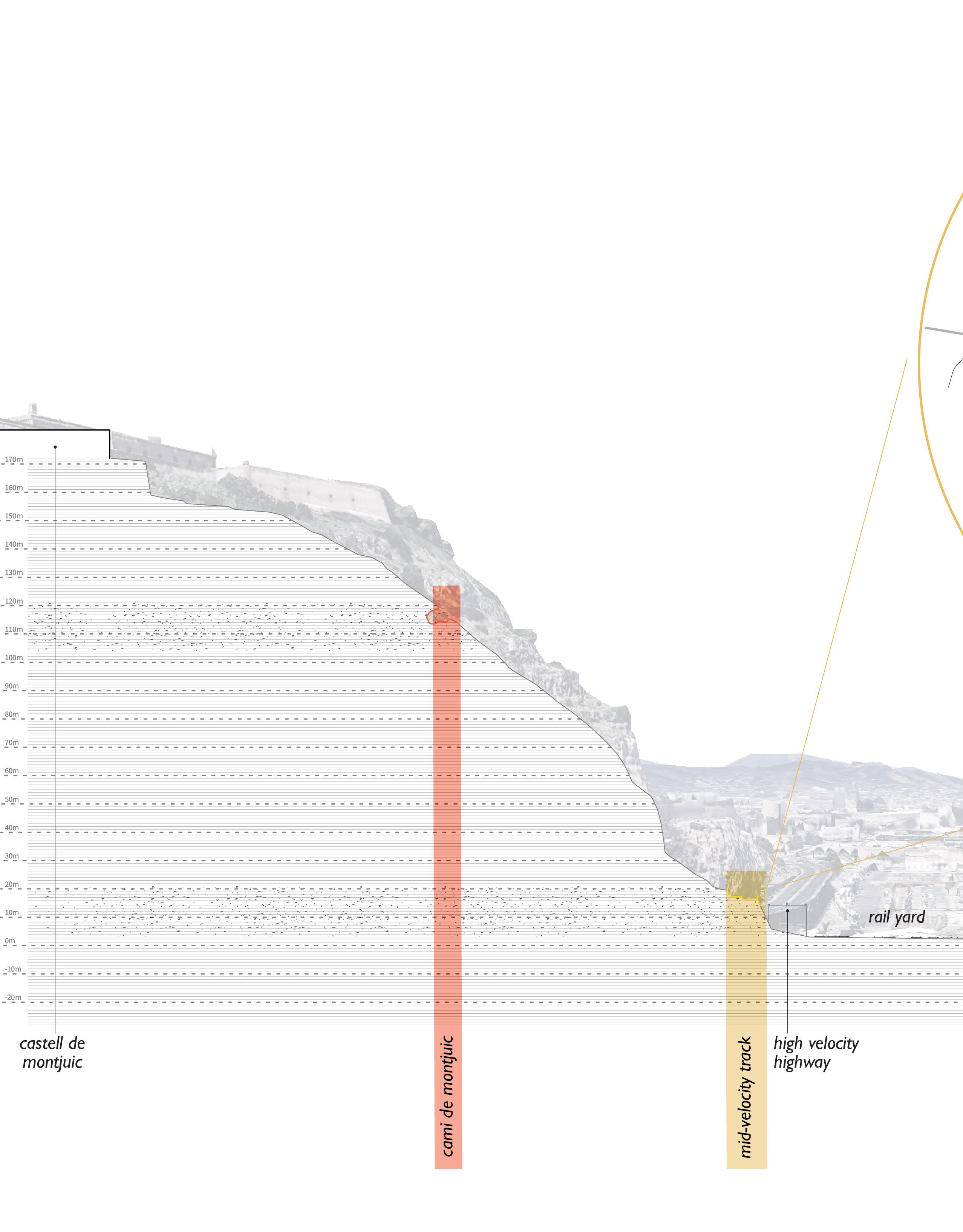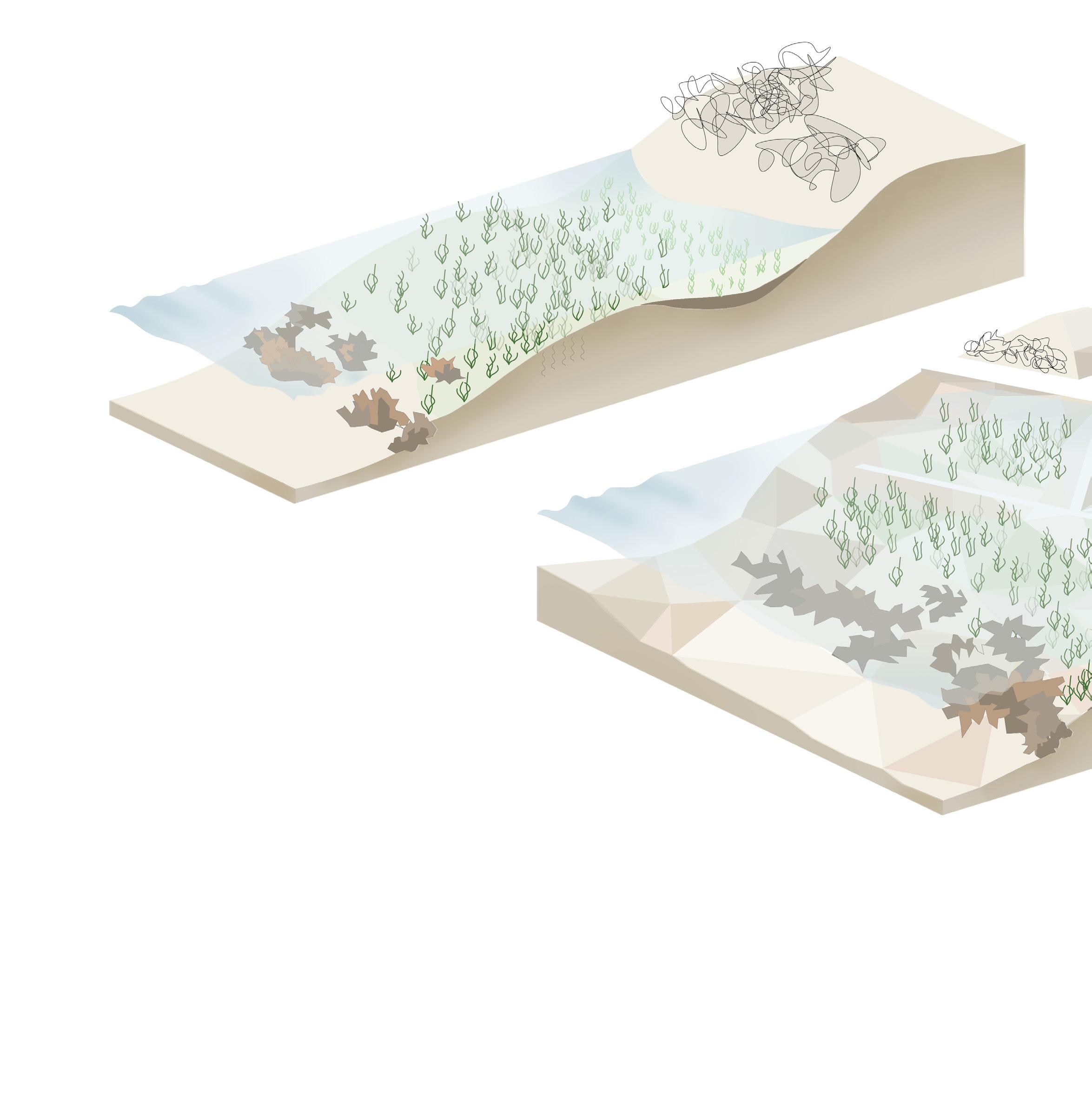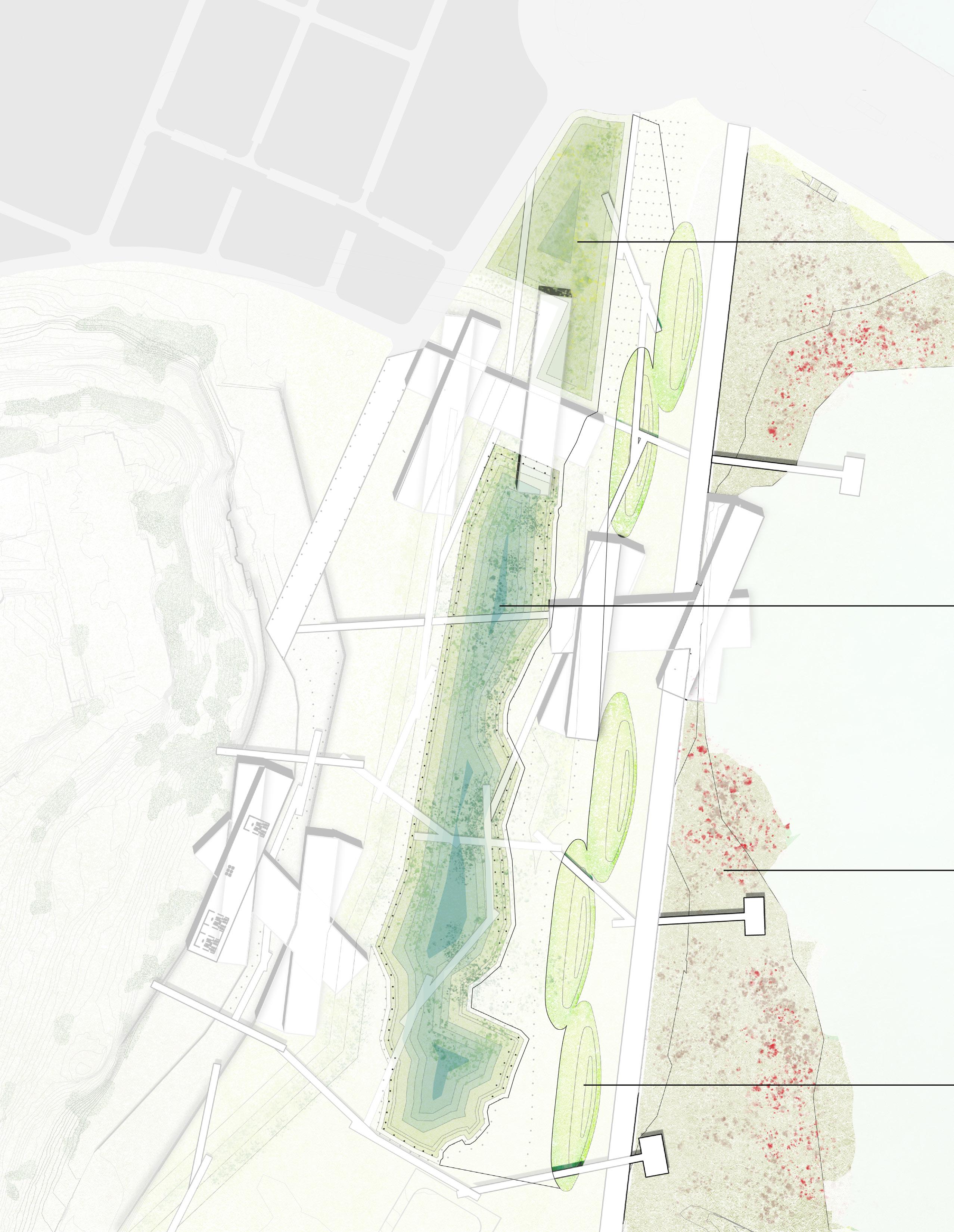 Barcelona is a city that lacks rain but is not in shortage of groundwater resources. The aquifers in Barcelona extend beyond Besos and Llobregat River’s boundary and forms a widespread web beneath the surface of the city, supporting all kinds of urban activities and the ecology. The most significant natural watershed divider in the urban area - both aboveground and below ground, is the terrain of Mt. Juic. While the project site confronts the dramatic topographic change of the Mountain and embraces intriguing moments of how water moves on the terrain, this project seeks to collect, transport, and infiltrate rainwater and urban runoff through wetlands that recharge/ connect the two river’s aquifers. In reciprocity, the aquifers also feed the wetland and the plant communities assembled on the site. The in-betweeness of the Mountain and the sea becomes an opportunity to create a series of wetland conditions with a gradient of moisture and salinity.
