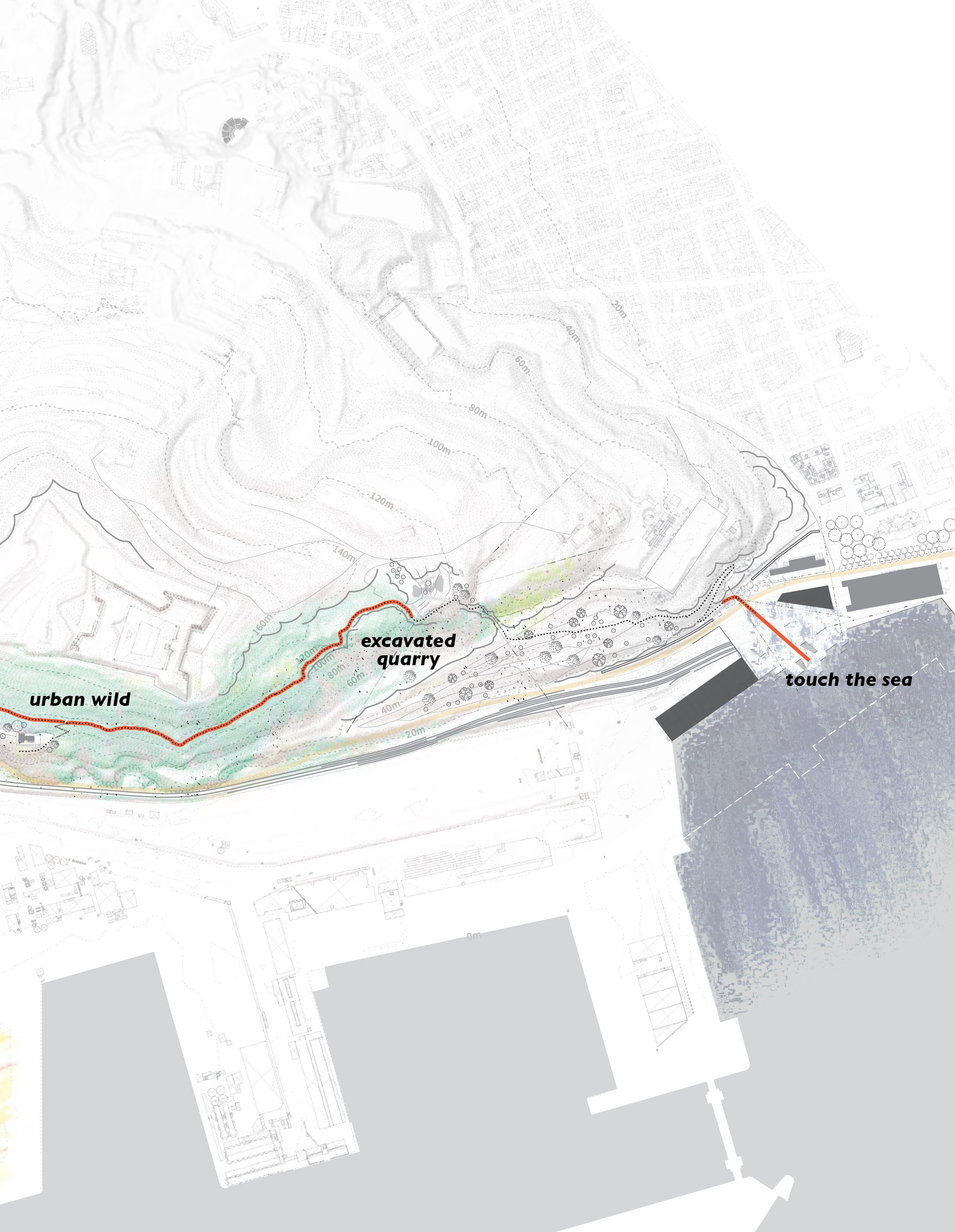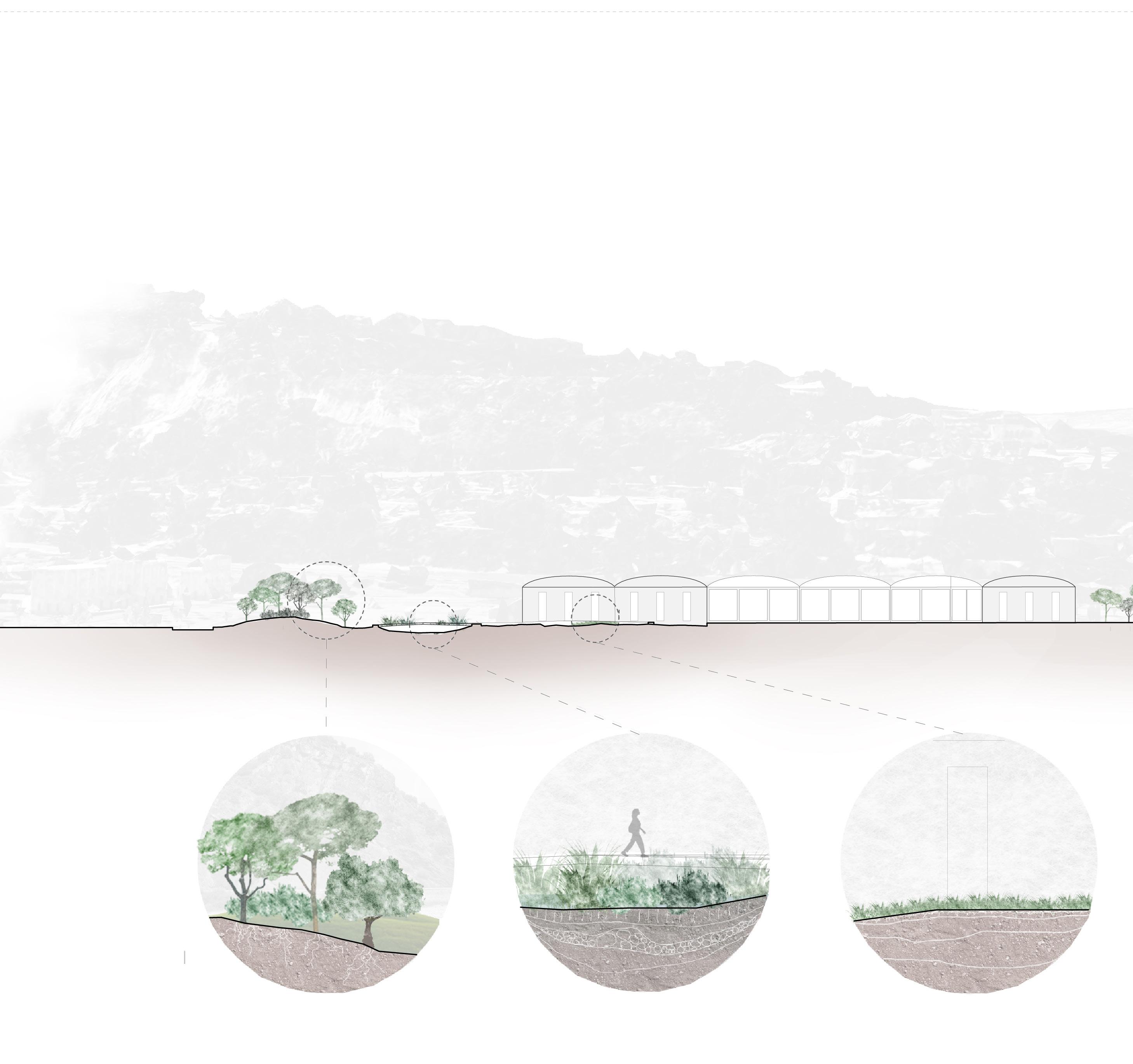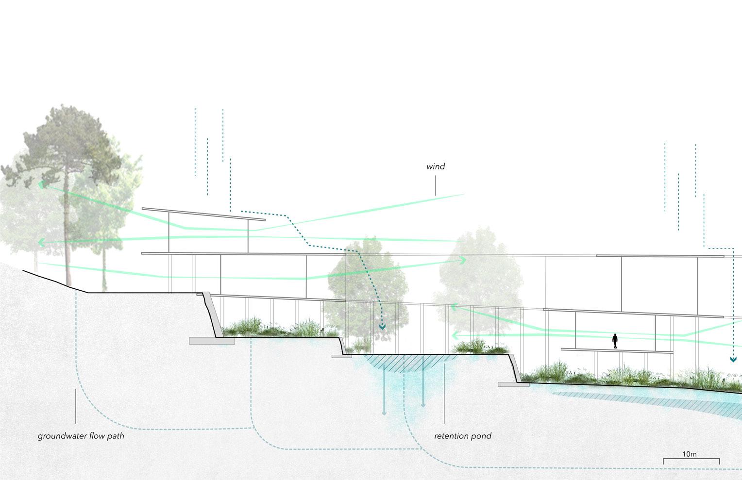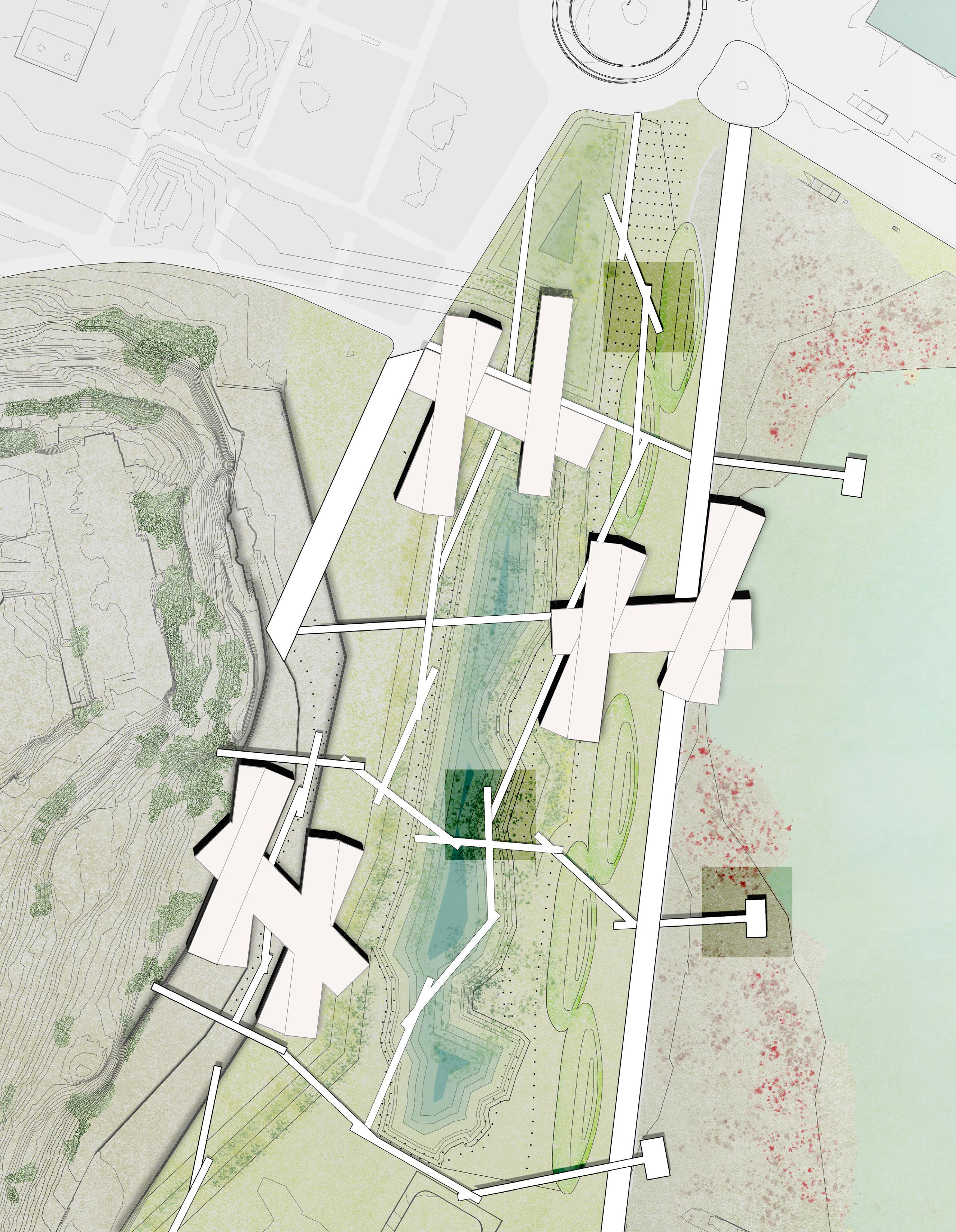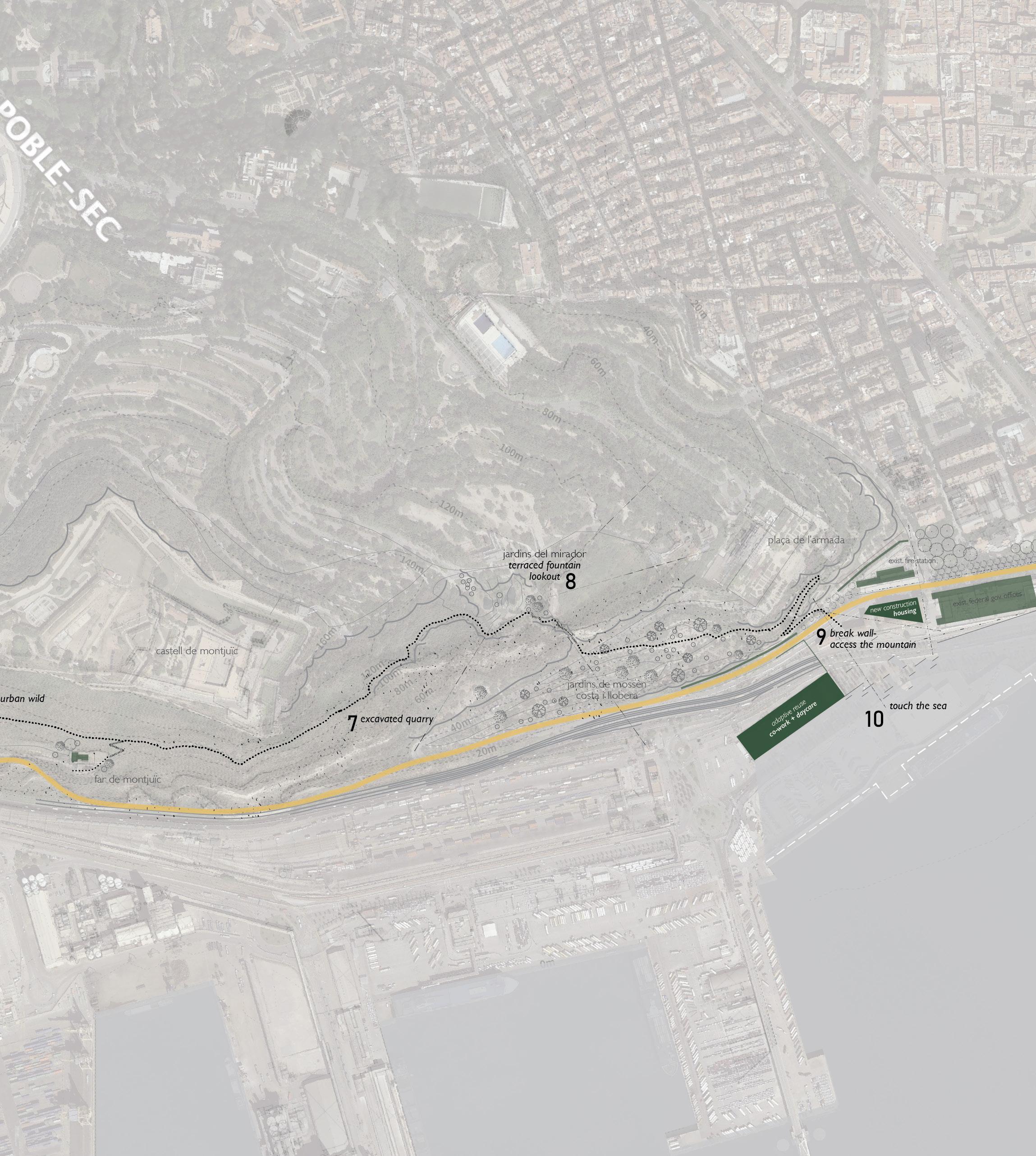 Barcelona is a city that lacks rain but is not in shortage of groundwater resources. The aquifers in Barcelona extend beyond Besos and Llobregat River’s boundary and forms a widespread web beneath the surface of the city, supporting all kinds of urban activities and the ecology. The most significant natural watershed divider in the urban area - both aboveground and below ground, is the terrain of Mt. Juic. While the project site confronts the dramatic topographic change of the Mountain and embraces intriguing moments of how water moves on the terrain, this project seeks to collect, transport, and infiltrate rainwater and urban runoff through wetlands that recharge/ connect the two river’s aquifers. In reciprocity, the aquifers also feed the wetland and the plant communities assembled on the site. The in-betweeness of the Mountain and the sea becomes an opportunity to create a series of wetland conditions with a gradient of moisture and salinity.