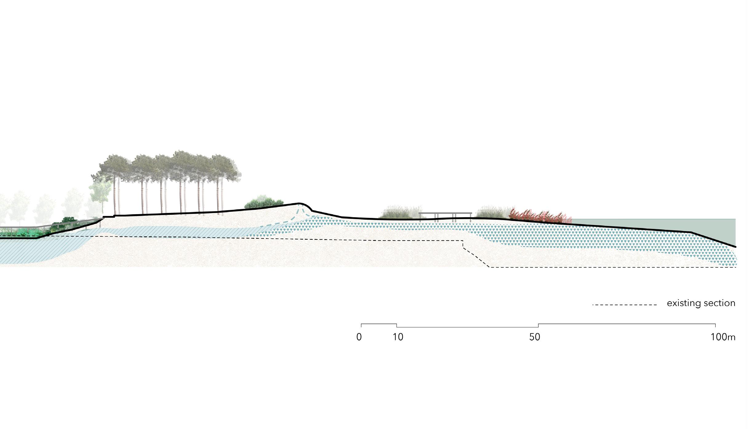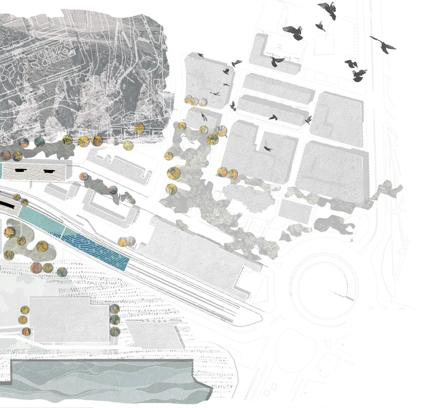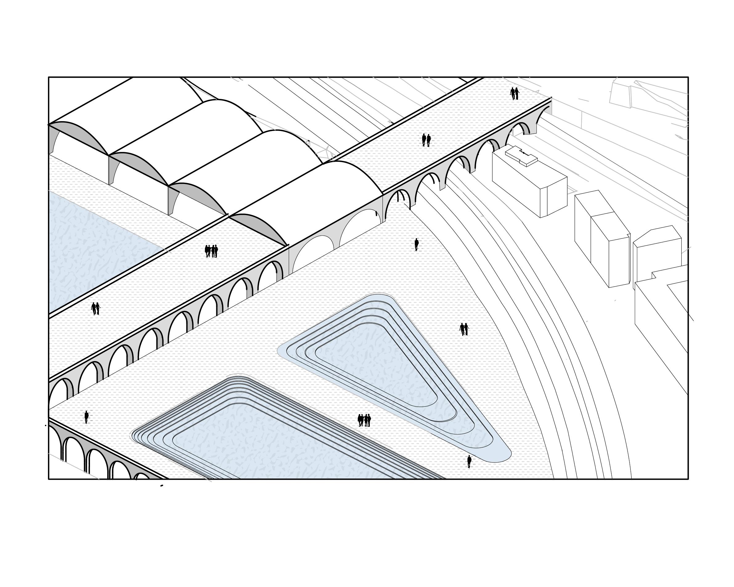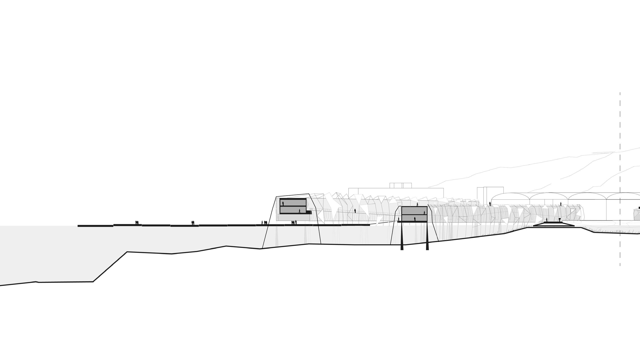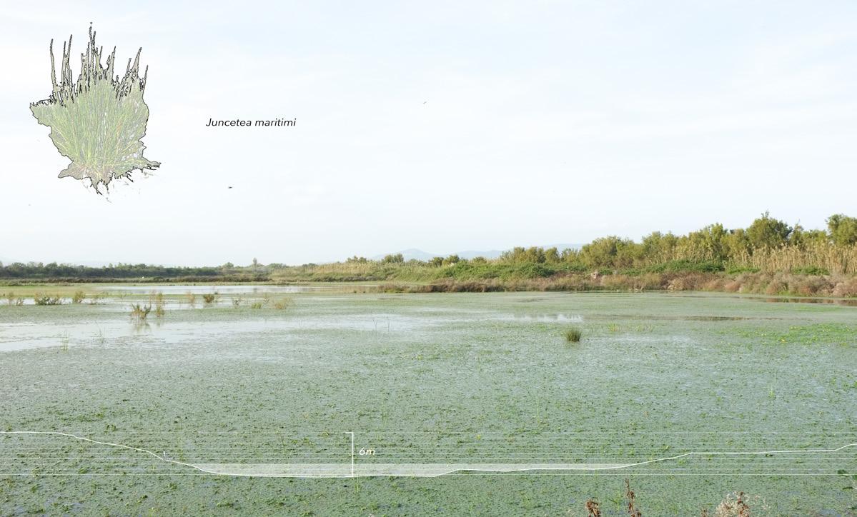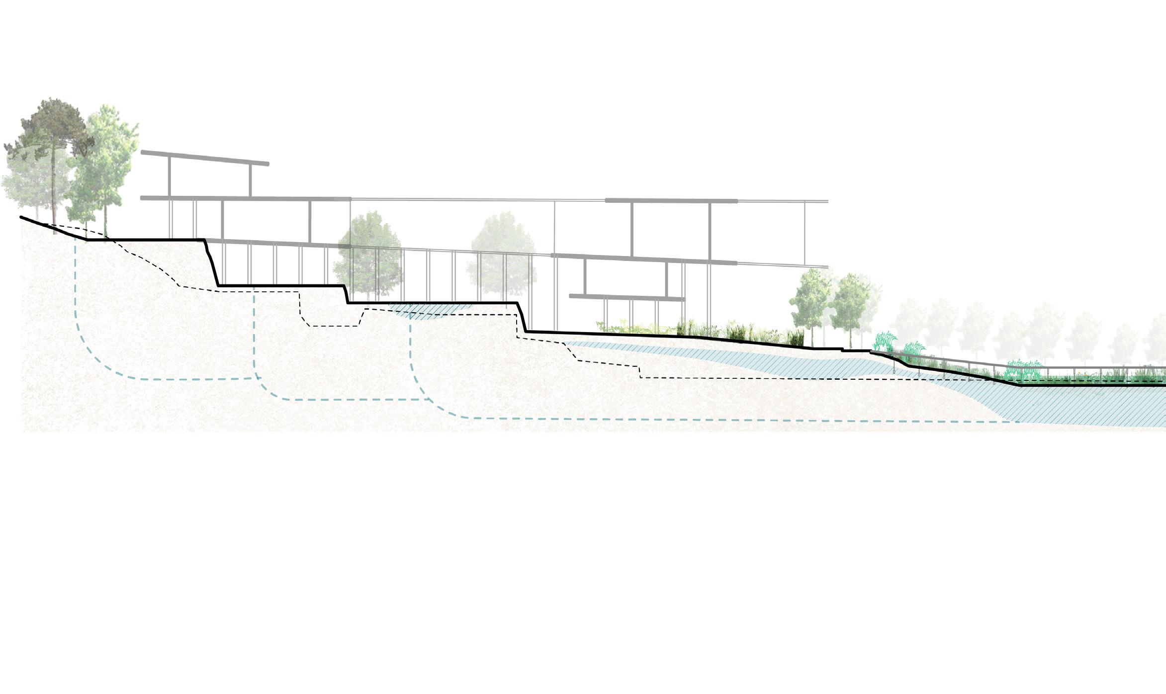 Barcelona is a city that lacks rain but is not in shortage of groundwater resources. The aquifers in Barcelona extend beyond Besos and Llobregat River’s boundary and forms a widespread web beneath the surface of the city, supporting all kinds of urban activities and the ecology. The most significant natural watershed divider in the urban area - both aboveground and below ground, is the terrain of Mt. Juic. While the project site confronts the dramatic topographic change of the Mountain and embraces intriguing moments of how water moves on the terrain, this project seeks to collect, transport, and infiltrate rainwater and urban runoff through wetlands that recharge/ connect the two river’s aquifers. In reciprocity, the aquifers also feed the wetland and the plant communities assembled on the site. The in-betweeness of the Mountain and the sea becomes an opportunity to create a series of wetland conditions with a gradient of moisture and salinity.