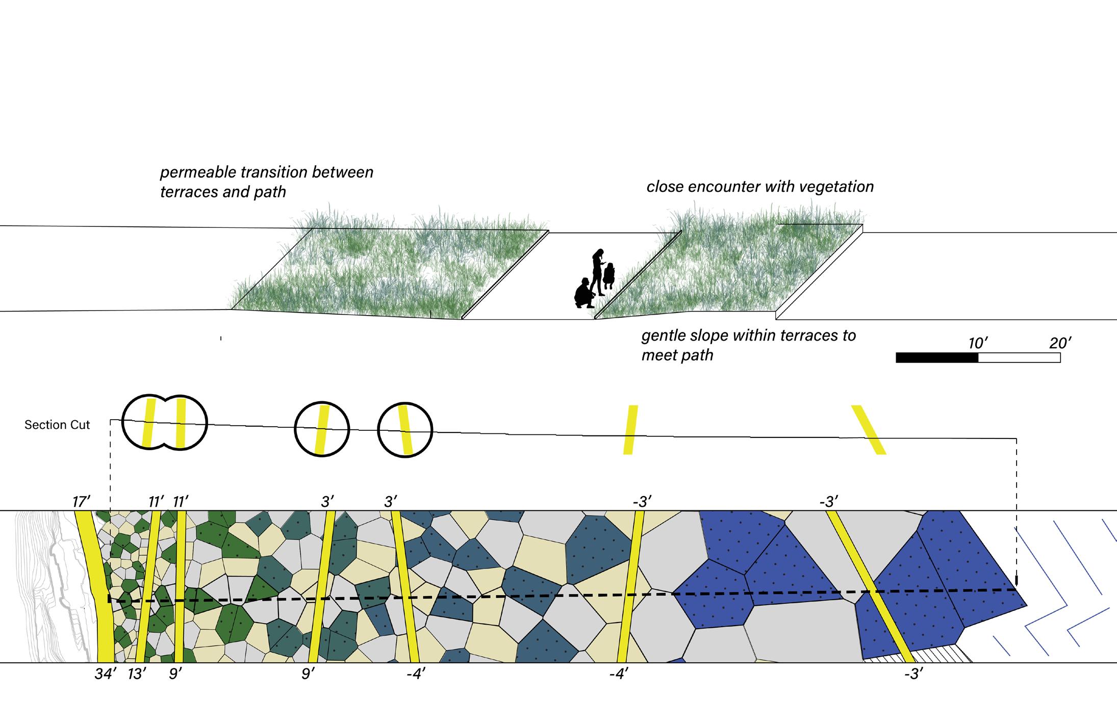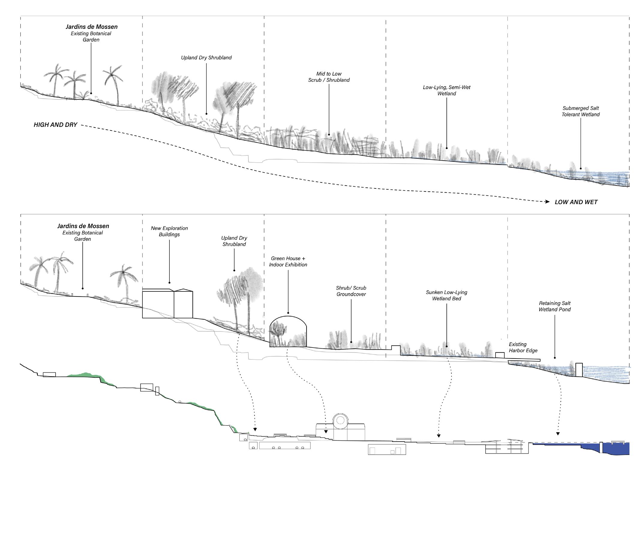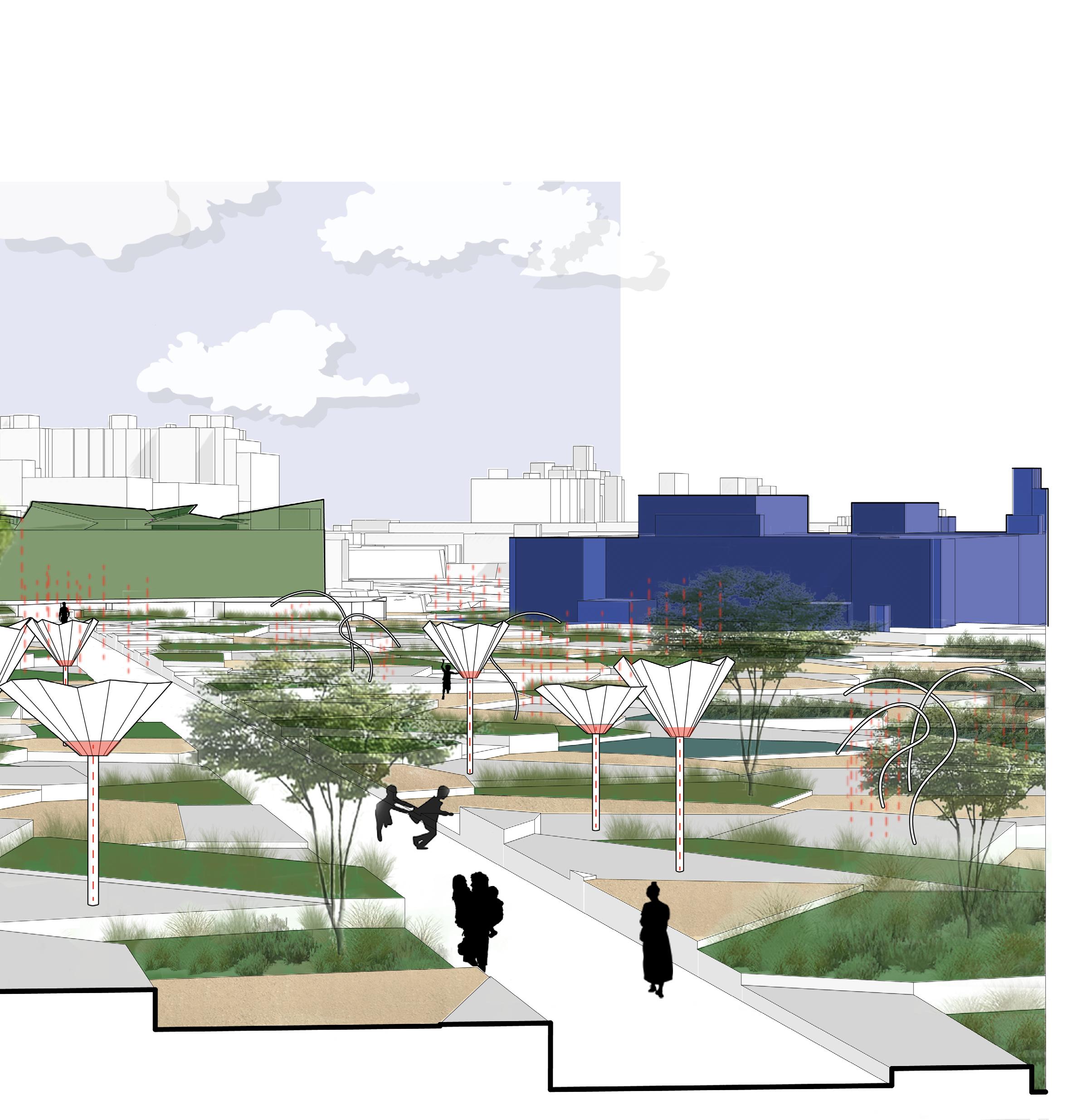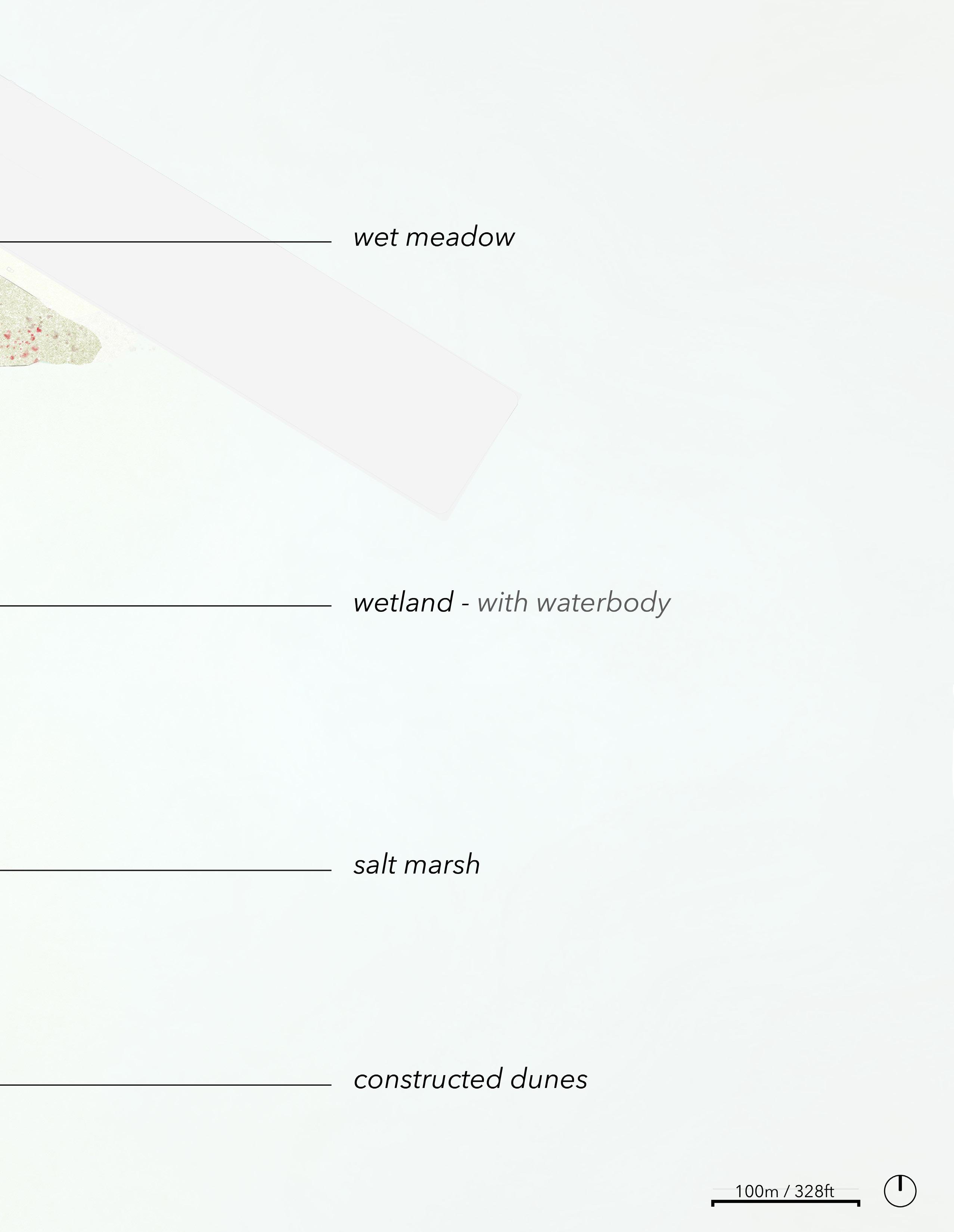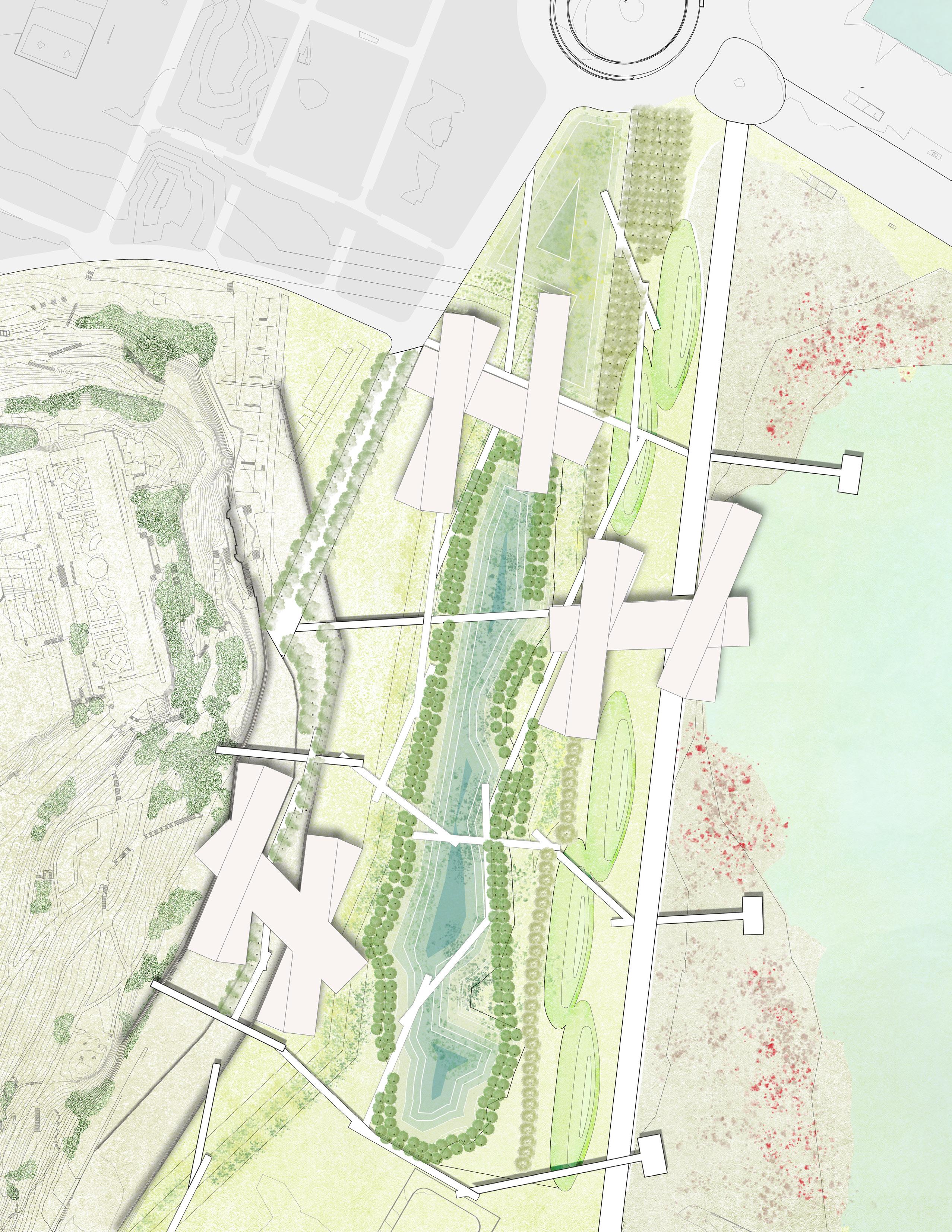 Barcelona is a city that lacks rain but is not in shortage of groundwater resources. The aquifers in Barcelona extend beyond Besos and Llobregat River’s boundary and forms a widespread web beneath the surface of the city, supporting all kinds of urban activities and the ecology. The most significant natural watershed divider in the urban area - both aboveground and below ground, is the terrain of Mt. Juic. While the project site confronts the dramatic topographic change of the Mountain and embraces intriguing moments of how water moves on the terrain, this project seeks to collect, transport, and infiltrate rainwater and urban runoff through wetlands that recharge/ connect the two river’s aquifers. In reciprocity, the aquifers also feed the wetland and the plant communities assembled on the site. The in-betweeness of the Mountain and the sea becomes an opportunity to create a series of wetland conditions with a gradient of moisture and salinity.