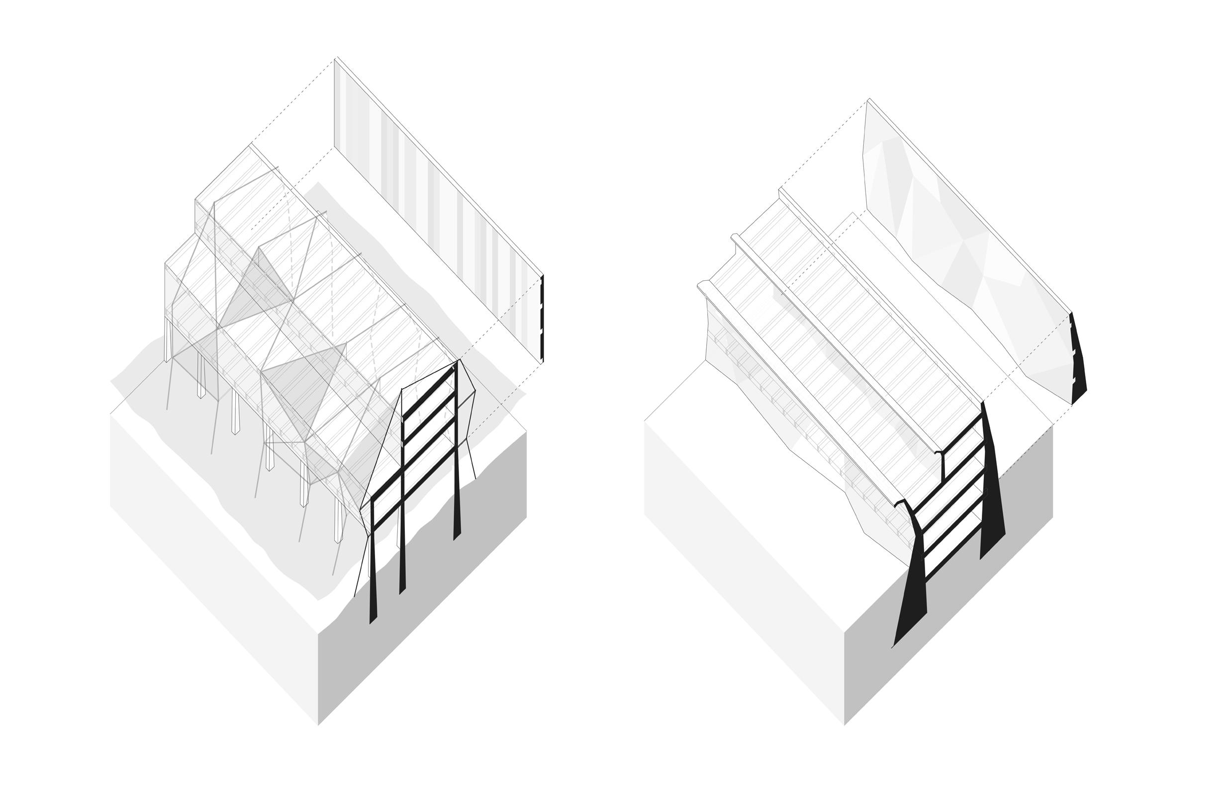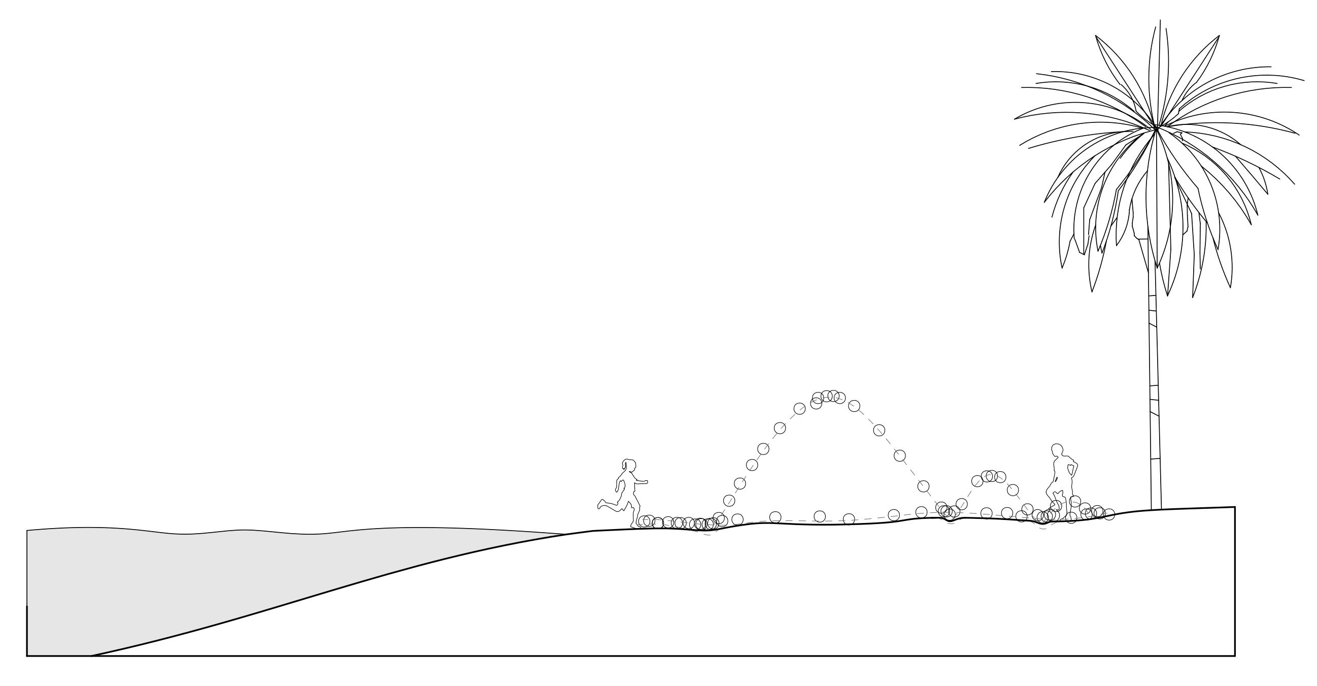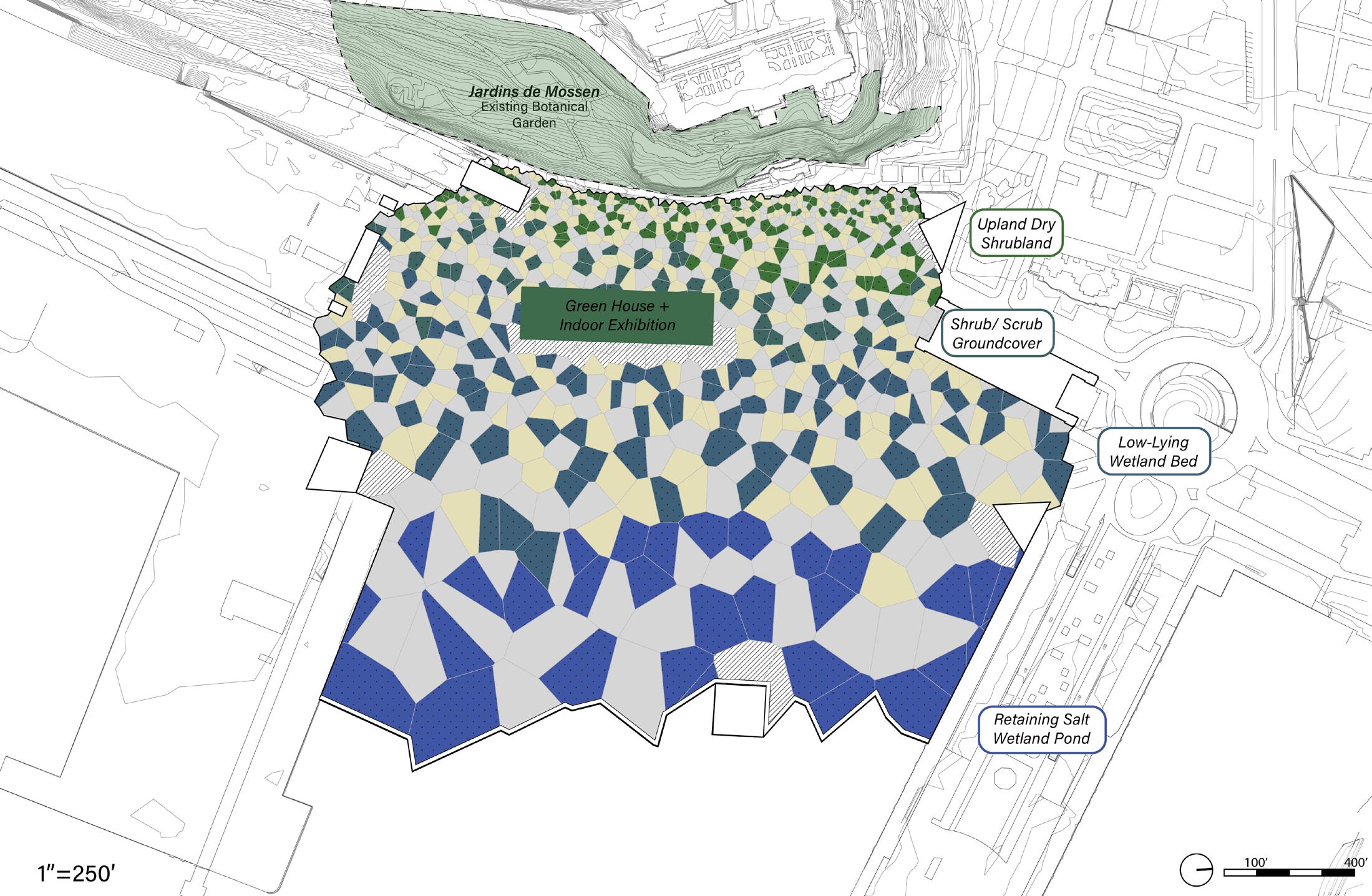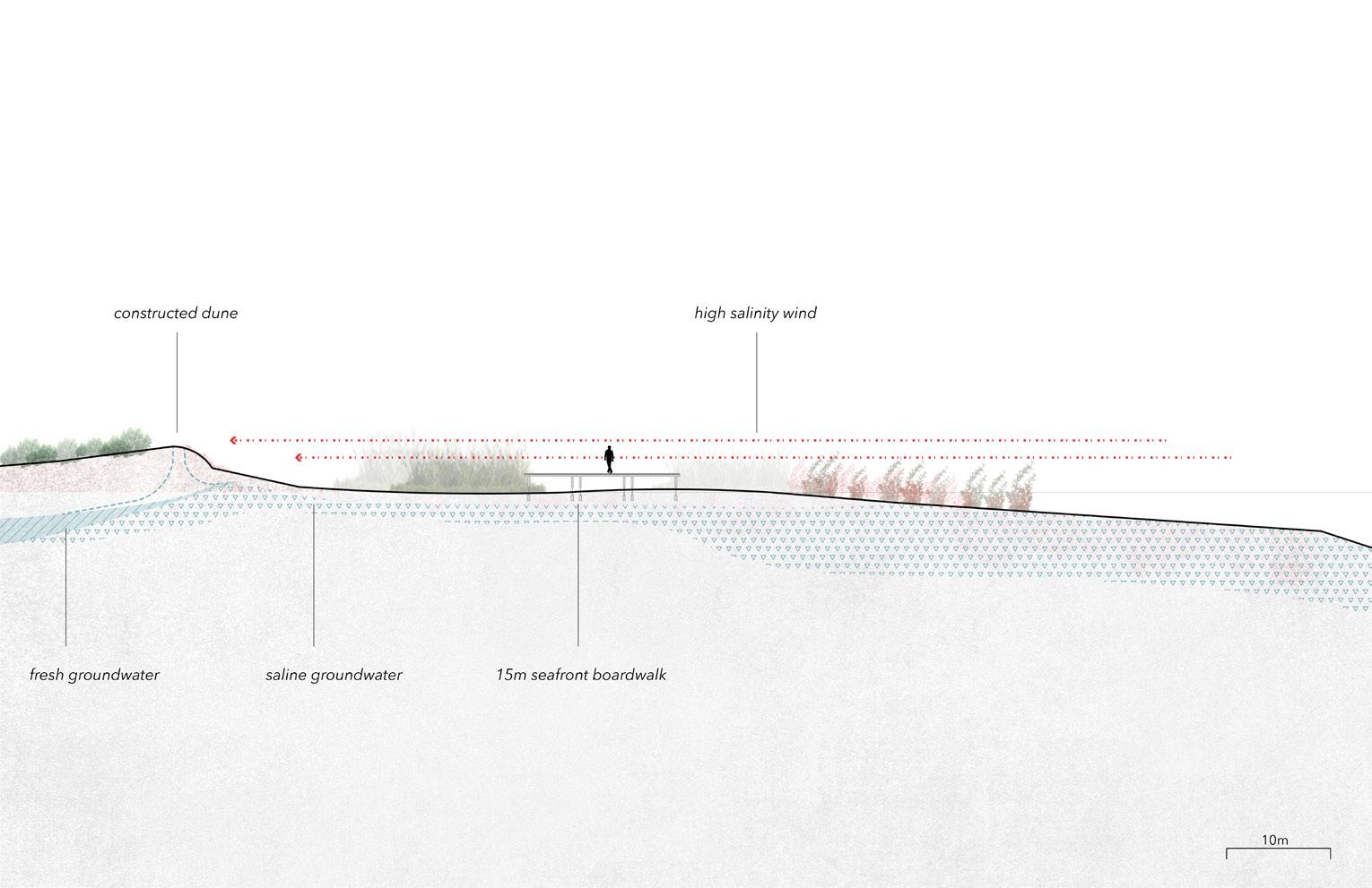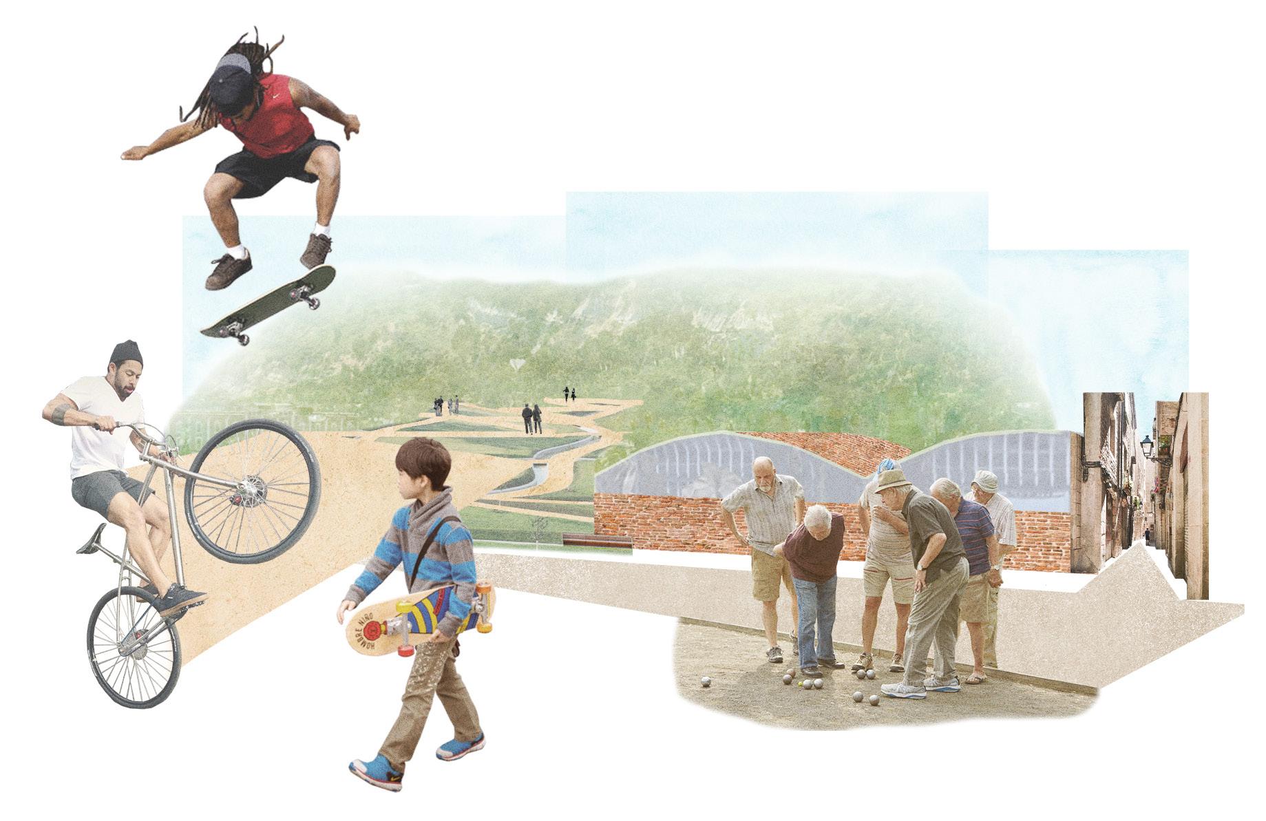 Barcelona is a city that lacks rain but is not in shortage of groundwater resources. The aquifers in Barcelona extend beyond Besos and Llobregat River’s boundary and forms a widespread web beneath the surface of the city, supporting all kinds of urban activities and the ecology. The most significant natural watershed divider in the urban area - both aboveground and below ground, is the terrain of Mt. Juic. While the project site confronts the dramatic topographic change of the Mountain and embraces intriguing moments of how water moves on the terrain, this project seeks to collect, transport, and infiltrate rainwater and urban runoff through wetlands that recharge/ connect the two river’s aquifers. In reciprocity, the aquifers also feed the wetland and the plant communities assembled on the site. The in-betweeness of the Mountain and the sea becomes an opportunity to create a series of wetland conditions with a gradient of moisture and salinity.