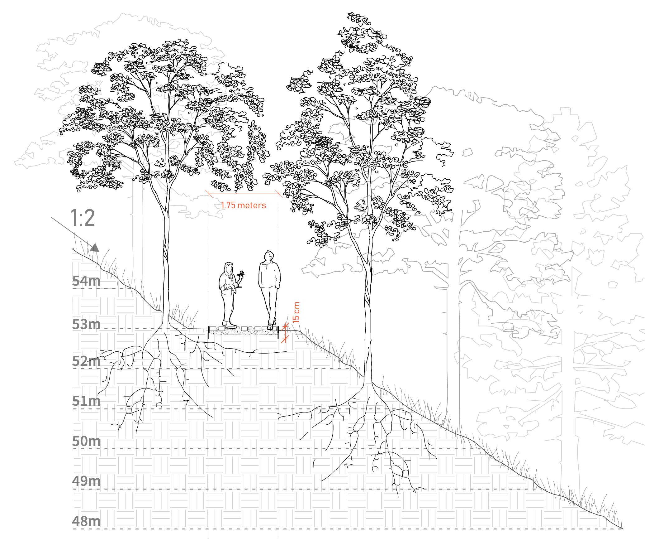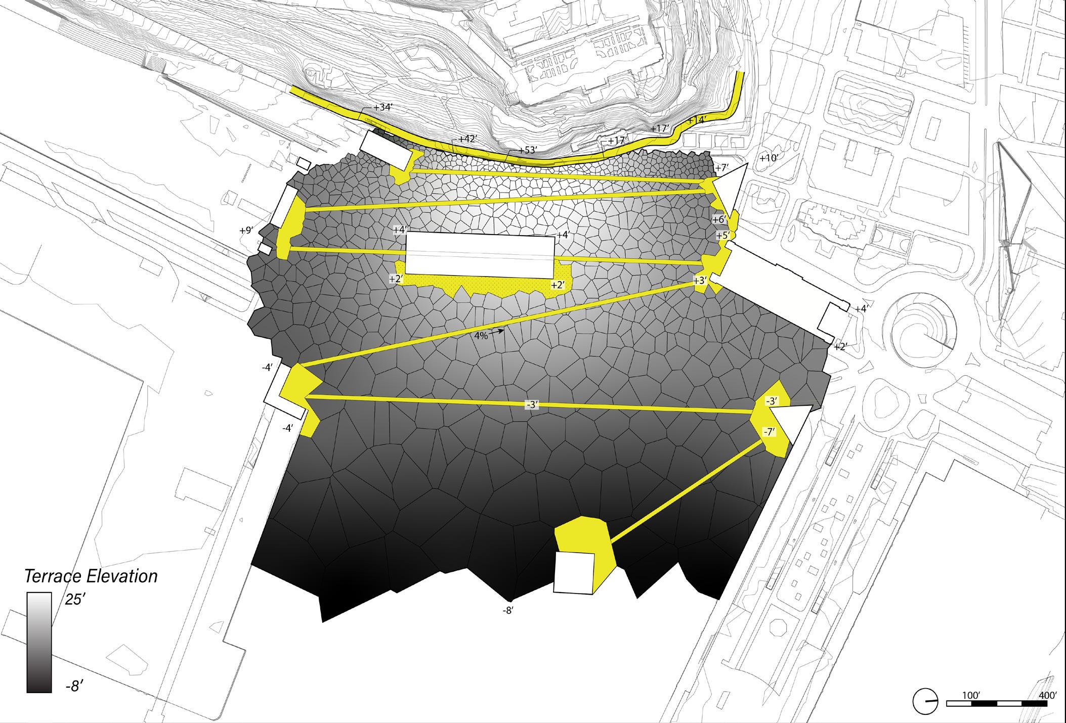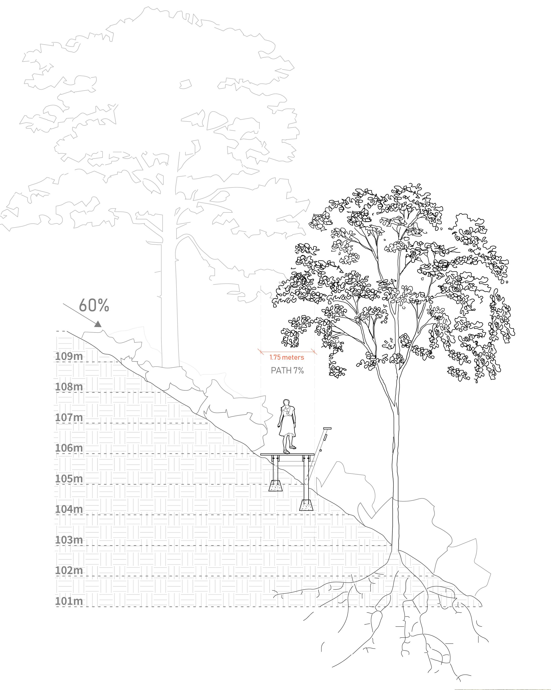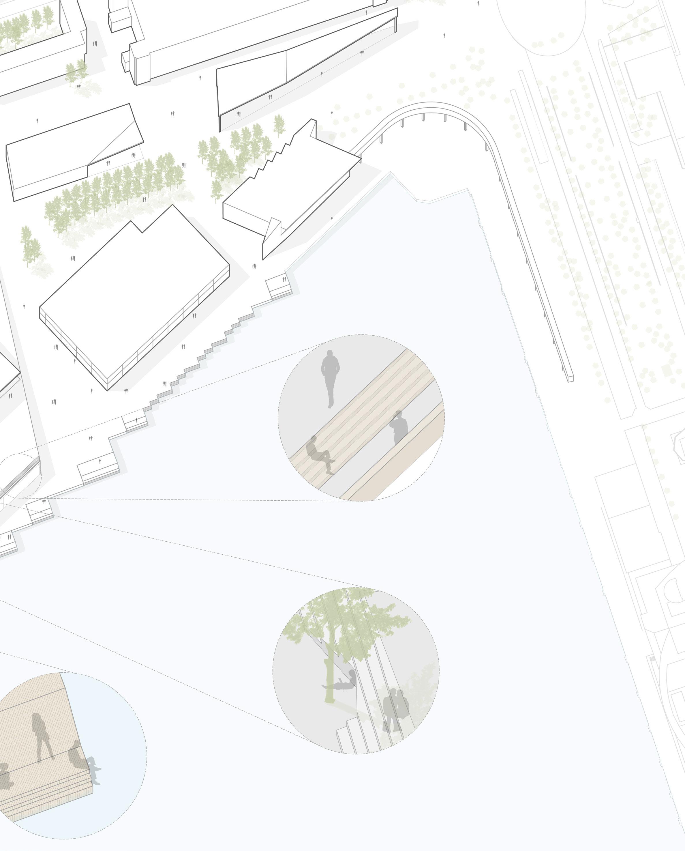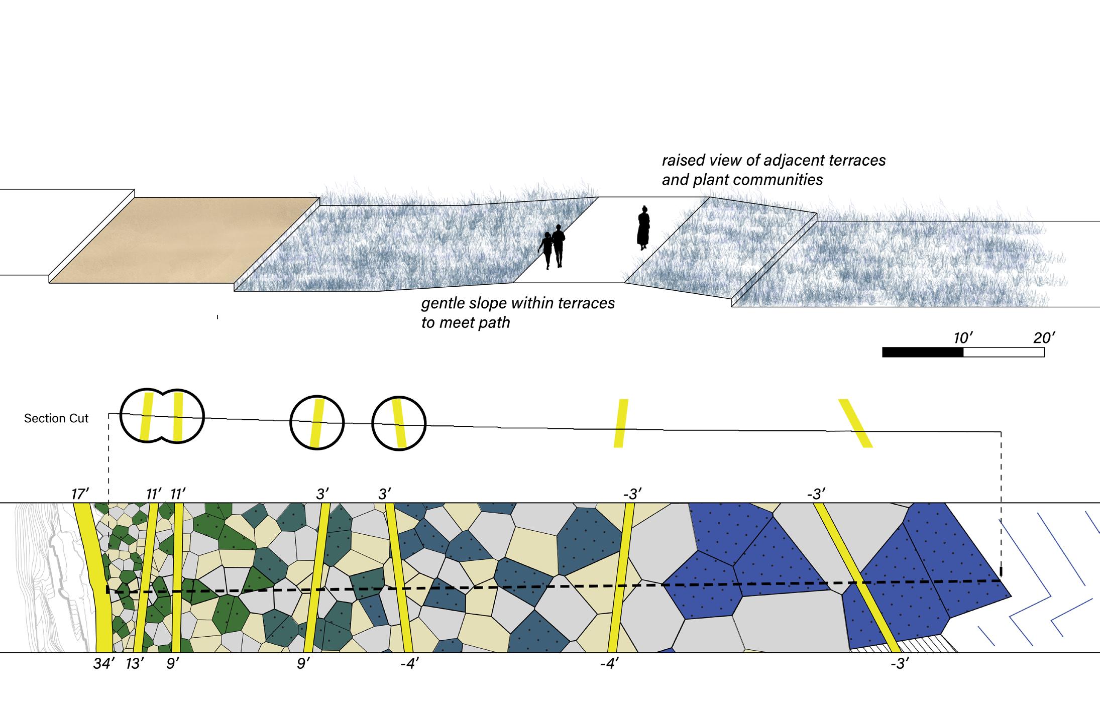 Barcelona is a city that lacks rain but is not in shortage of groundwater resources. The aquifers in Barcelona extend beyond Besos and Llobregat River’s boundary and forms a widespread web beneath the surface of the city, supporting all kinds of urban activities and the ecology. The most significant natural watershed divider in the urban area - both aboveground and below ground, is the terrain of Mt. Juic. While the project site confronts the dramatic topographic change of the Mountain and embraces intriguing moments of how water moves on the terrain, this project seeks to collect, transport, and infiltrate rainwater and urban runoff through wetlands that recharge/ connect the two river’s aquifers. In reciprocity, the aquifers also feed the wetland and the plant communities assembled on the site. The in-betweeness of the Mountain and the sea becomes an opportunity to create a series of wetland conditions with a gradient of moisture and salinity.