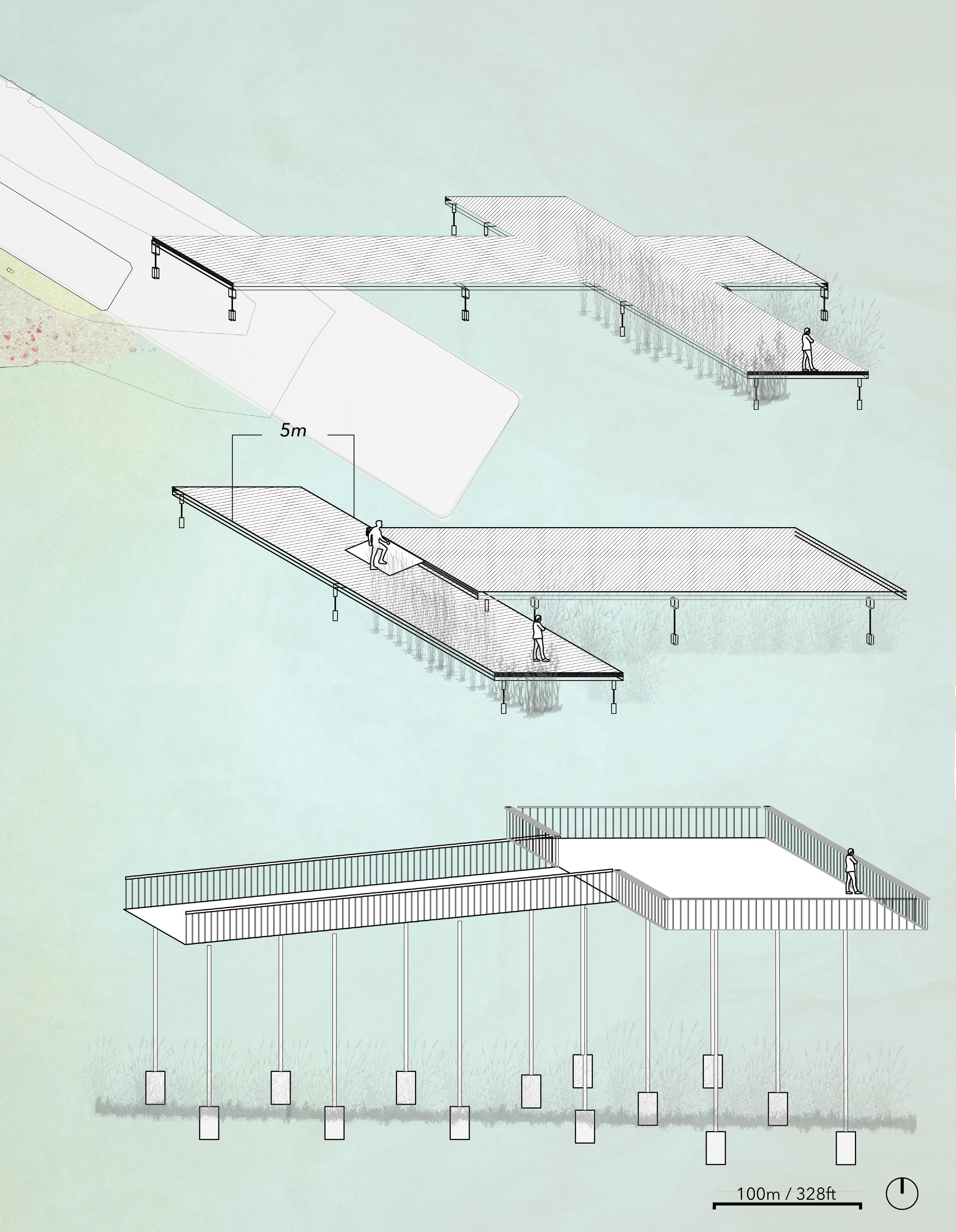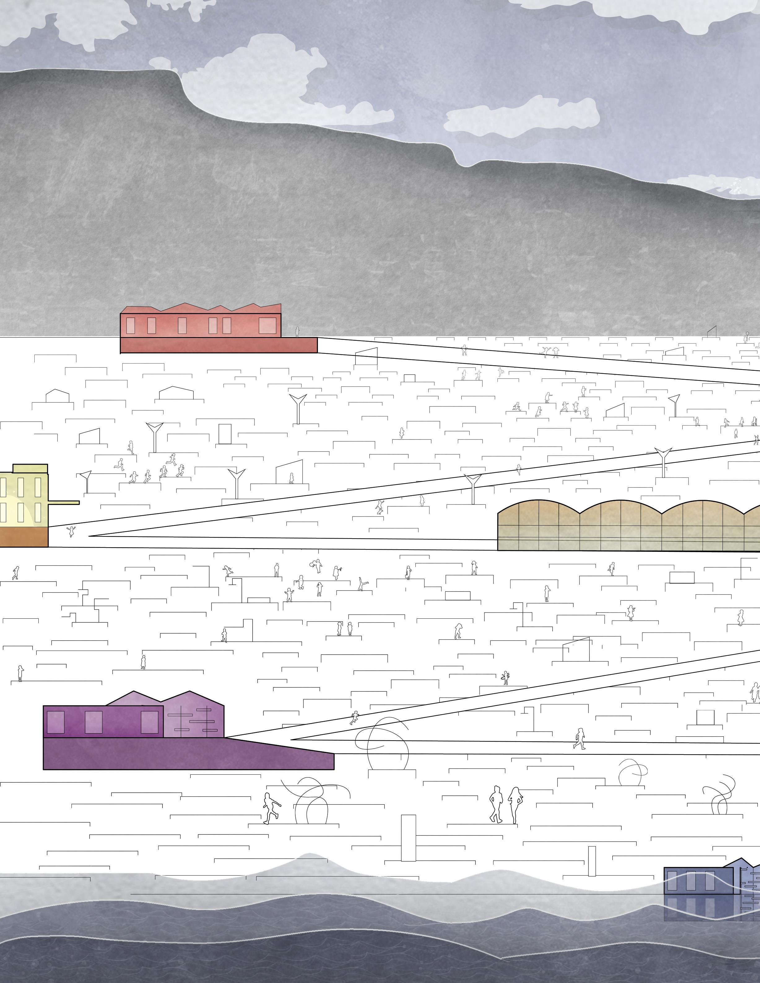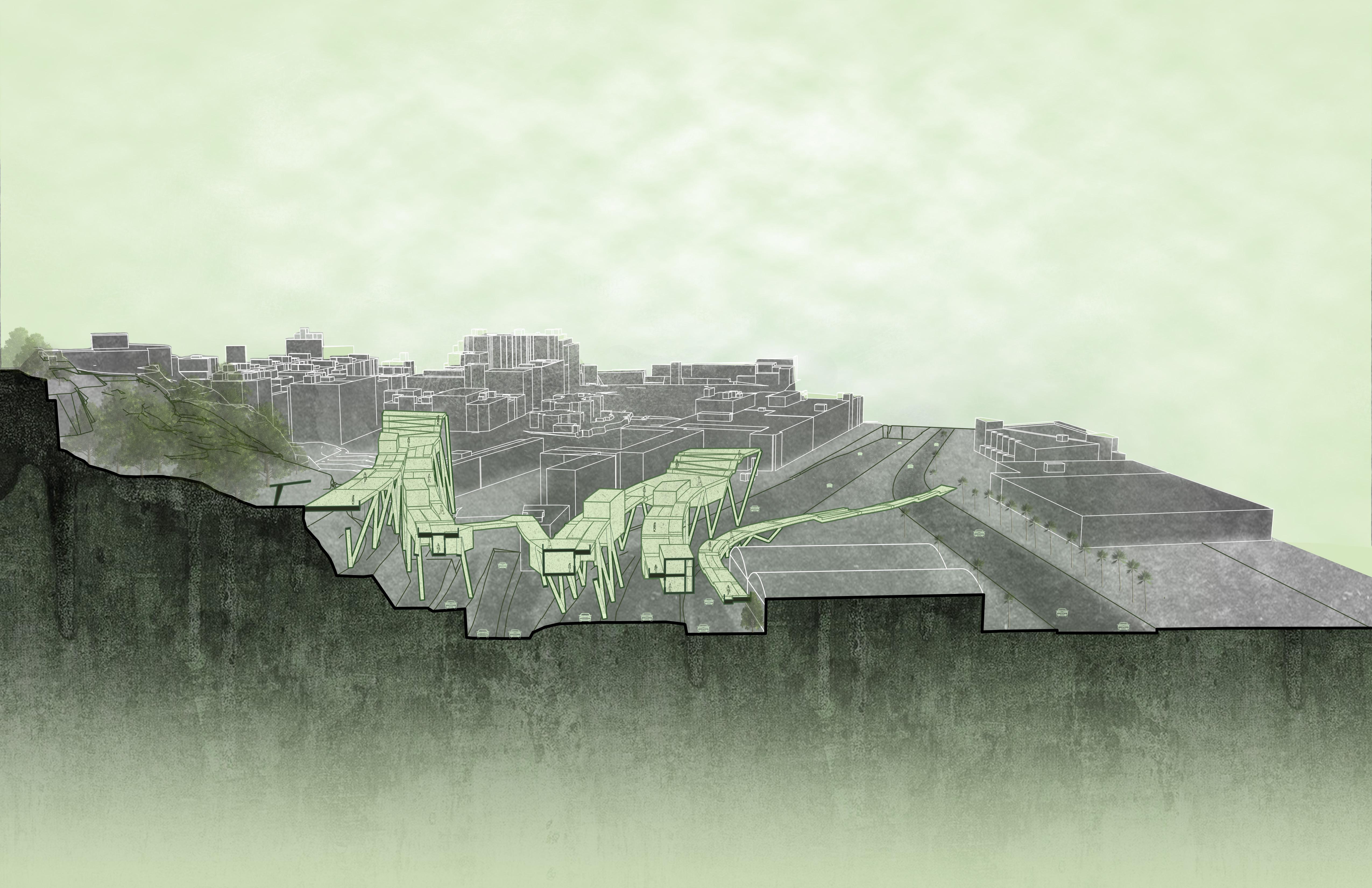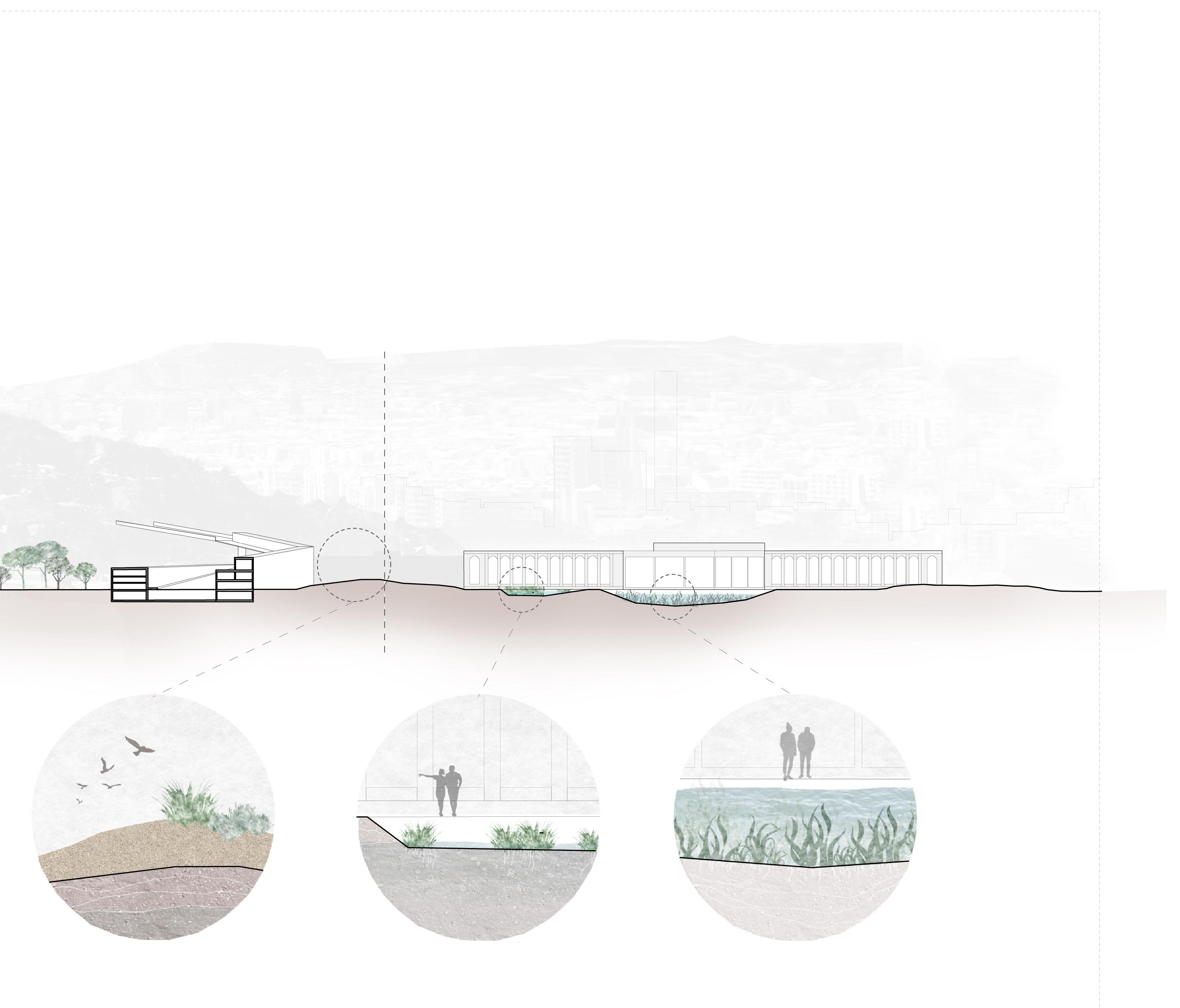 This project seeks to create both public space and a residential community focused on Mediterranean climate and ecology. It returns a space that is currently mostly inaccessible infrastructure back to the people and ecology, giving them a space of relief for conservation and contemplation. The buildings guide people through the wetland, allowing them to learn about the local climate while also being able to engage in cultural or commercial activities. Residential areas allow people to be more immersed in the wetland and engage in directed and necessary research related to costal climates. The buildings themselves work to support the wetland, guiding wind and water to support plant life and retention needs. Through these architectural strategies, the wetland unites the city, mountain, and sea.