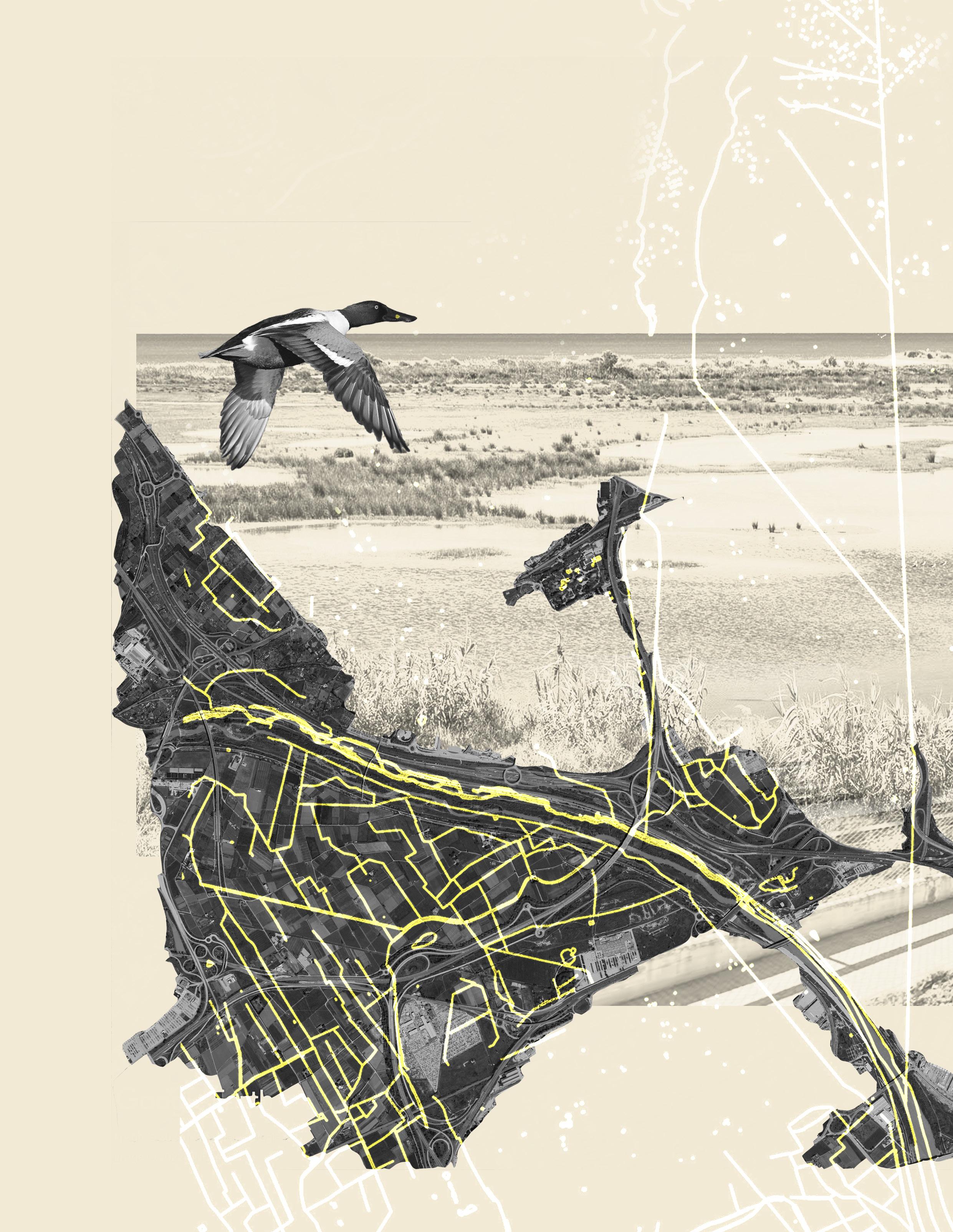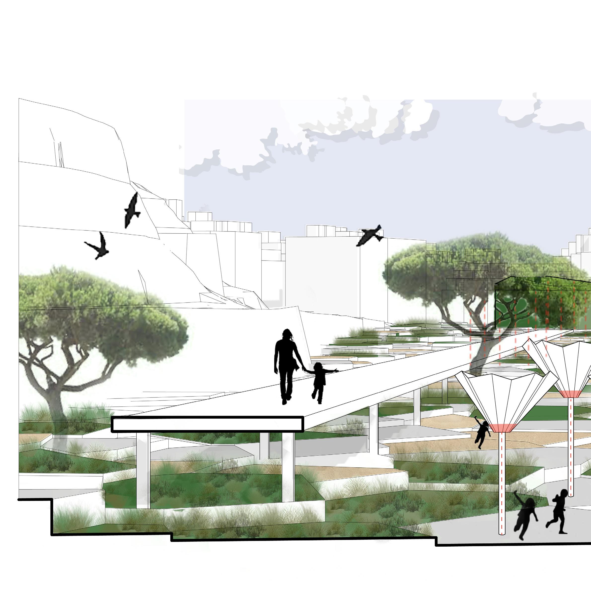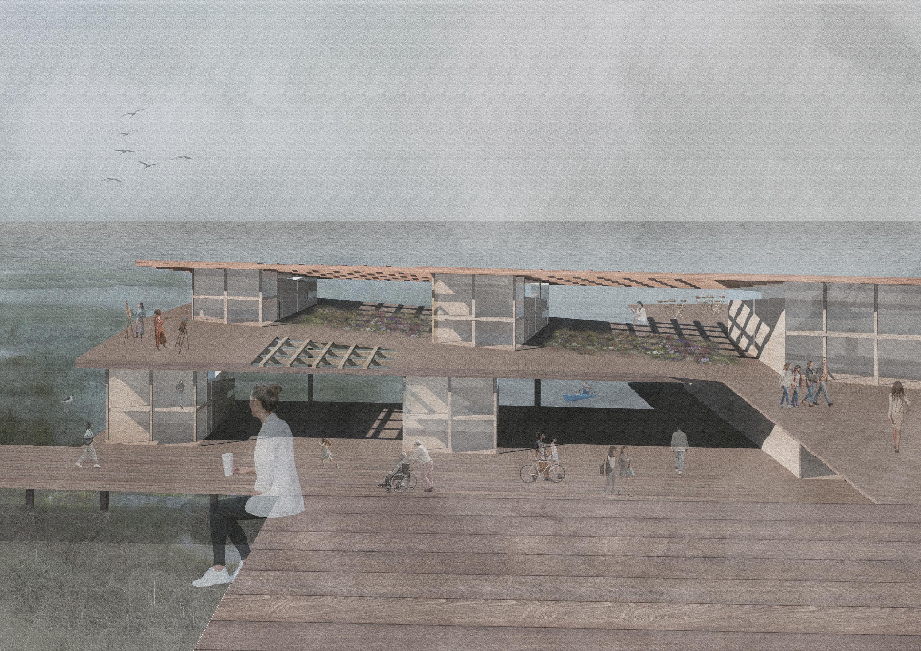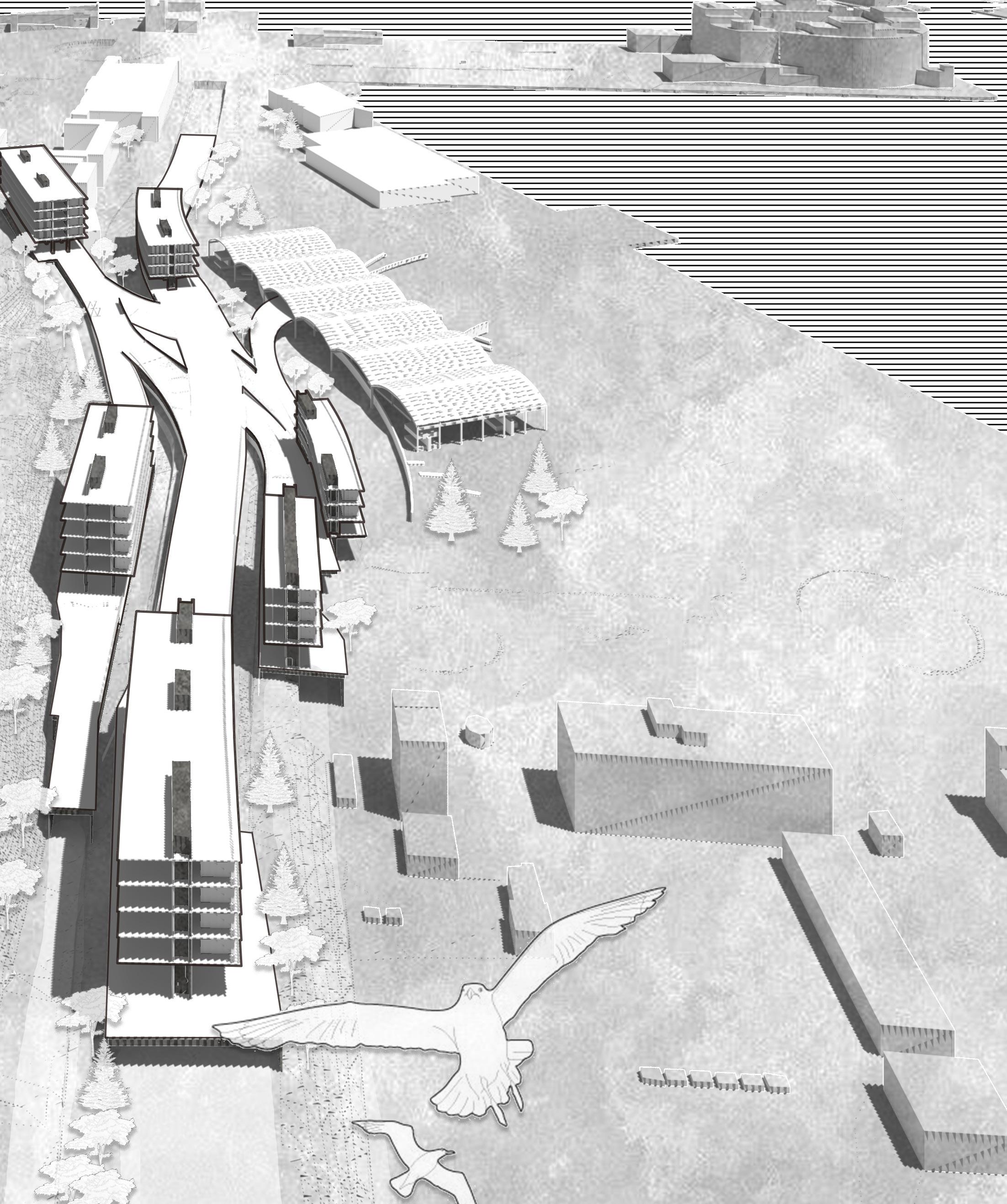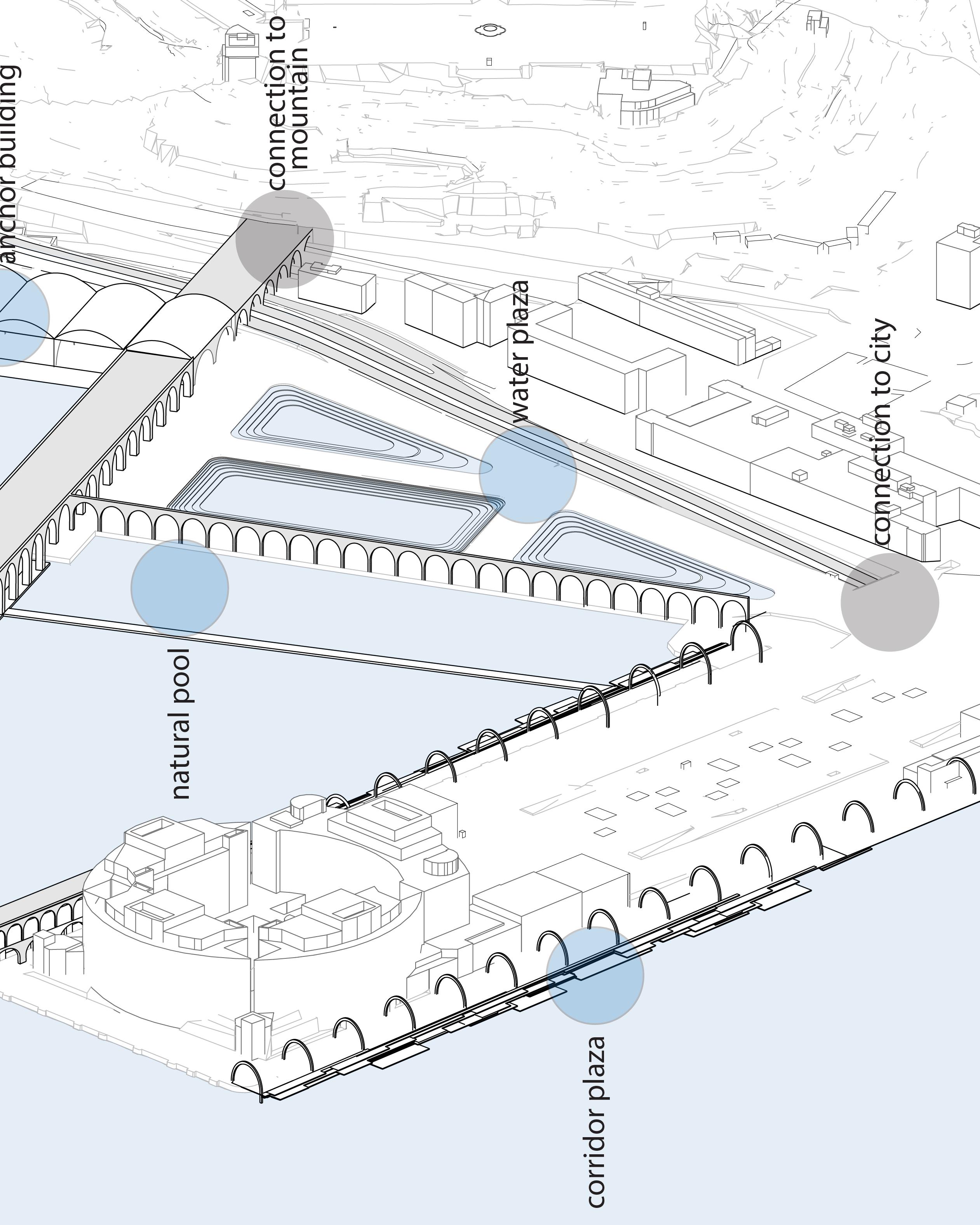This project seeks to create both public space and a residential community focused on Mediterranean climate and ecology. It returns a space that is currently mostly inaccessible infrastructure back to the people and ecology, giving them a space of relief for conservation and contemplation. The buildings guide people through the wetland, allowing them to learn about the local climate while also being able to engage in cultural or commercial activities. Residential areas allow people to be more immersed in the wetland and engage in directed and necessary research related to costal climates. The buildings themselves work to support the wetland, guiding wind and water to support plant life and retention needs. Through these architectural strategies, the wetland unites the city, mountain, and sea.
