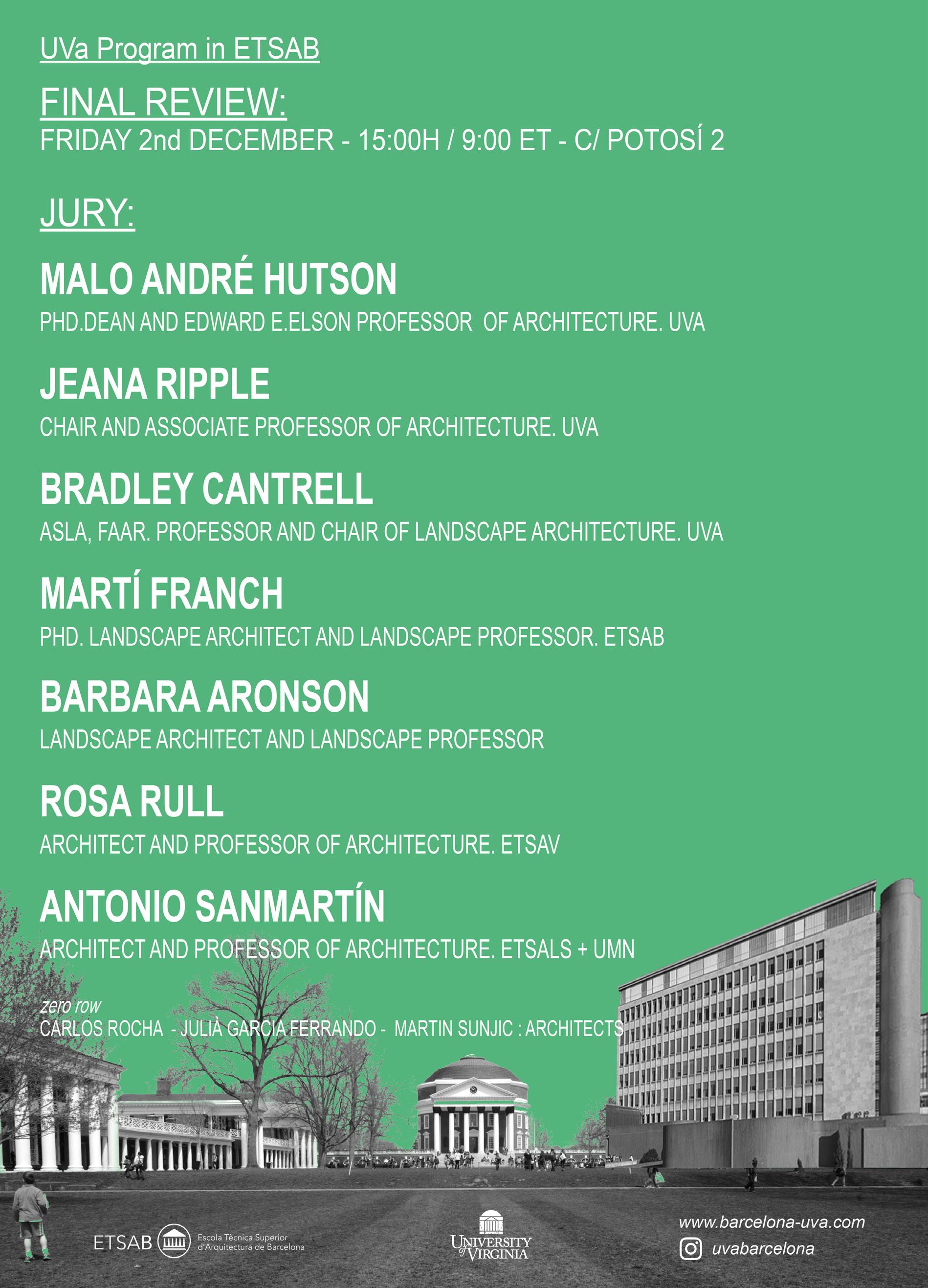 The final assignment should be an individual, precise and original contribution on any topic related with the course. The students will be evaluated by a final public presentation of 10 minutes’ length and a short paper illustrated by drawings, photographs, visuals and written arguments.