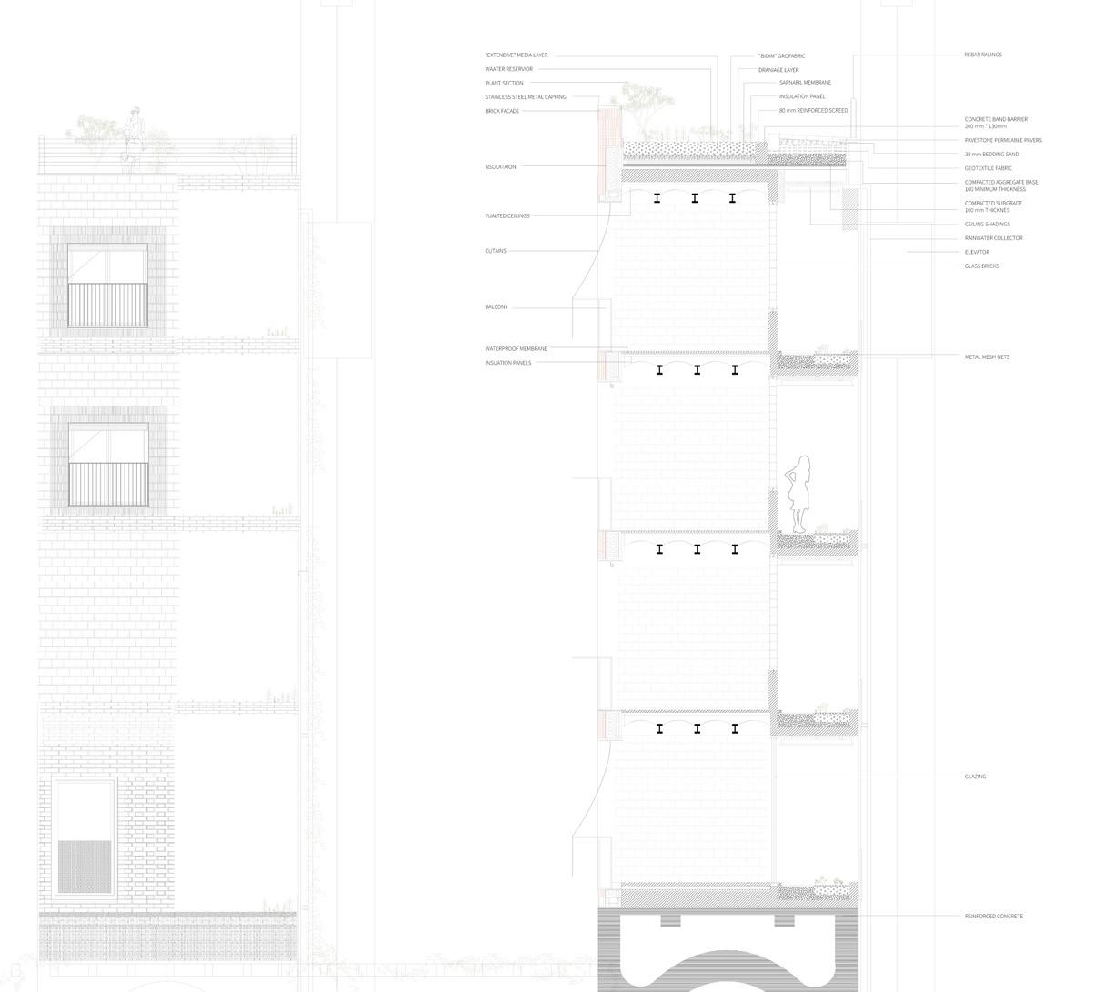Housing on the site considers the question of how can one experience infrastructure, recognize the relationship between their water consumption and their way of life, and form an immediate connection with the natural processes of climate and weather in a life among the clouds? First, an infrastructure of a central concrete core and a steel perimeter is constructed, then, over time, units of housing populate the space within, growing upward and outward to meet housing demand and growing the city slowly. Connected by a web of water pipes and cisterns, the infrastructure that supports life is made visible. The void space not built upon becomes vegetated community terrace gardens that retain water, and promote social interaction for the adjacent residents. Textile "atrapanubes" screens pattern the facade fracturing the massing in elevation and capturing condensation from clouds to slowly release rainwater while also shielding from harsh southern sun exposure.