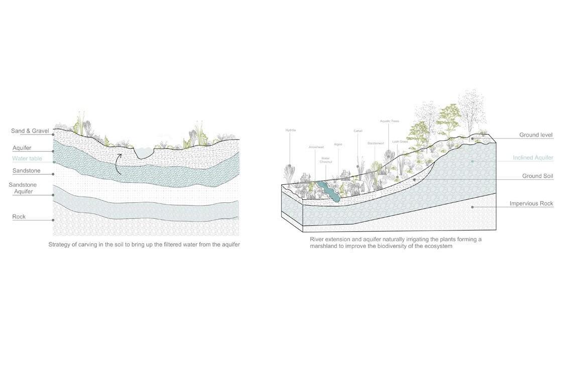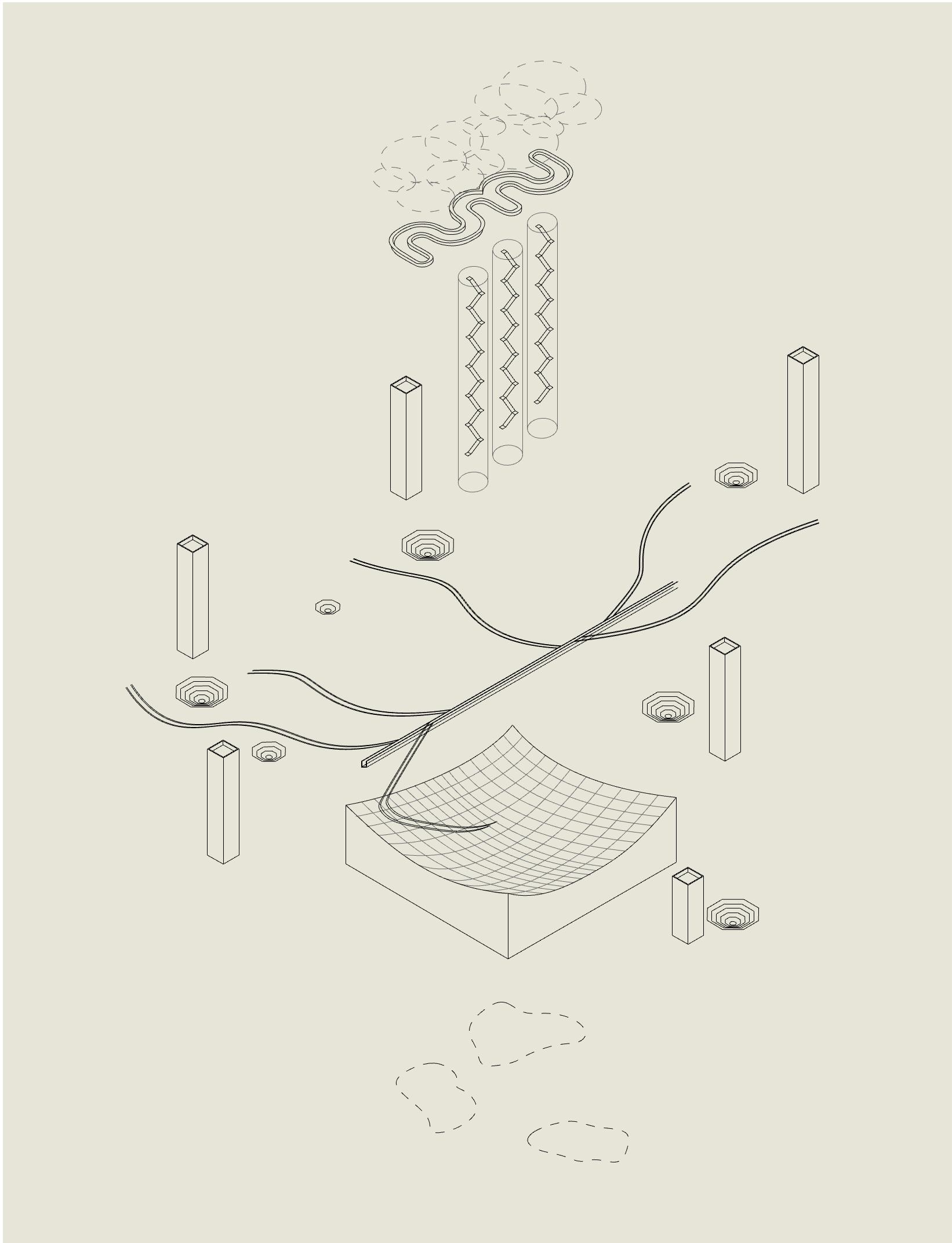 How can a monument be anchored in its periphery? How can a site system that has been emptied and abandoned be transformed to meet its most pressing contemporary challenges? This project proposes anchoring the monument of the three chimneys in its periphery through a reorganization of the site as a system of the capture, management, and experience of water.