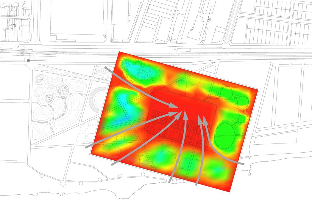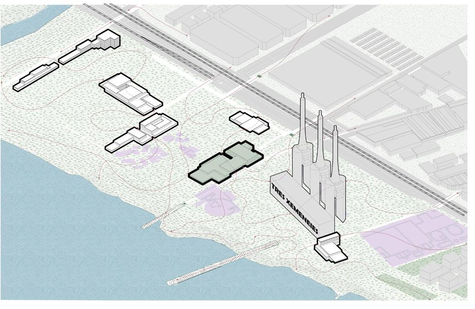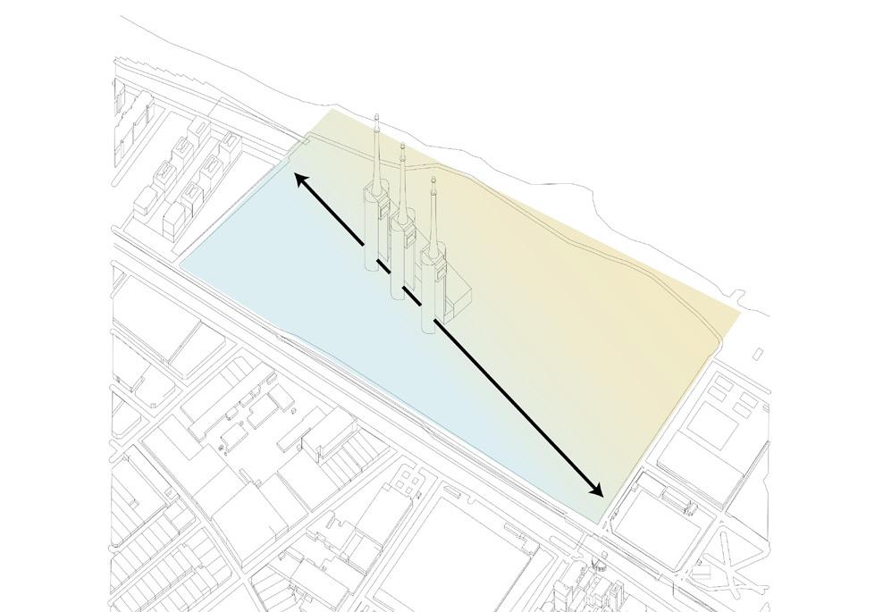 Rather than expanding the footpring of the chimneys, the chimneys are thought of as an infrastructural framework within which smaller spaces are created, inviting the encroachment of the natural context as a 'third landscape' of limited maintenance. Here enclosed market spaces combine with sunlit vegetation, the ruins of concrete industry, the sea air, and a monumental channel of water as the center of infrastructure, culture, and urban life.