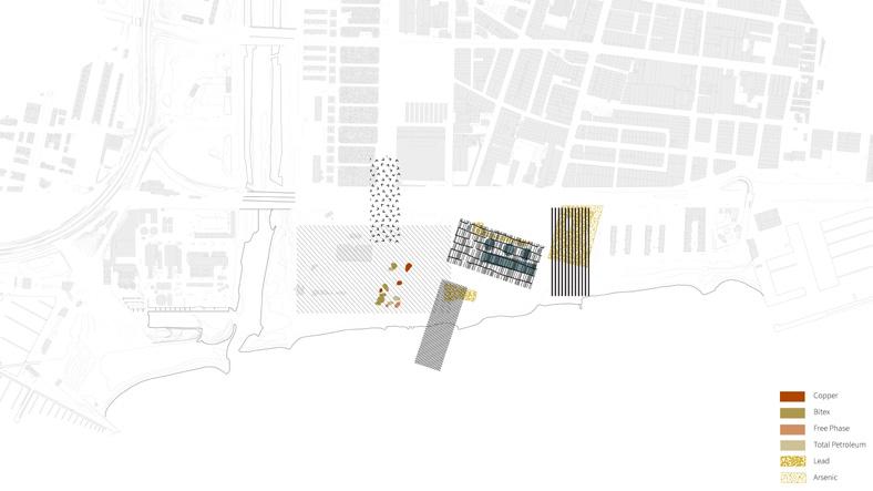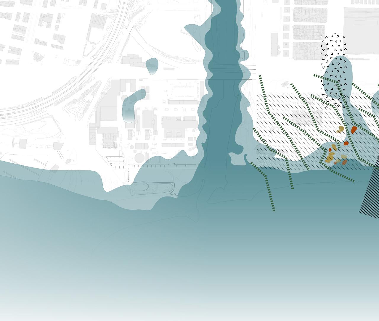 Working with the topography, the site slopes toward the chimneys, collecting rainwater in public cistern plazas and slowly releasing water in channels to travel across the site to the chimneys where it is treated and reused. In these public spaces water becomes an urban catalyst of community, a nucleus around which urban life is organized. By concentrating housing and infrastructure in these nuclei, the majority of the site remains a low-maintenance managed landscape reserve where the land can serve productive needs of phytoremediation, biodiversity habitat, and carbon sequestration through agriculture and forestry.