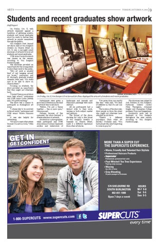 Students and recent graduates show artwork Staff Report On Friday, Oct. 8, with artwork displayed against a backdrop of glittering jewelry, students and recent graduates stood by, ready to discuss their artwork as people meandered through the gallery. Von Bargen’s First Annual Art Show, held at Von Bargen’s Jewelry on Church Street on Oct. 8, was a onenight juried showcase of artwork by local art students and recent graduates. UVM alum Curran Broderick was chosen as the winner, according to Von Bargen’s Facebook page. The showcase provided an opportunity for the young artists to show their work to the public. “[My art work is usually] kind of just hanging around my house,” participant and St. Michael’s graduate student Amanda Vella said. “It’s really nice to be able to show on Church Street.” Focusing on students, the show provided an opportunity that they might not otherwise have. “I haven’t been in an art show since high school,” participant and UVM junior Loren Teetelli said. “It’s pretty exciting.” The show was a chance to participate in Burlington’s art scene. “I always like to be involved in the art world,” participant and UVM senior Violeta Hinojosa said. It was also helpful for networking. “It’s nice to meet other artists because I’m new in town,” Vella said.