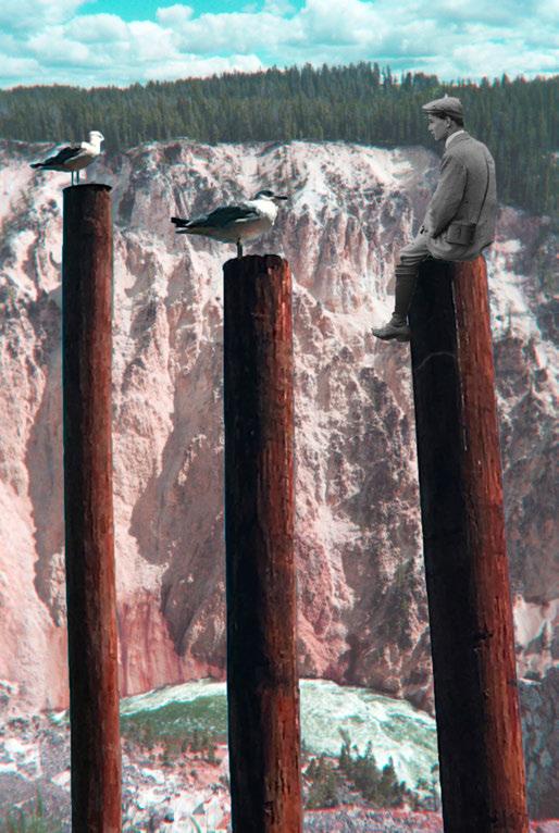 This piece explores the relationship we have to animals in a world that is uncertain. The posts place both the birds and the figure high above the river flowing between two cliffs, but both at the same level and size as one another—equals. We need to understand the landscape that we exist in, both physically and metaphorically, else we risk losing our balance.