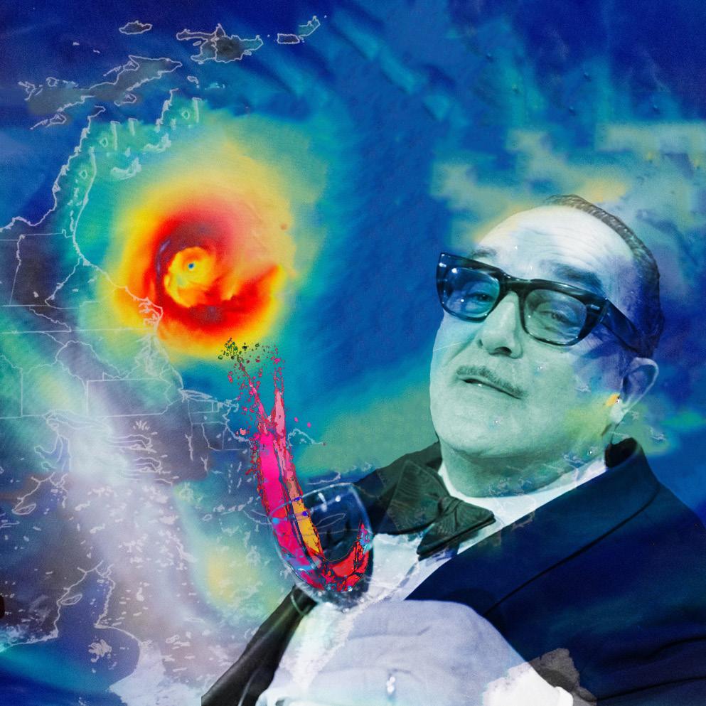 The responsibility of climate change lies with all of us, and yet there are so many who pretend not to see the gravity of its effects. The hurricane map represents the natural disasters yet to come, and the man shows the gluttony and convenience of capitalism. This piece shows the carelessness that we as humans need to take responsibility for in order to affect change.