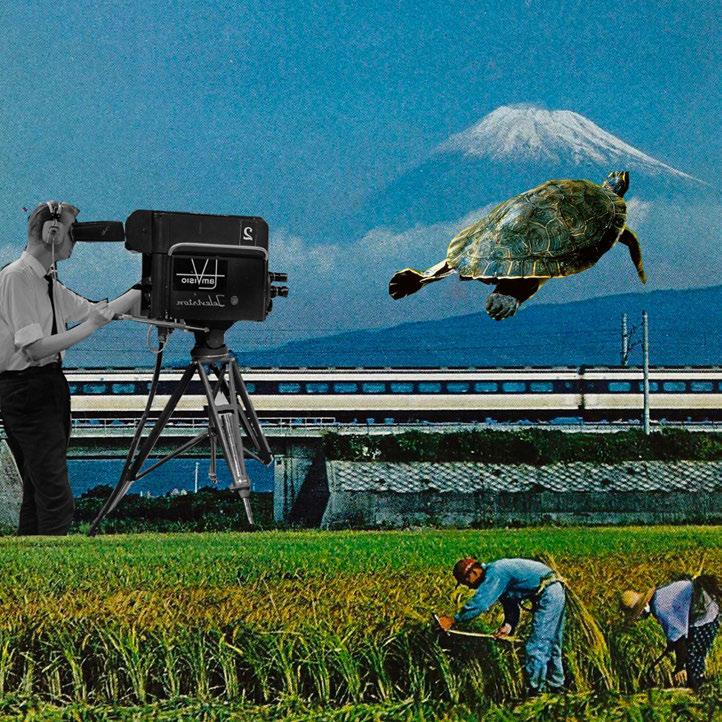 This piece portrays the bizarre relationship that society has with the natural world. The person filming the turtle floating towards Mt. Fuji represents the ways that we record ‘the strange.’ This collage is an abstraction of the ways in which we exploit the beauties of the earth, while we miss out on the experience of taking it in.