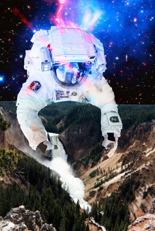 How do we fix the problems we have created? The astronaut is shown lifting the waterfall in Yellowstone National Park, a metaphor for the control we think we have over the natural world. This piece elaborates on the relationship that we have with the land and the ways in which we are looking for solutions to save the parts of the environment we cherish.