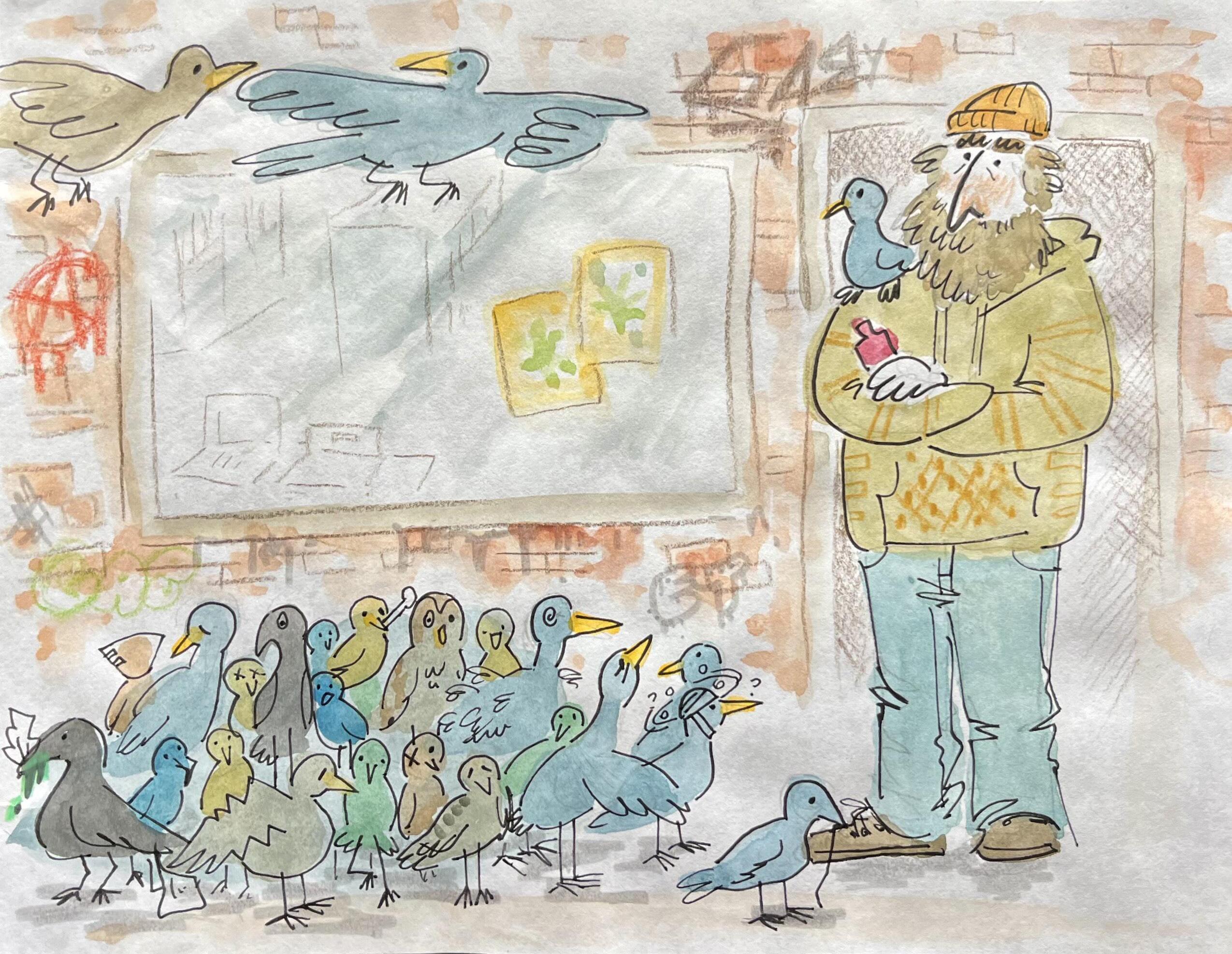 I saw a gruff man surrounded by birds on a shop porch, some even resting on his shoulder. He was standing authoritatively, hands on his hips, perhaps to let passersby know he was the owner of the establishment, but most likely to keep an eye out for signs of law enforcement. The exterior wall featured a grid of sun-bleached photographs of cannabis, serving as a catalog for customers. I had recently taken up the hobby of birding, so I felt I needed to know why the birds surrounded him. But by the time I gained the confidence to approach him, he and his avian companions were gone.