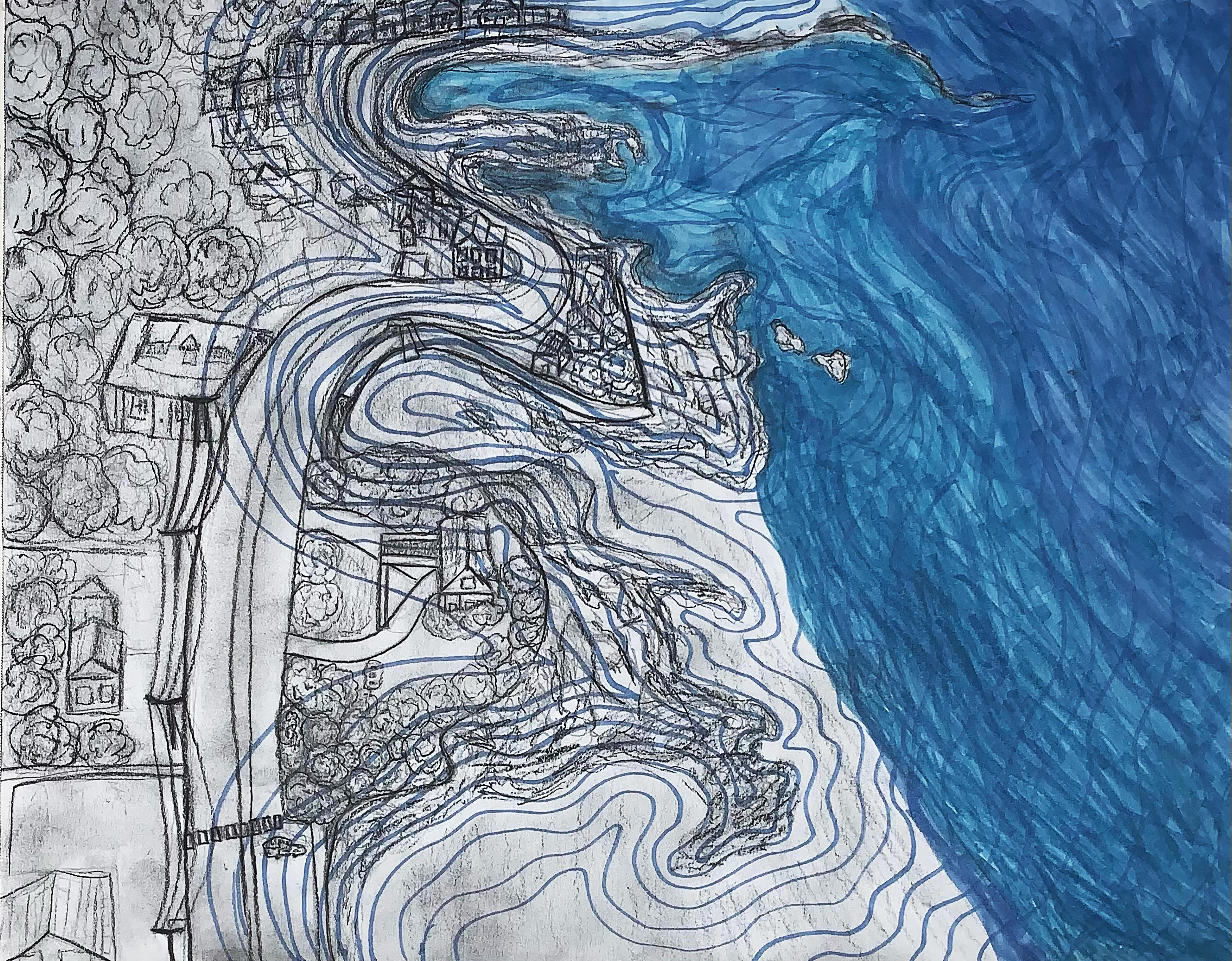 The subject of this piece is Lake Michigan, a place close to my heart and where I grew up. For this piece, I wanted to show how different two sides of the same lake can be and communicate how we must protect our lakeshores from the pollution of the cities. Looking across the lake from Sleeping Bear Dunes in Michigan, you can see the haze rising off of the cities, threatening to poison the natural landscapes nearby.