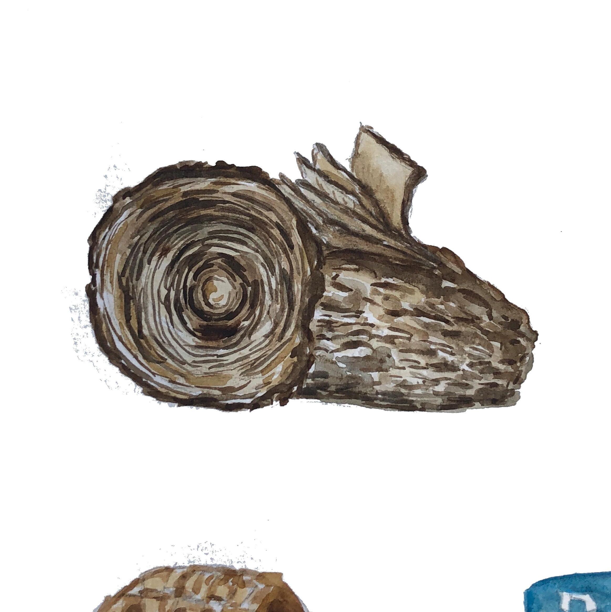 Sherry Gould describes how ash and sweetgrass “are two materials that complement each other really well. They both smell really nice, they’re really wonderful to work with, and in the end, you have a beautiful basket— something people treasure and use.” In basket making, the brown ash wood is removed from its bark, and the logs are pounded to split the tree rings, which are then prepared for basket weaving.
