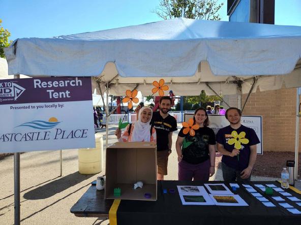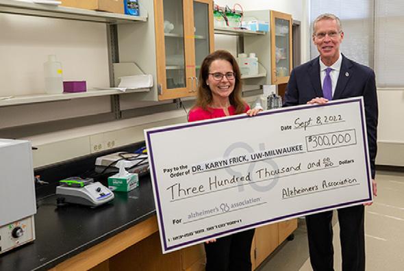 UWM distinguished professor of psychology Karyn Frick received a sizeable grant from the Alzheimer’s Association (see Page 9) to support her research into therapies to treat this disease. To share her research with the community, Frick’s graduate students, including Miranda Schwabe and Aaron Fleischer (on the right), who have been directly involved in this research, staffed a tent at the 2022 Milwaukee Walk to End Alzheimer’s on Sept. 18.