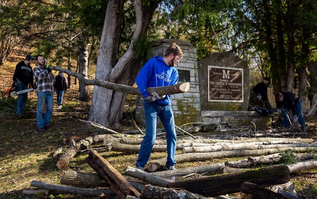 The effort unfolded in phases. In fall 2023, Klefstad and a small group tackled the left side of the “M”. A year later, the second phase drew more than 70 volunteers in November 2024 to clear brush and trees on the right side, including 50 SAE students and 20 supporters from the broader Platteville community.